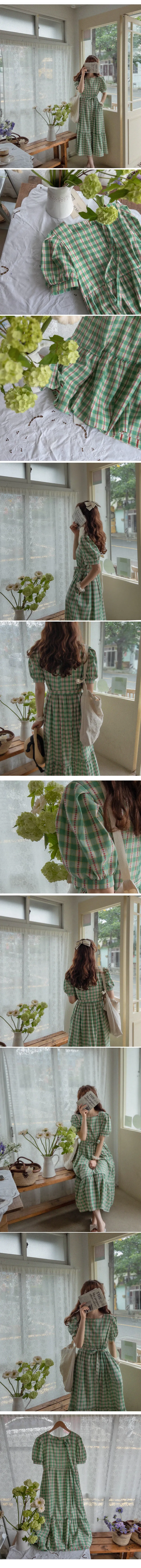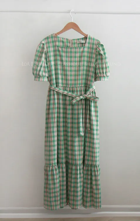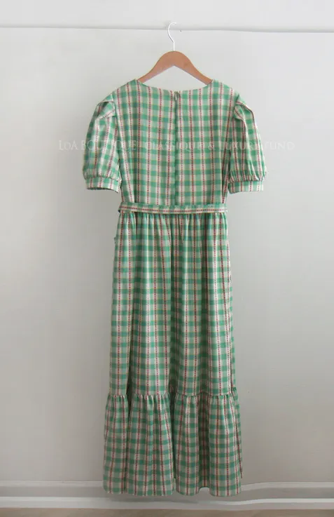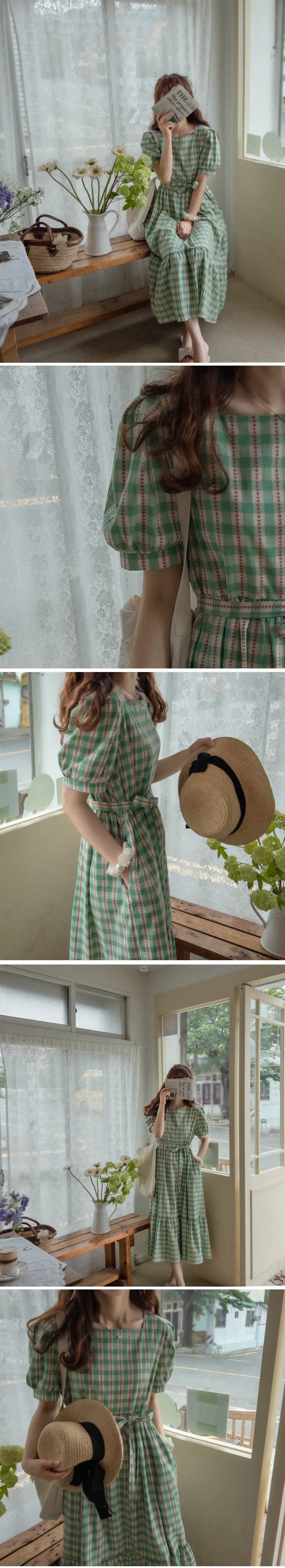 清新格紋迷你緹花泡泡袖附腰帶連身裙