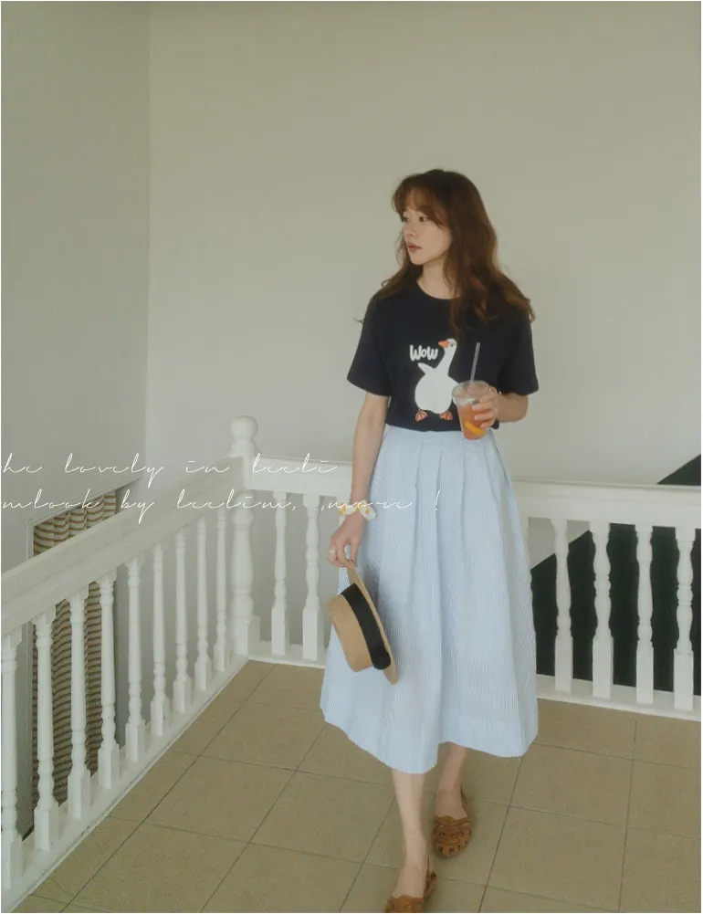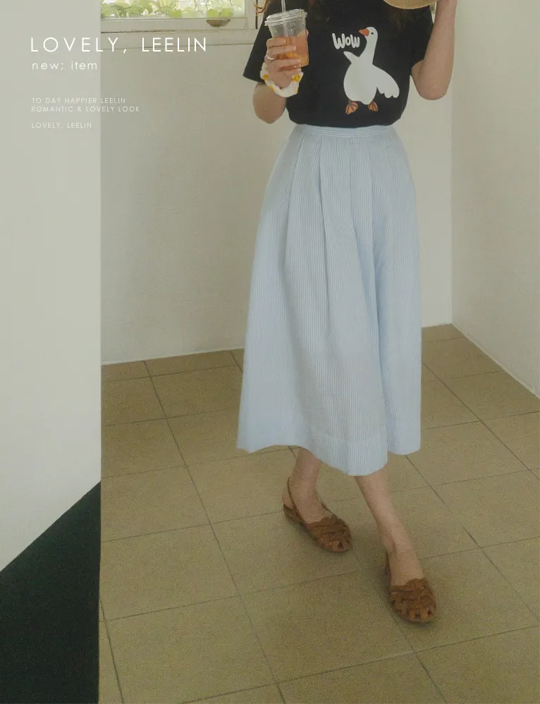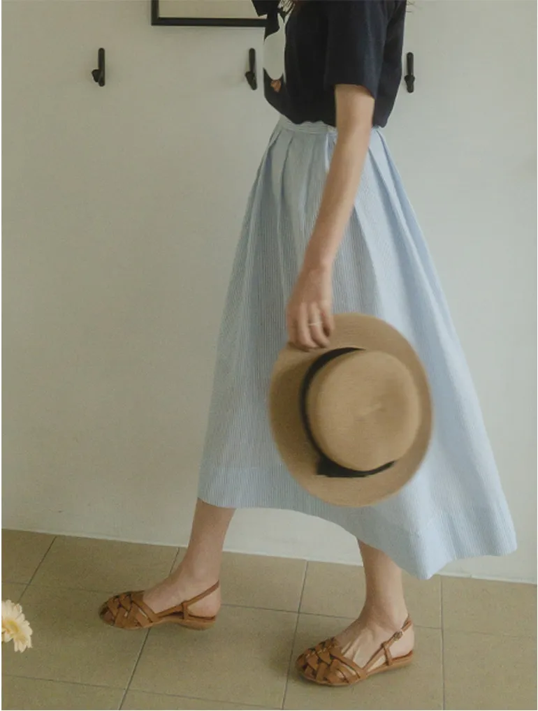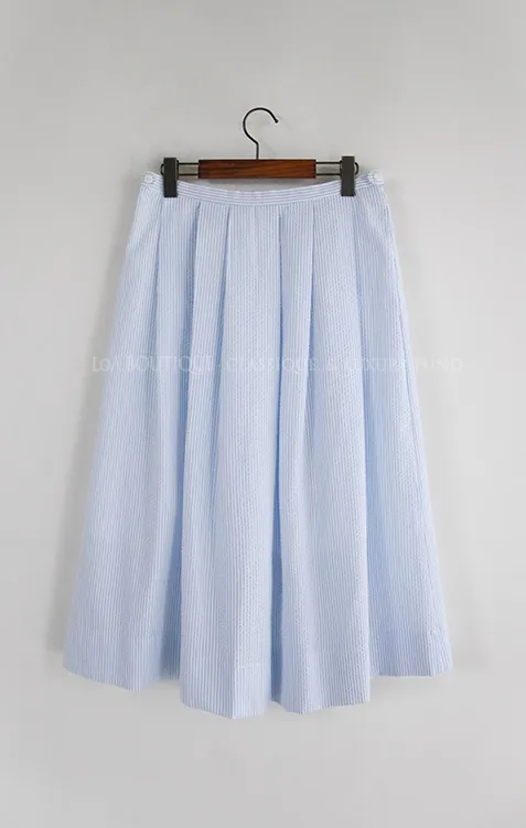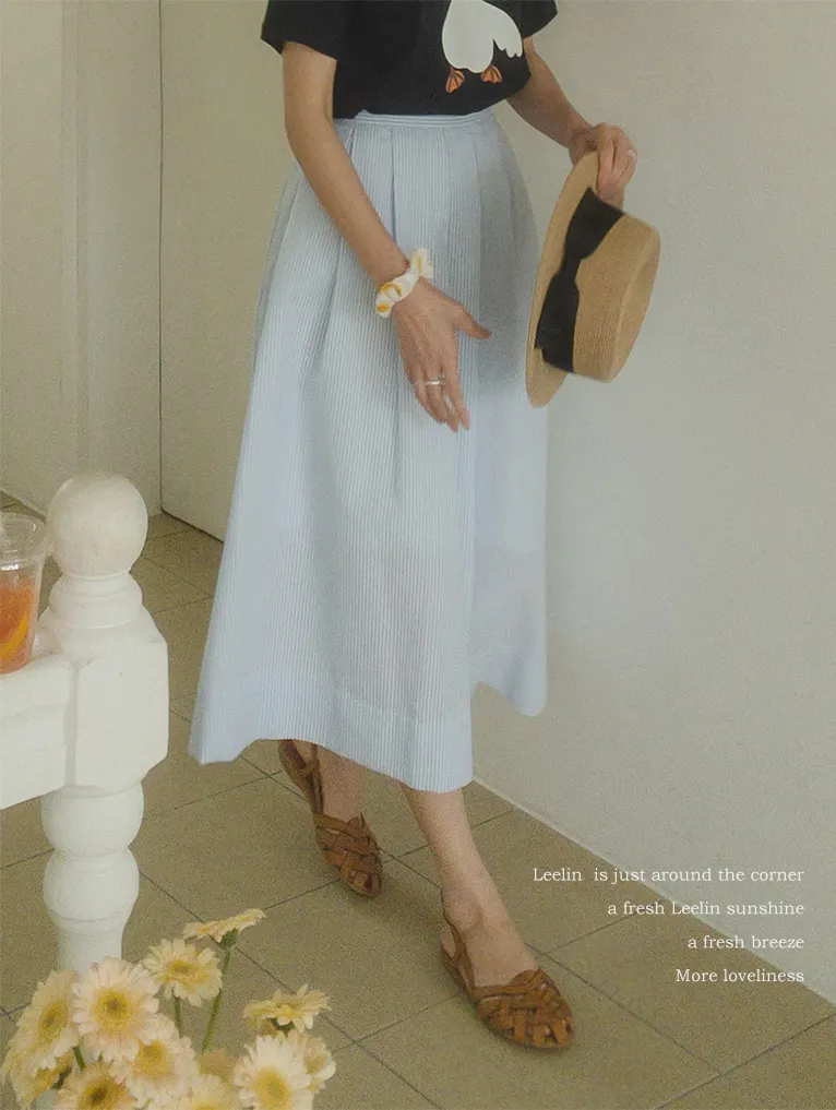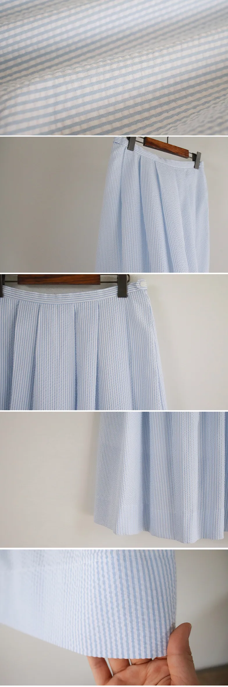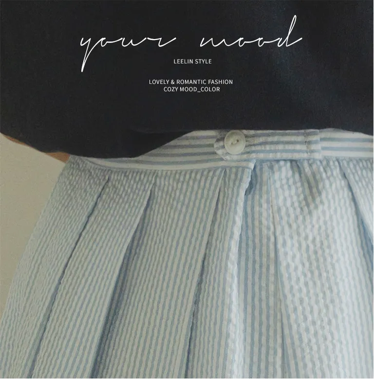 清新條紋腰帶鈕扣細摺泡泡紗中長裙