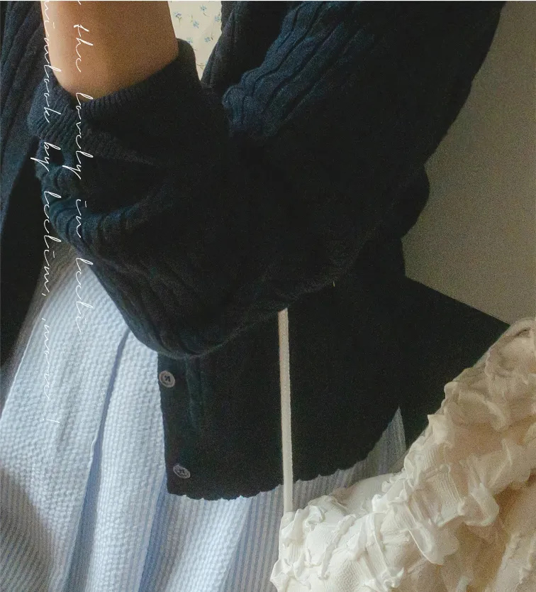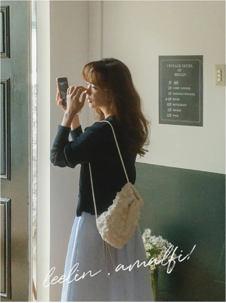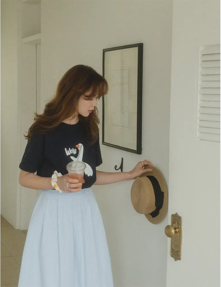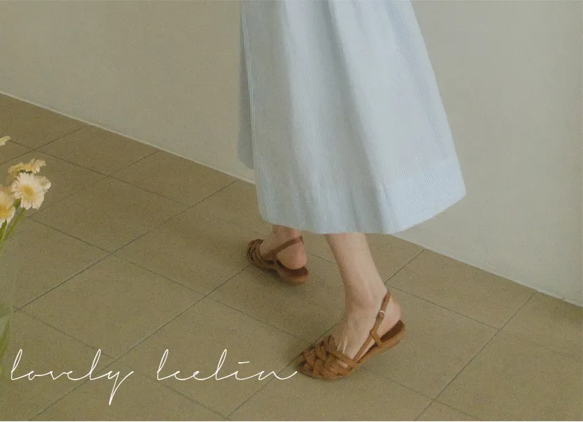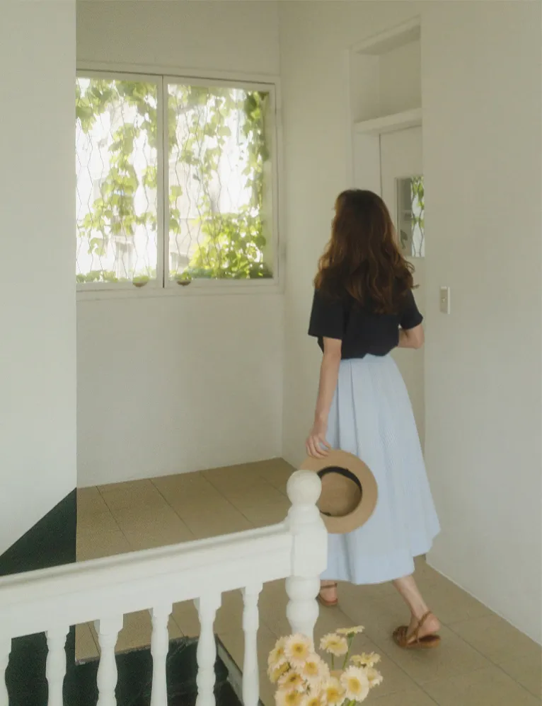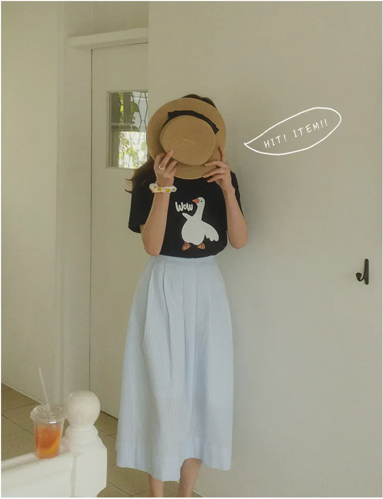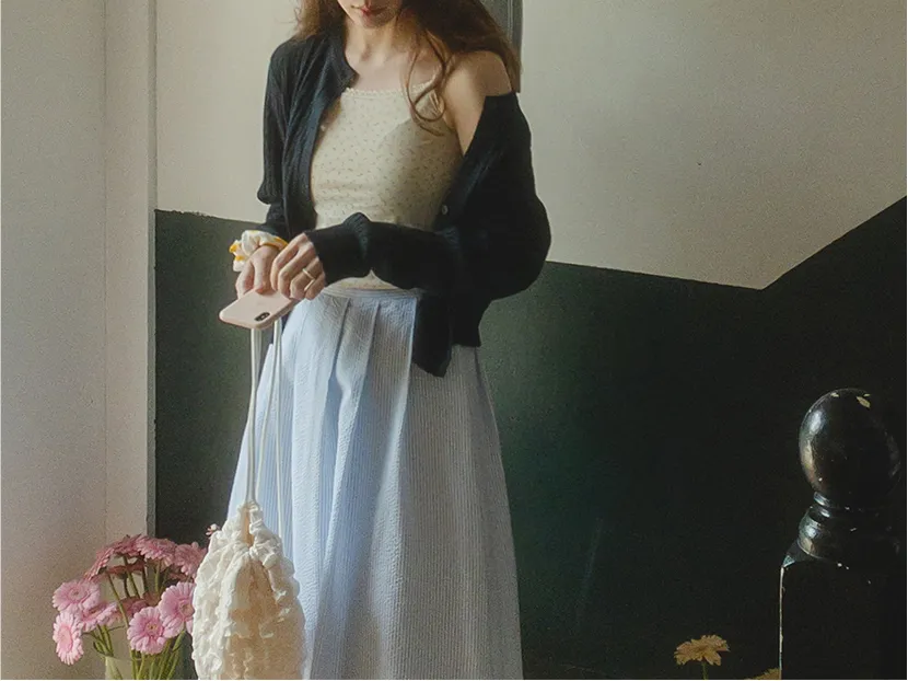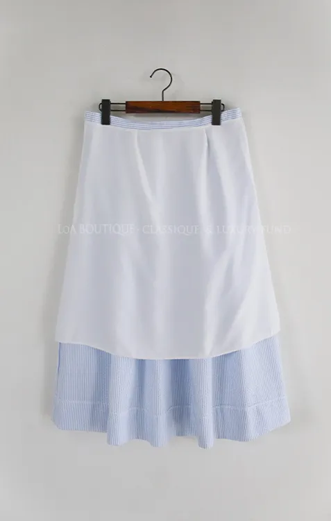 清新條紋腰帶鈕扣細摺泡泡紗中長裙