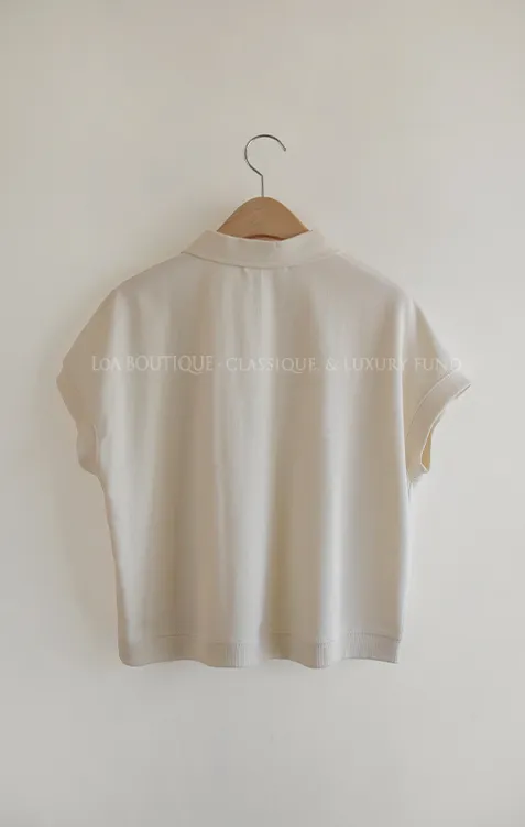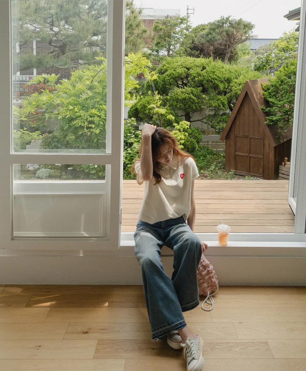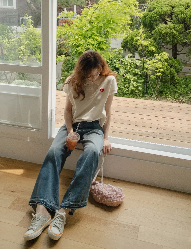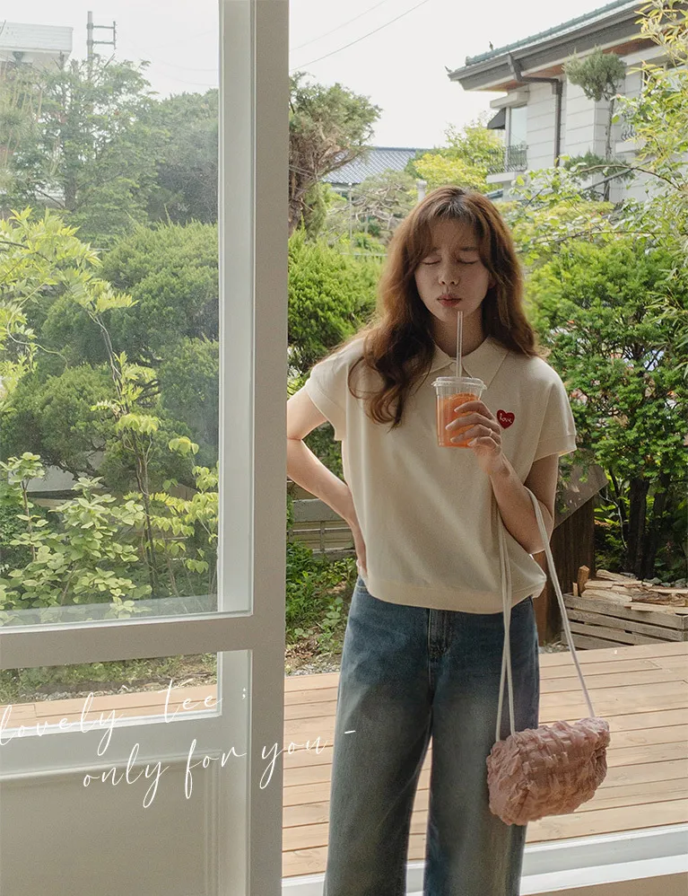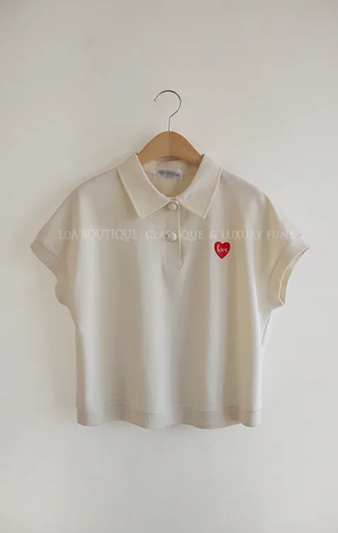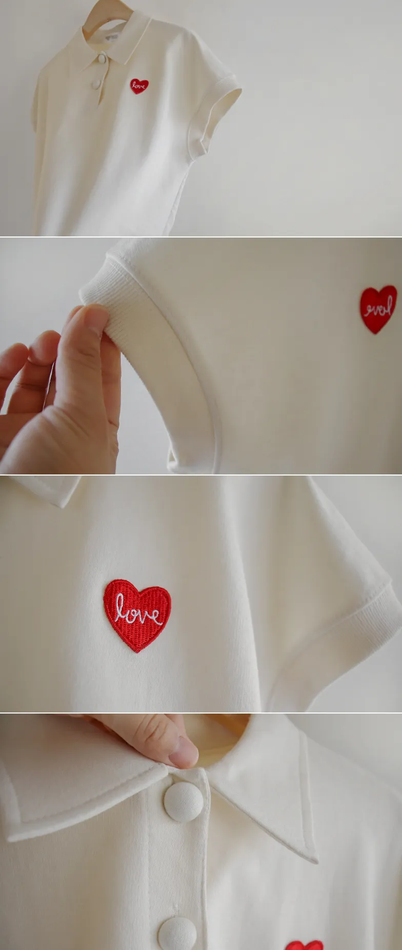 可愛心形LOVE字母刺繡圓扣翻領上衣 奶油色