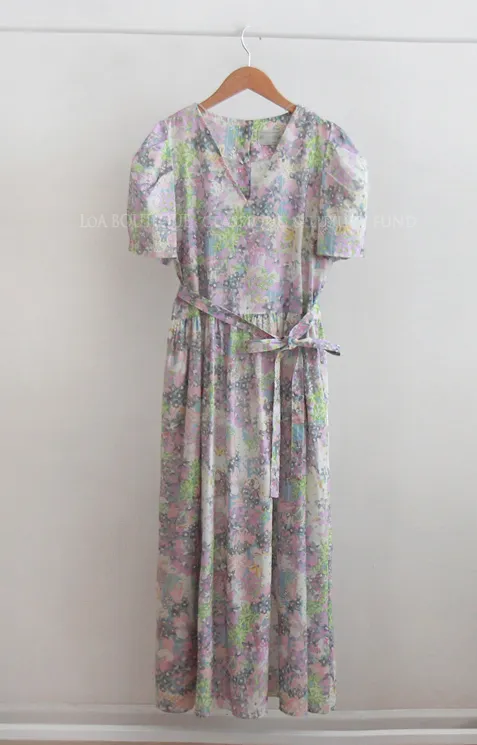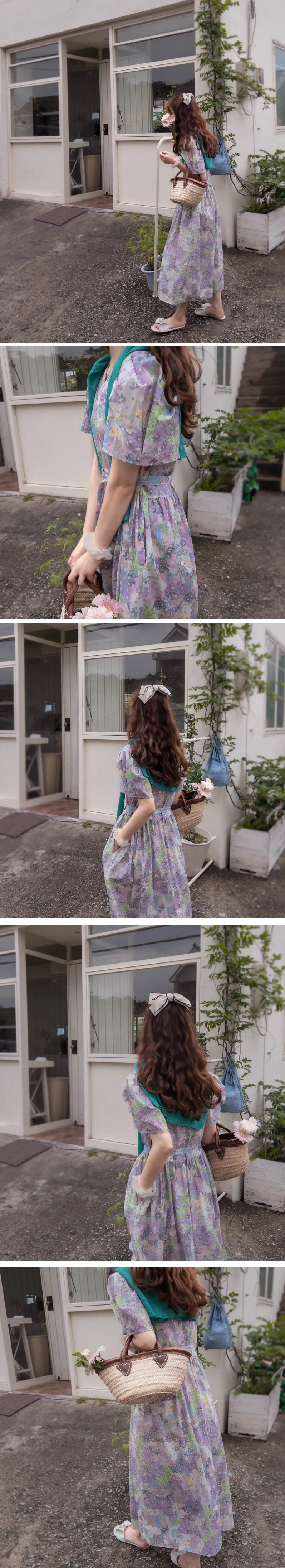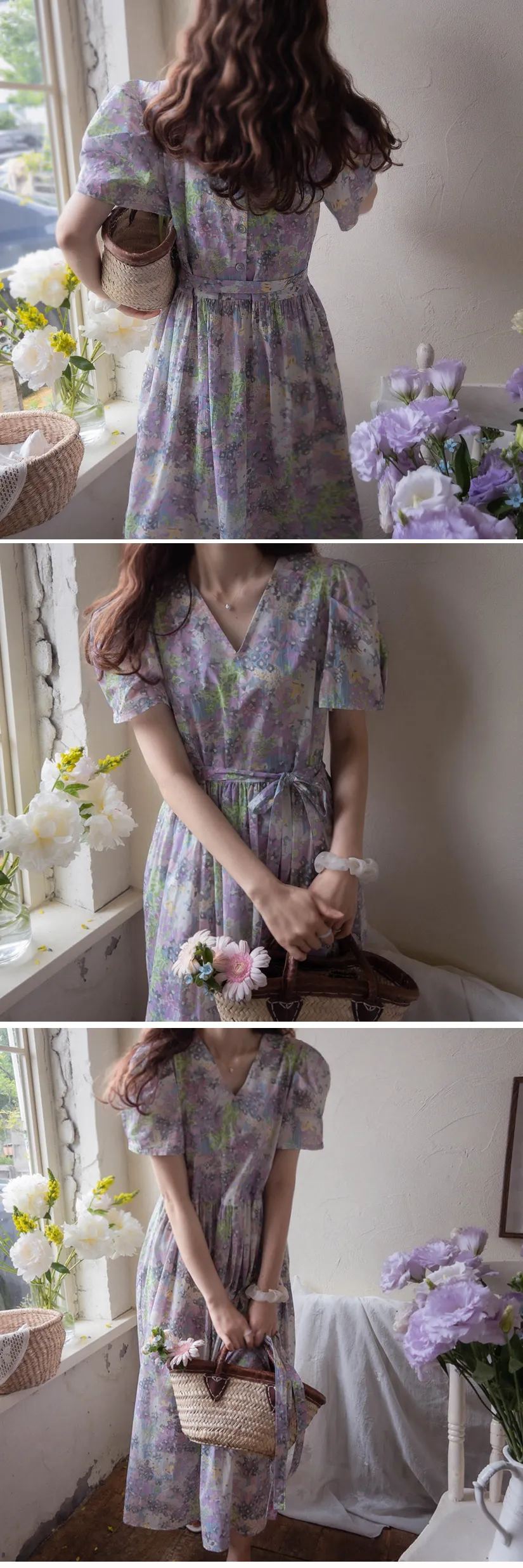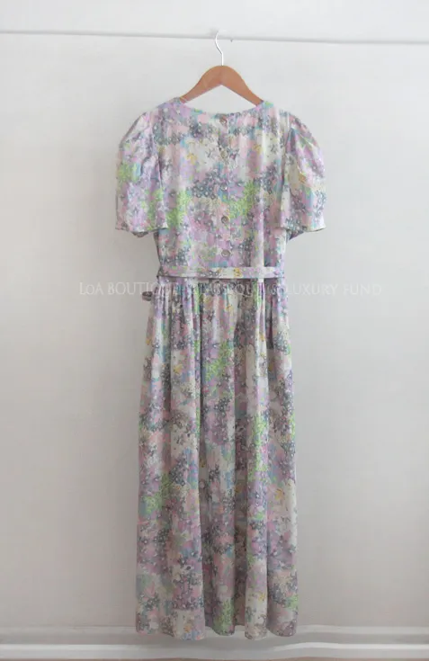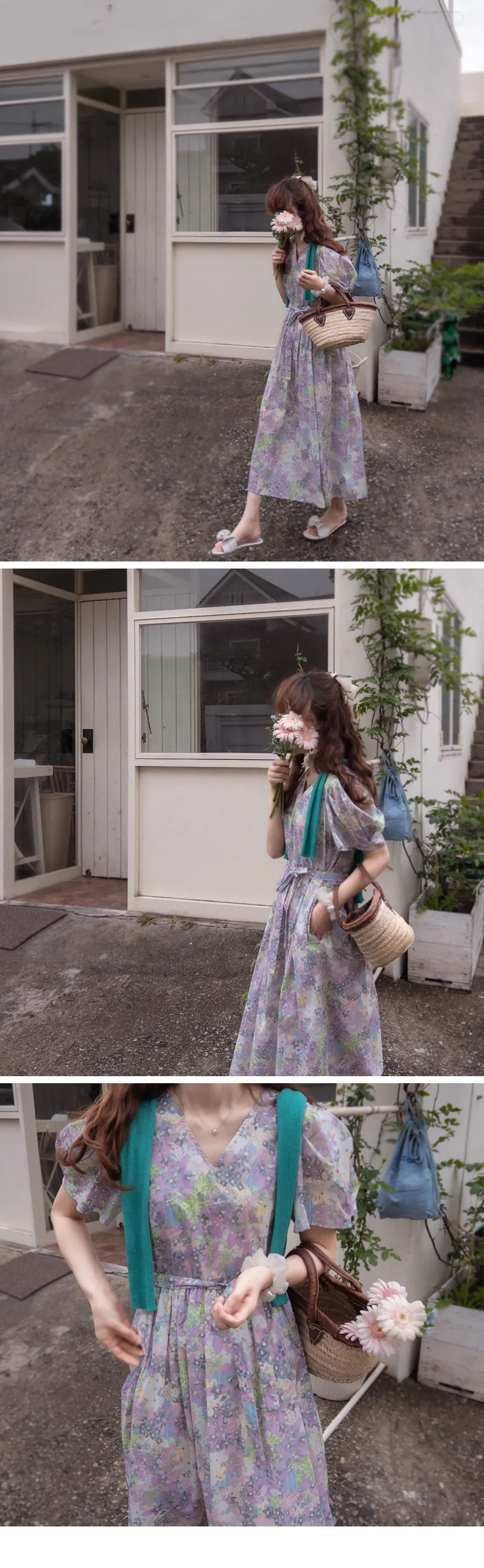 柔美花朵後扣附腰帶泡泡袖修身連身裙