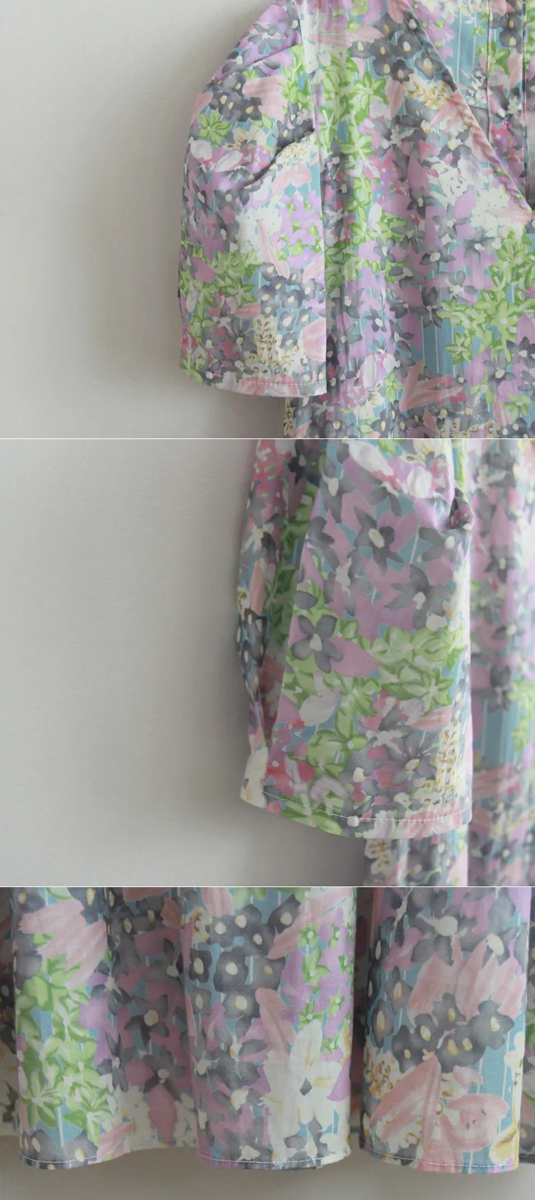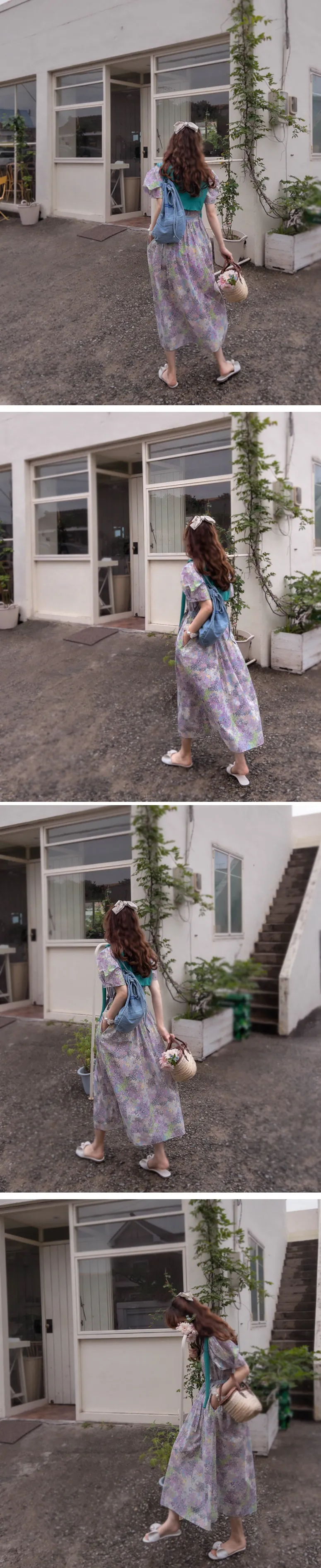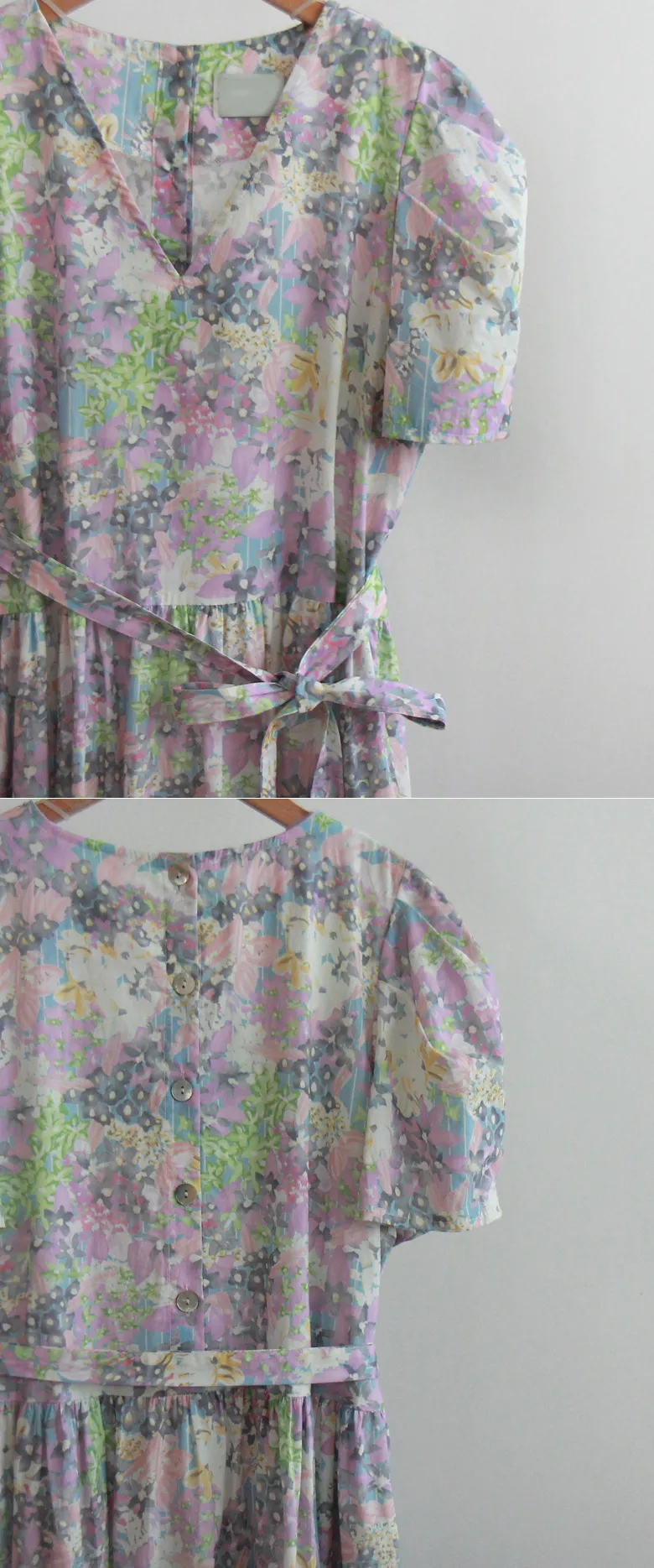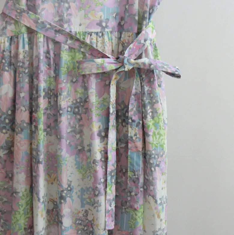 柔美花朵後扣附腰帶泡泡袖修身連身裙