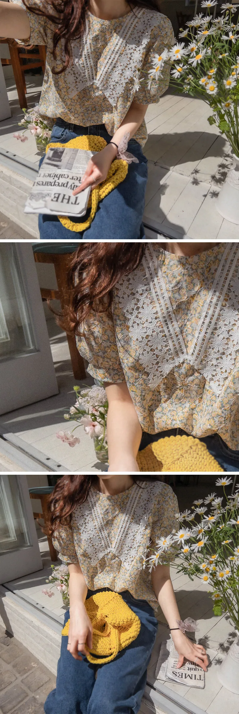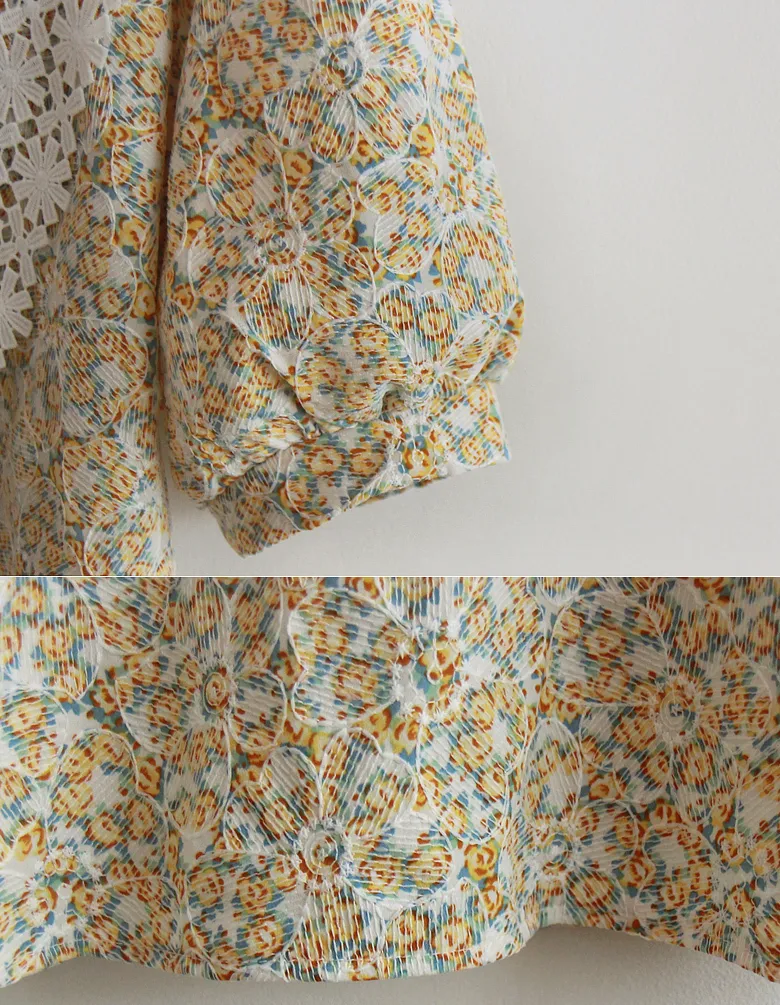 漂亮色彩刺繡花朵V領蕾絲飾邊上衣 黃色款