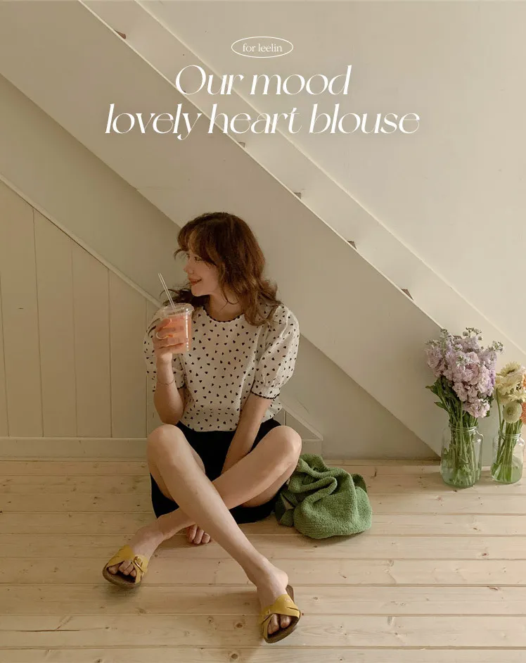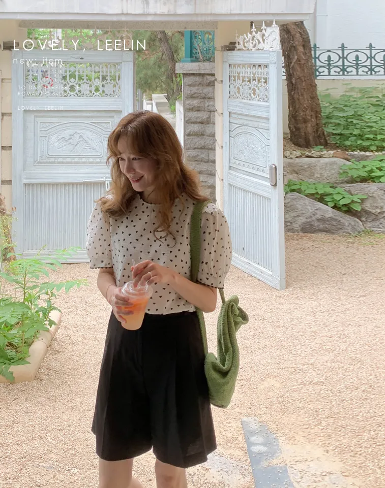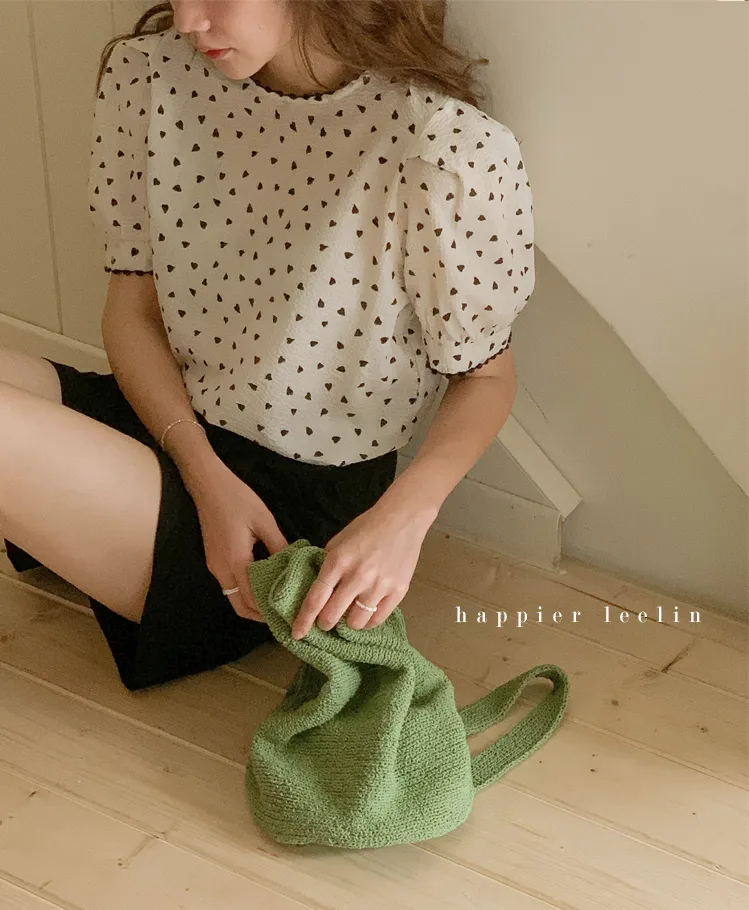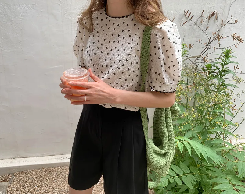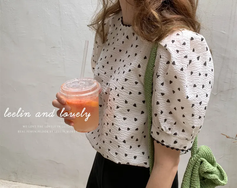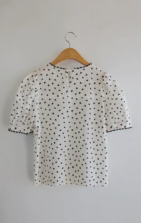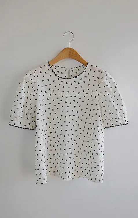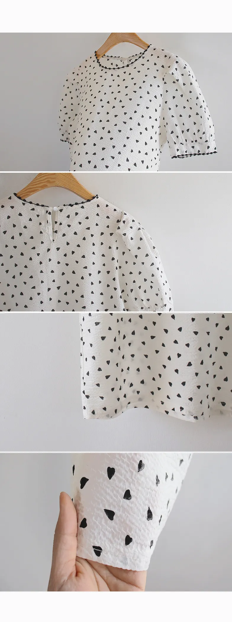 可愛領口袖末刺繡肩部細褶泡泡紗愛心上衣