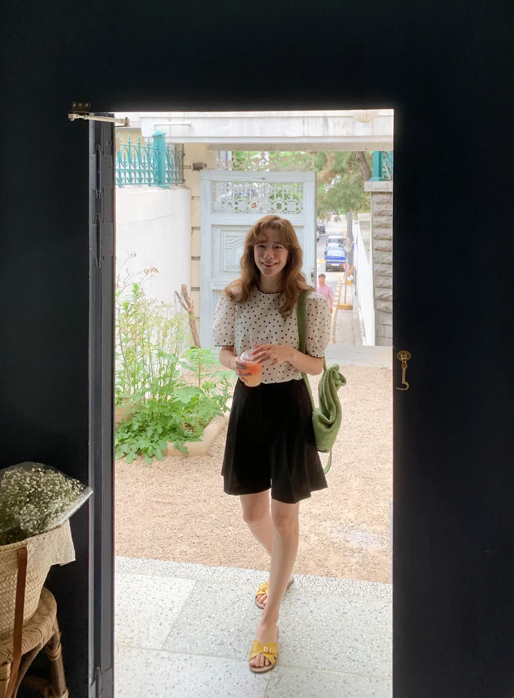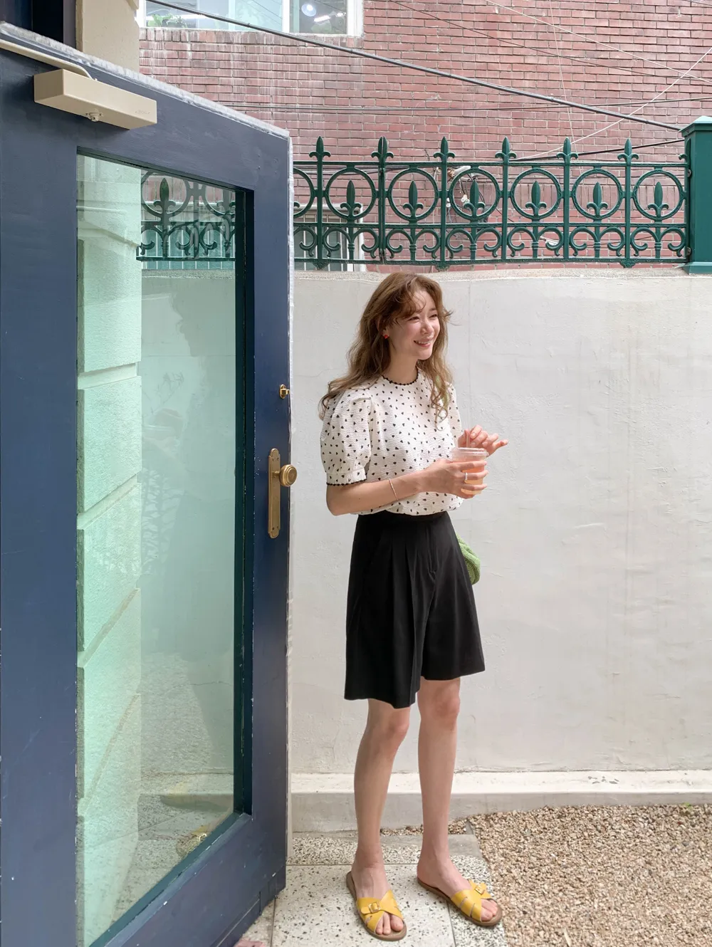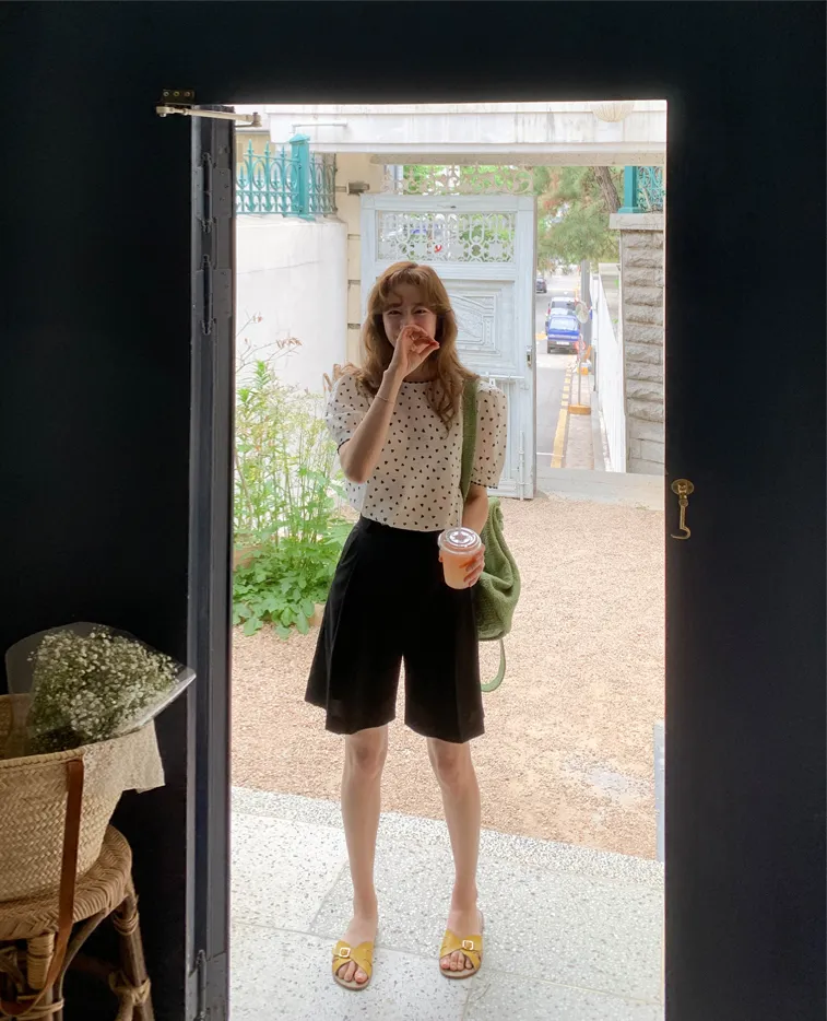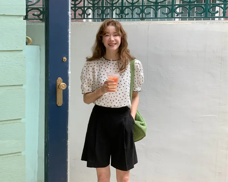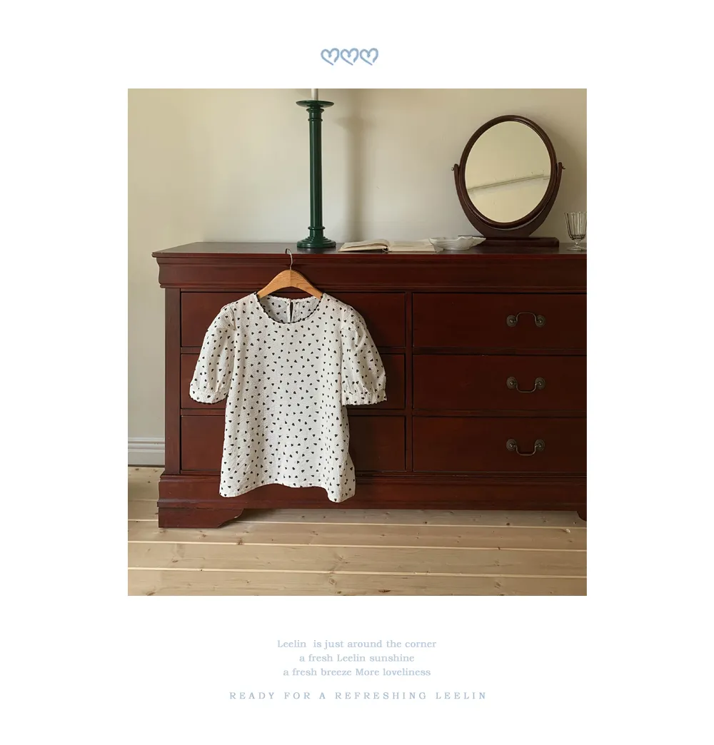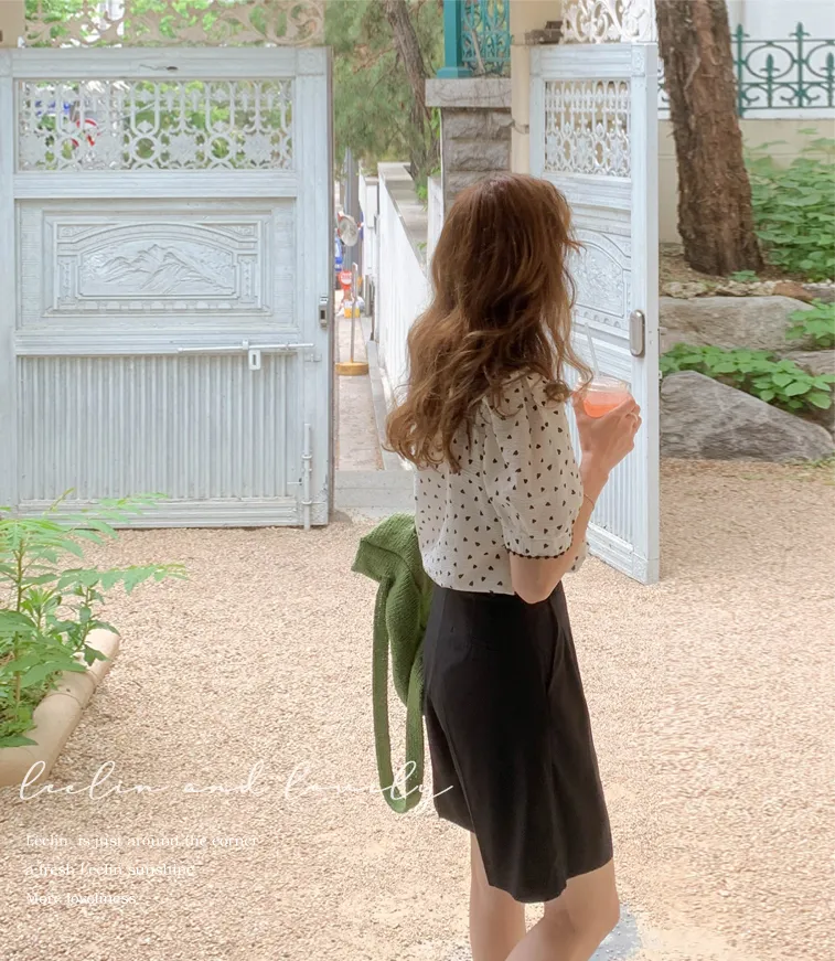 可愛領口袖末刺繡肩部細褶泡泡紗愛心上衣