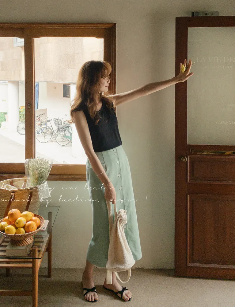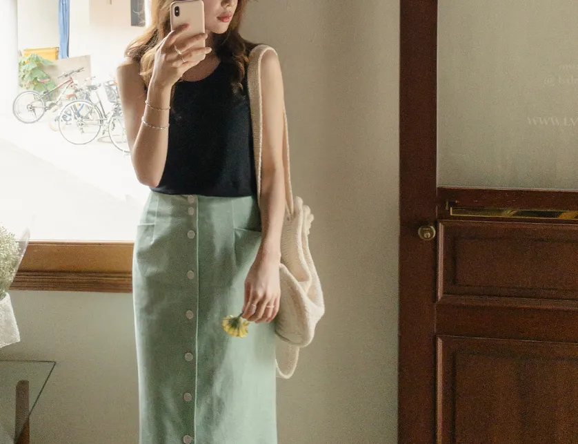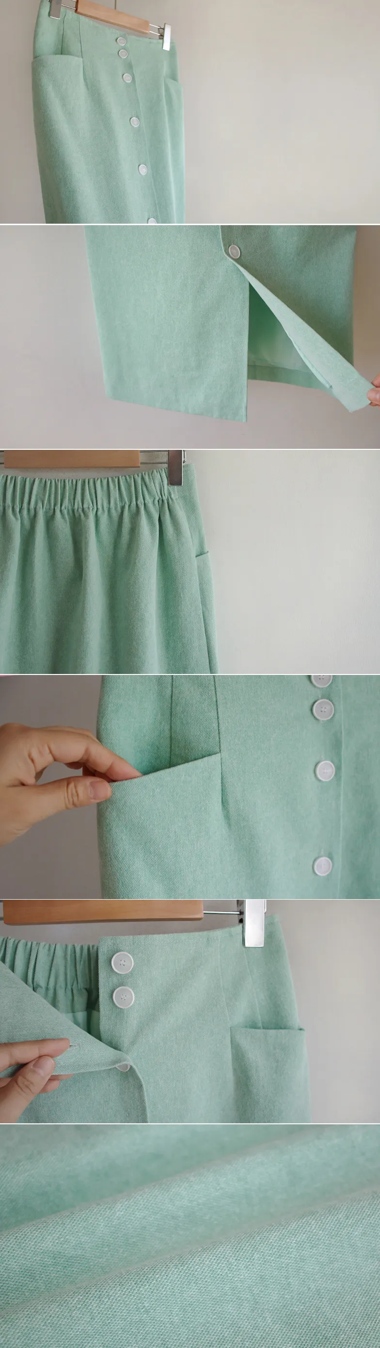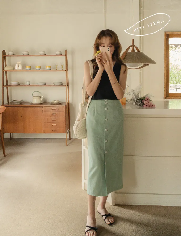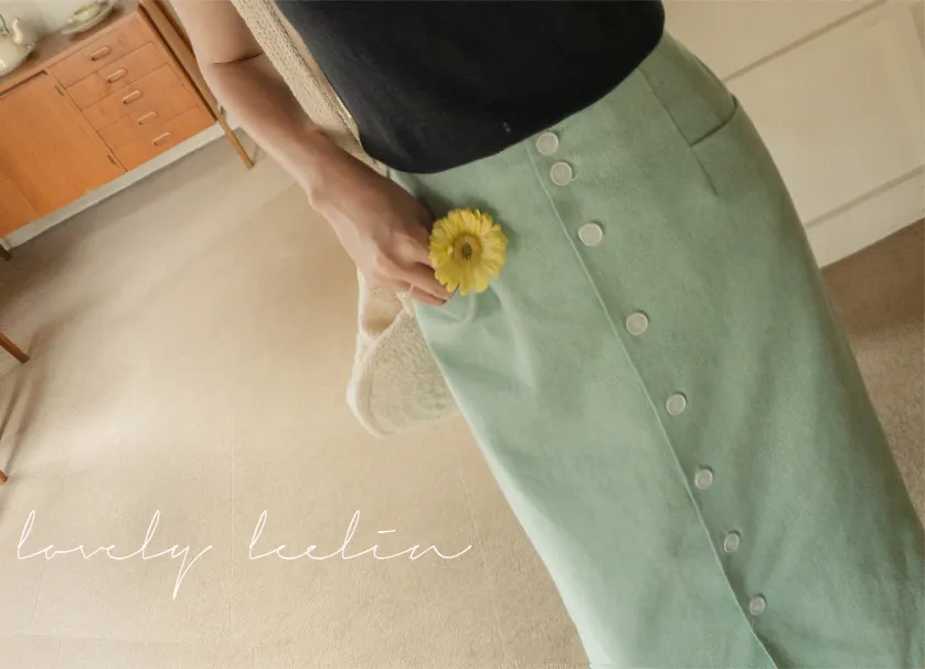 柔和色彩感精緻排扣設計直筒修身中長裙 薄荷色