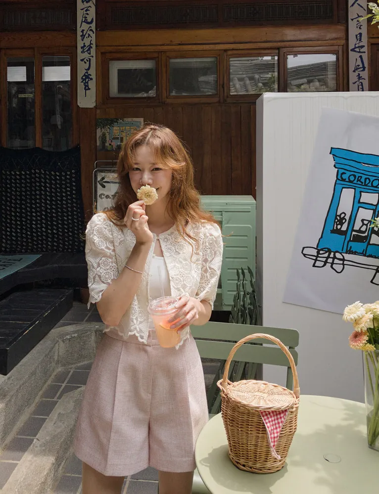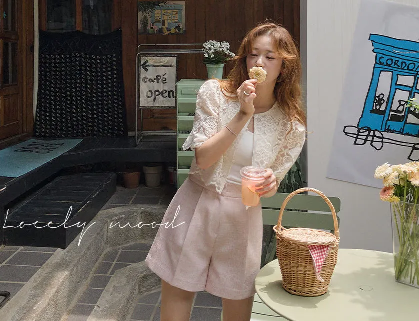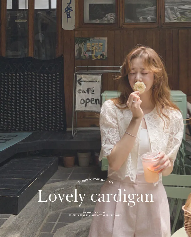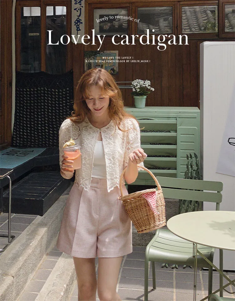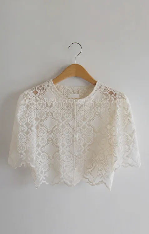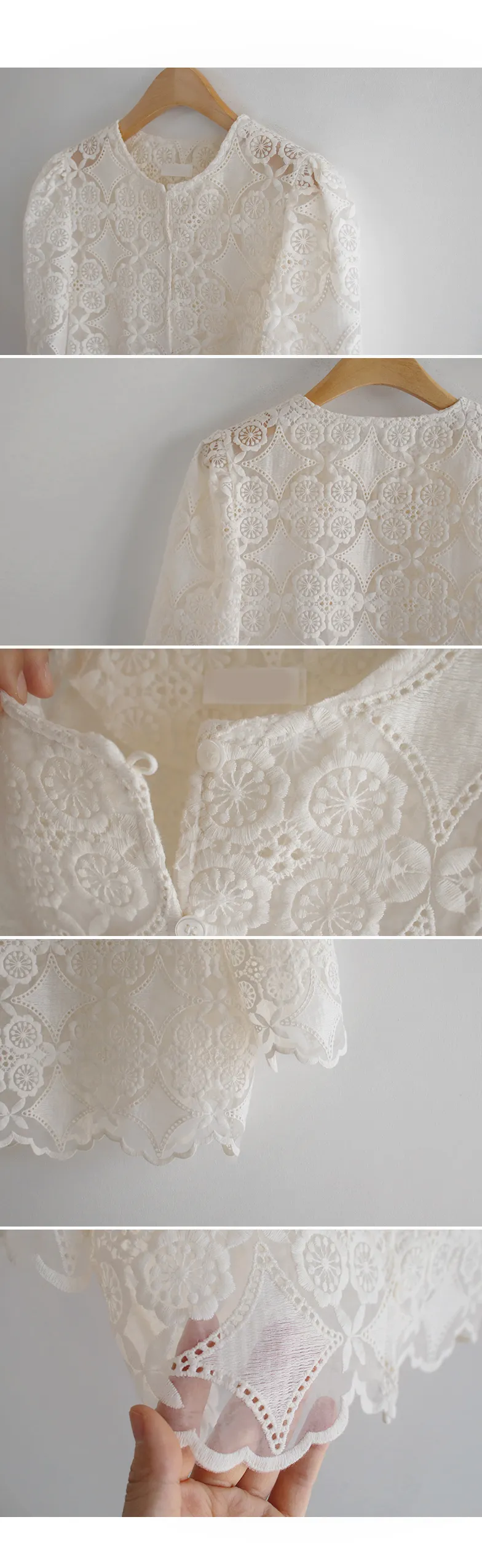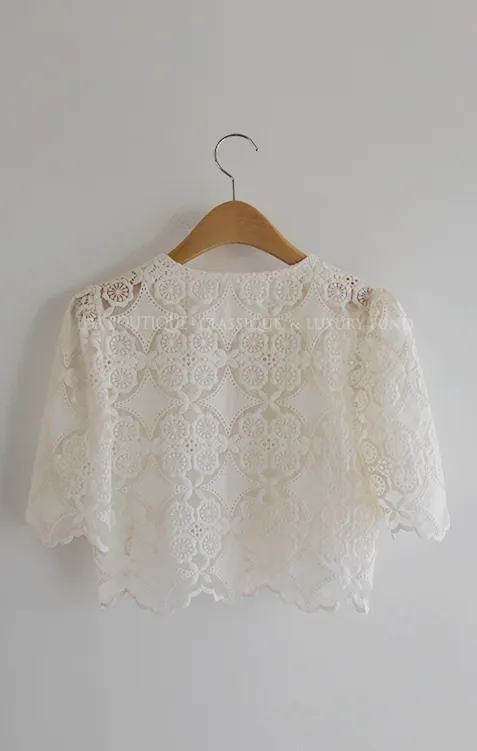 優雅蕾絲緹花刺繡波浪下擺短袖開衫
