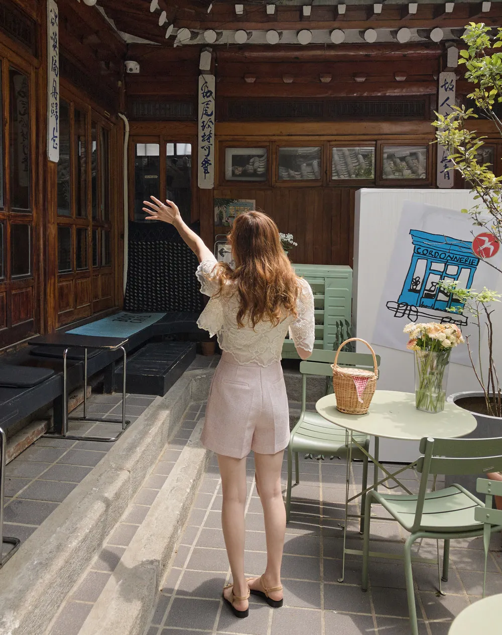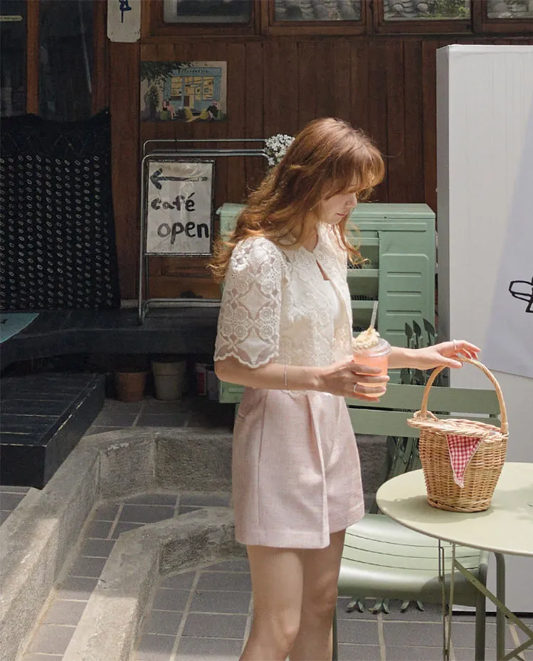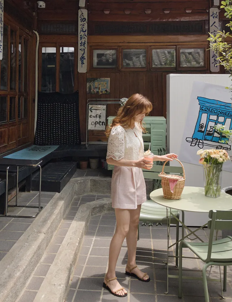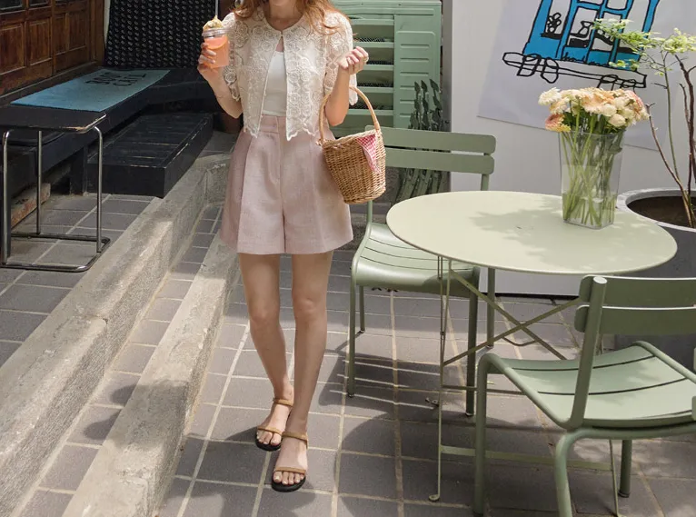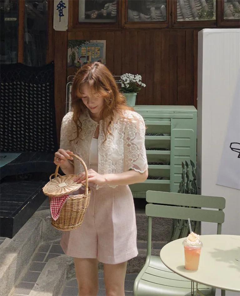 優雅蕾絲緹花刺繡波浪下擺短袖開衫