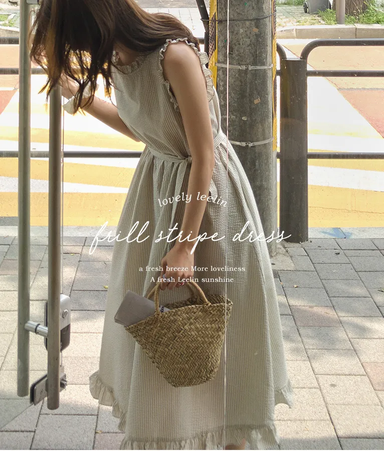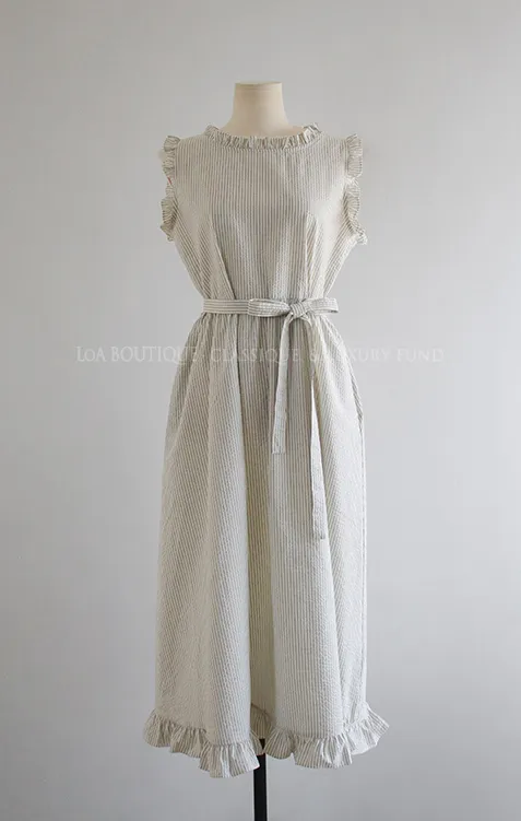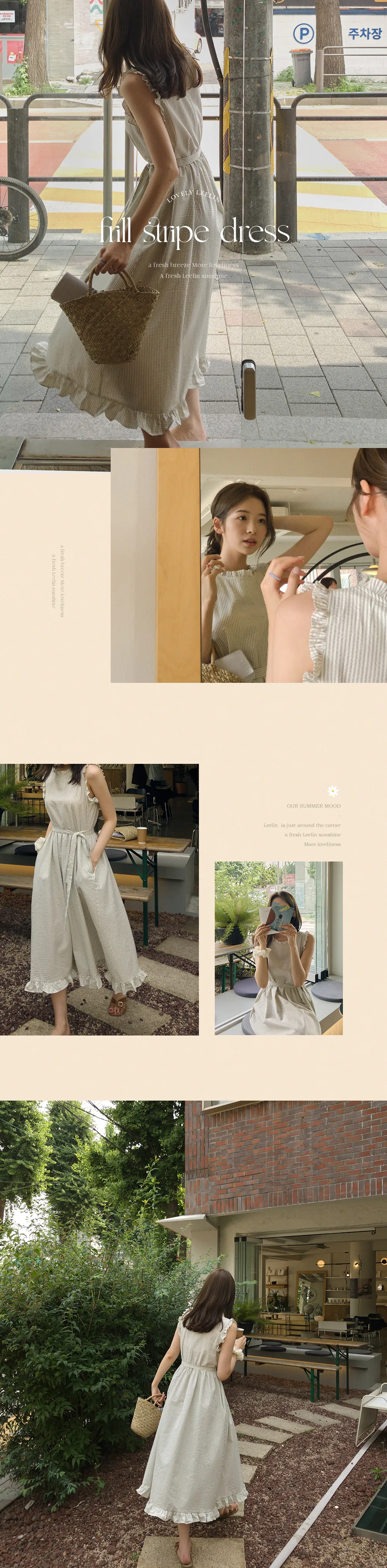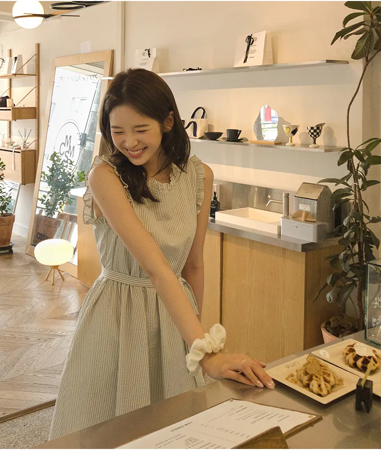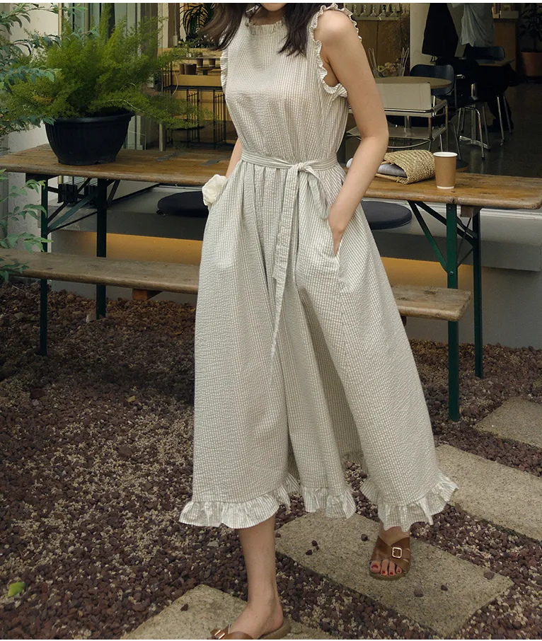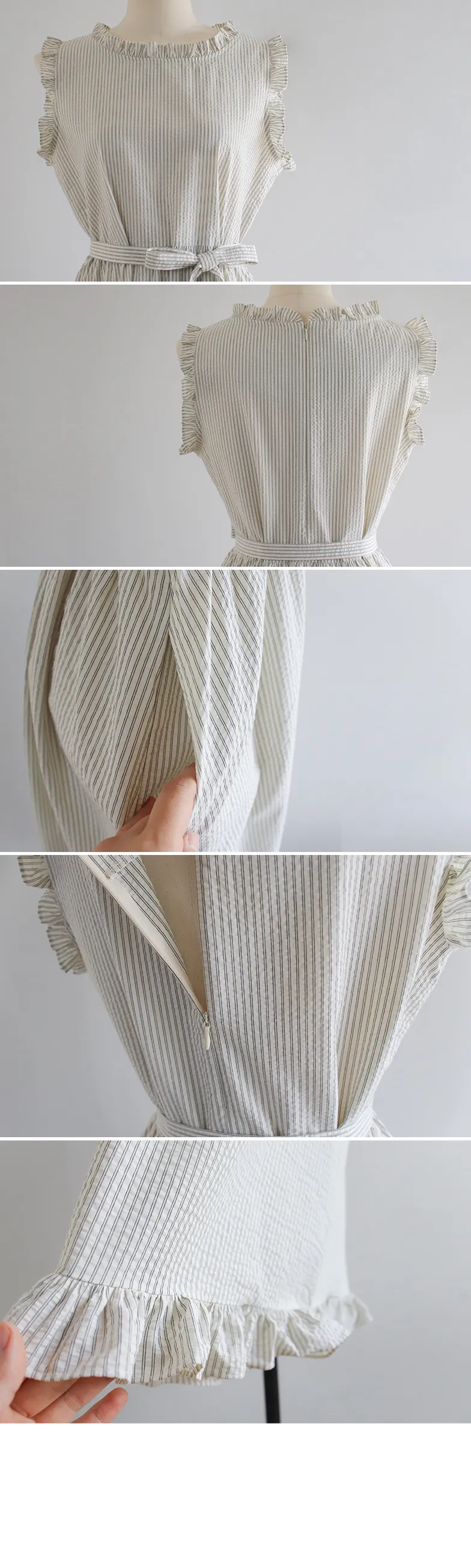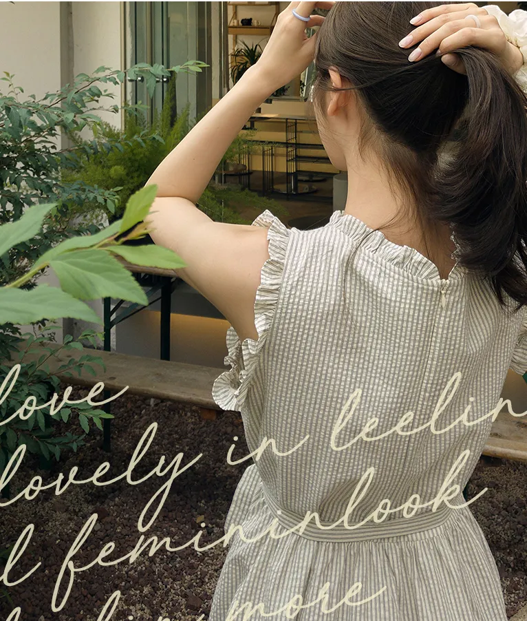 可愛荷葉摺邊設計附腰帶條紋無袖連身裙