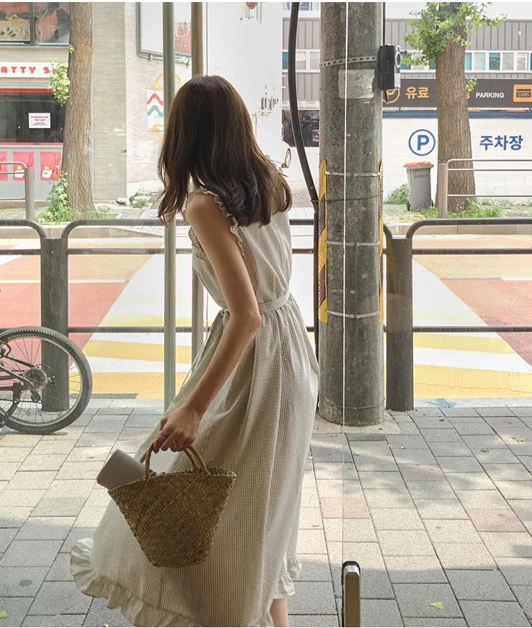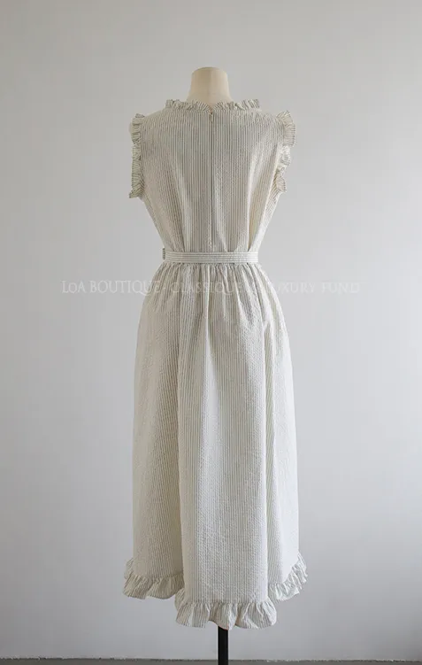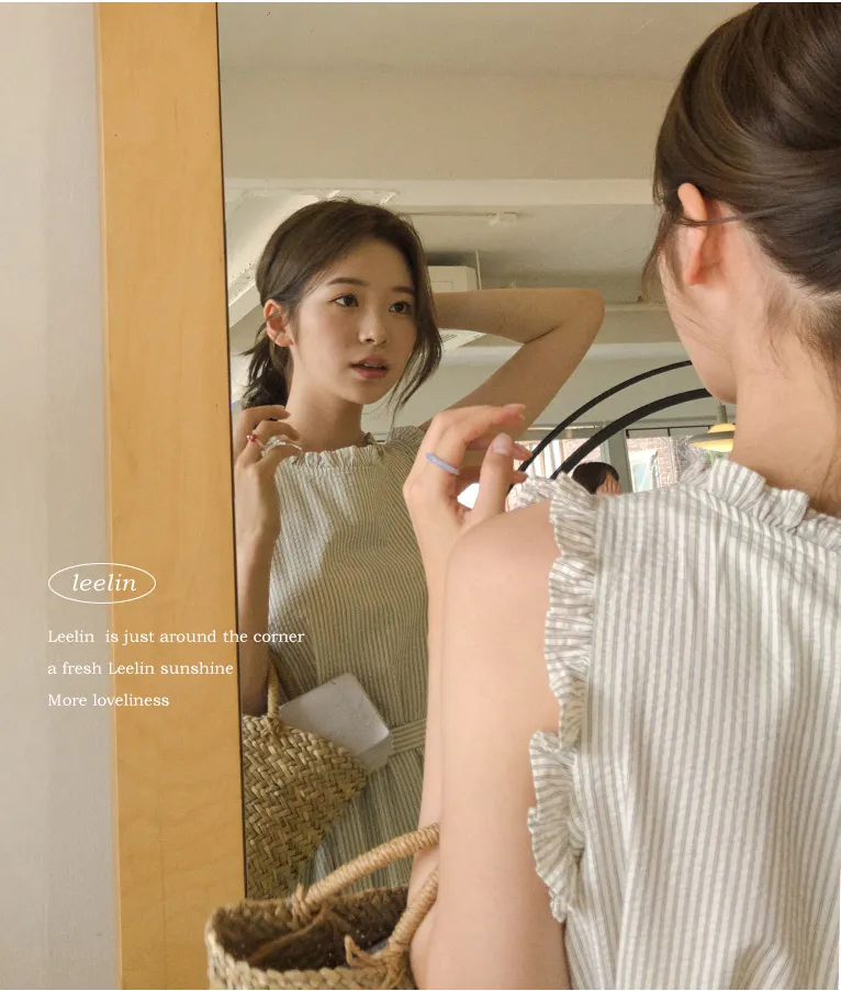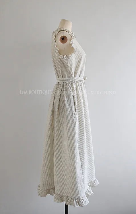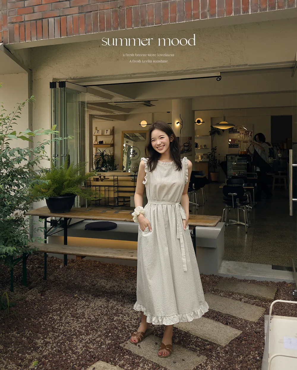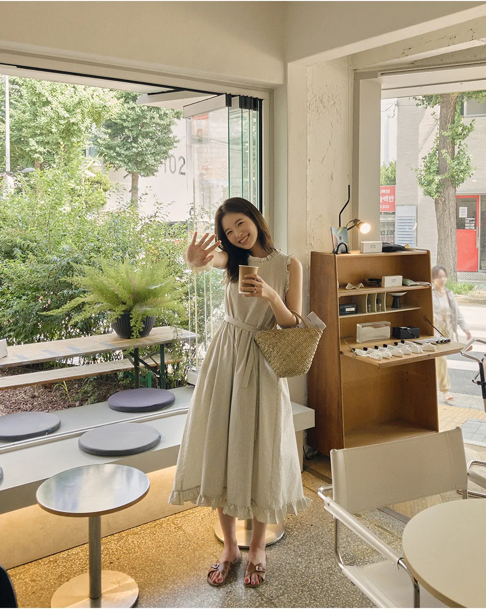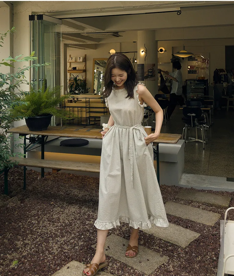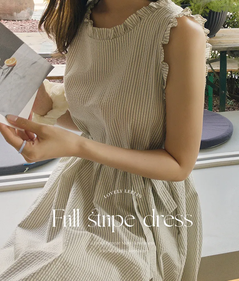 可愛荷葉摺邊設計附腰帶條紋無袖連身裙