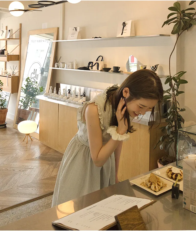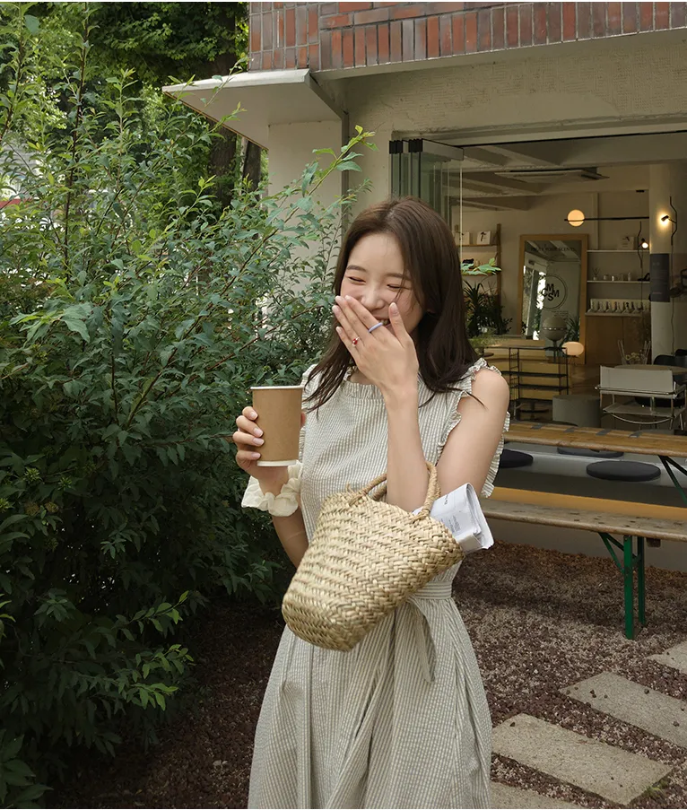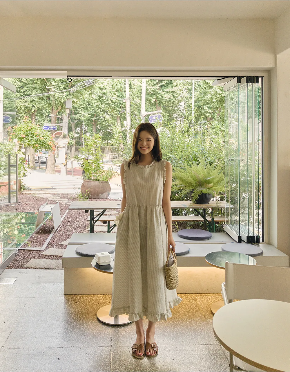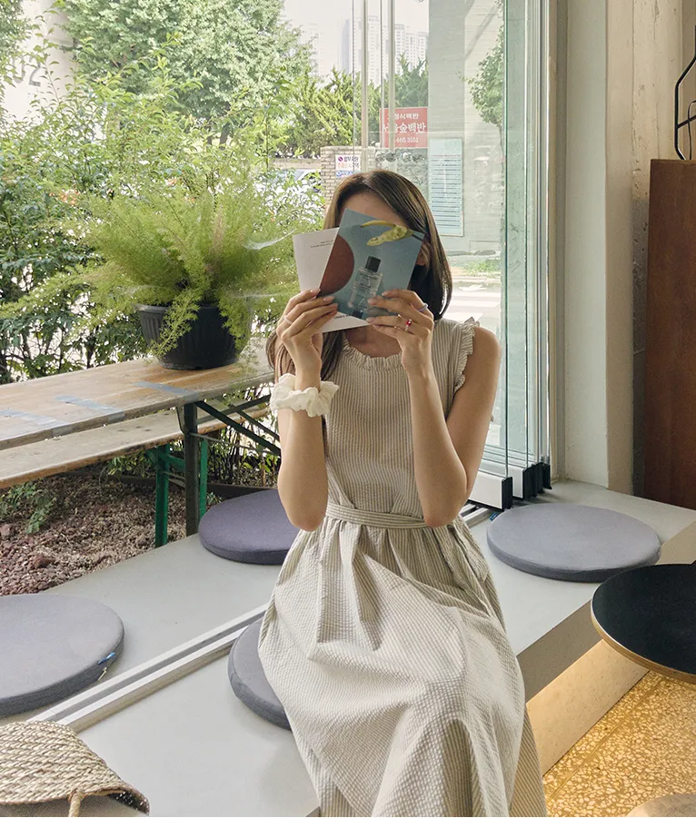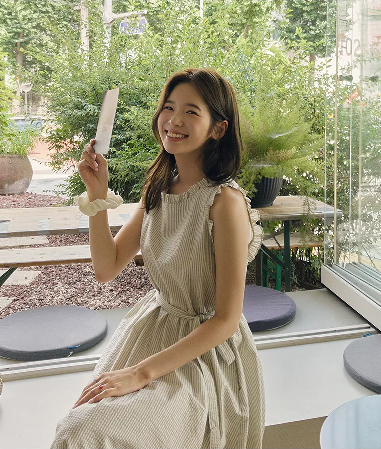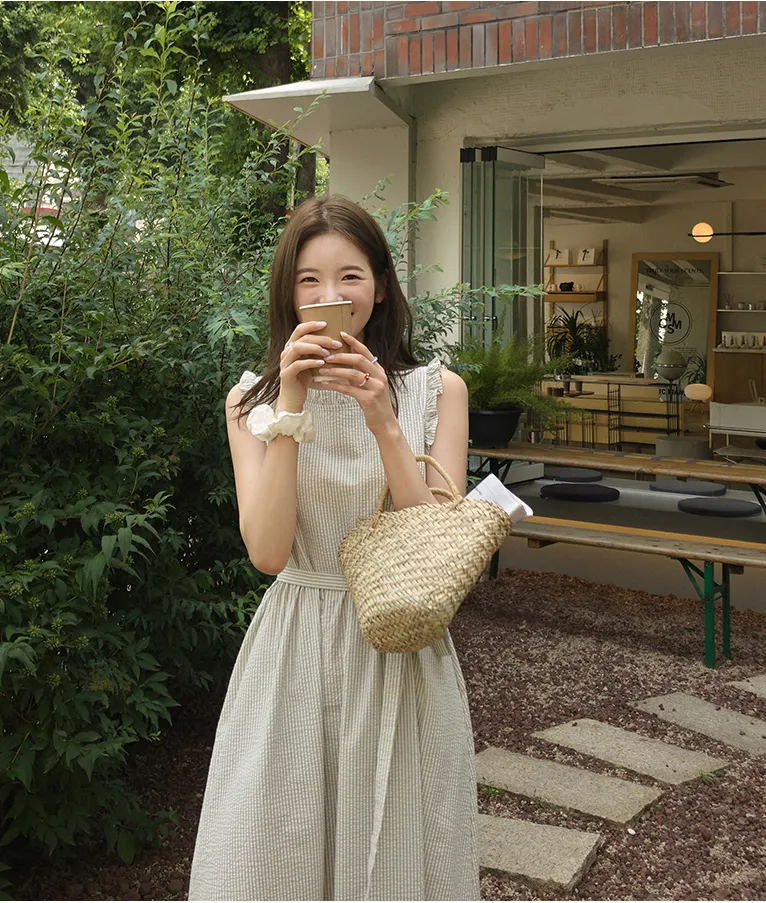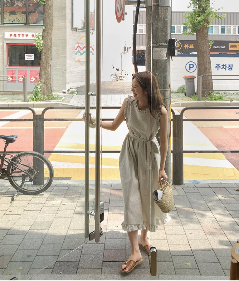 可愛荷葉摺邊設計附腰帶條紋無袖連身裙