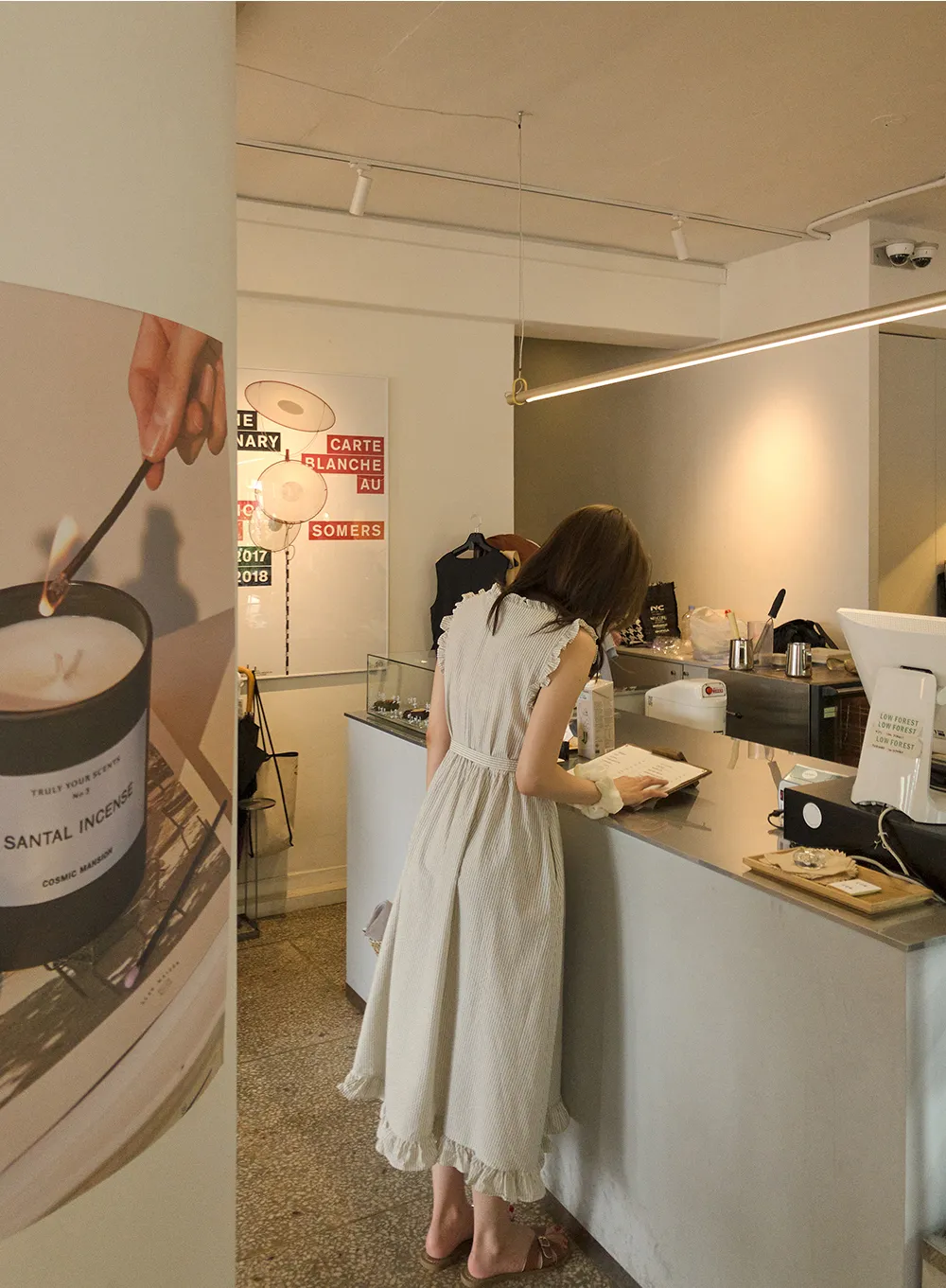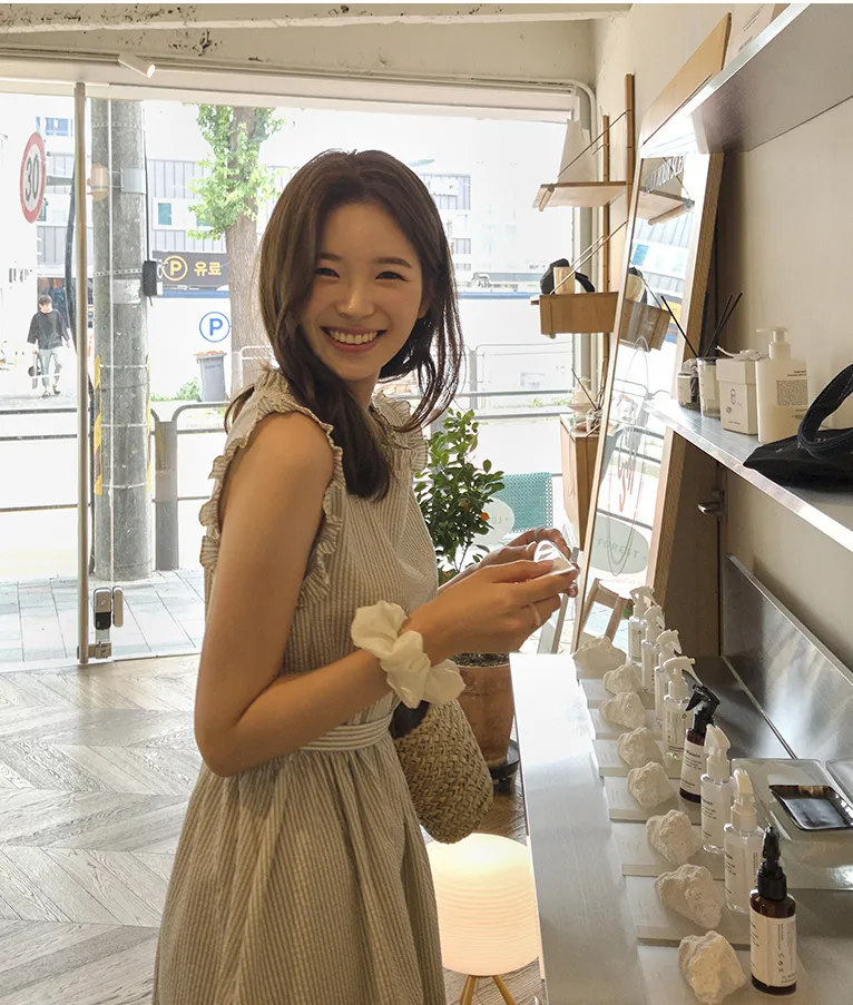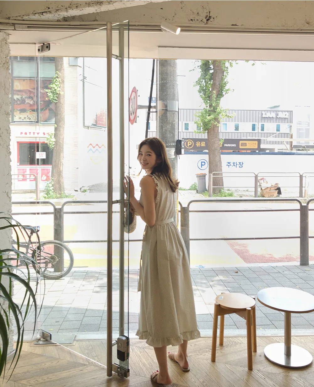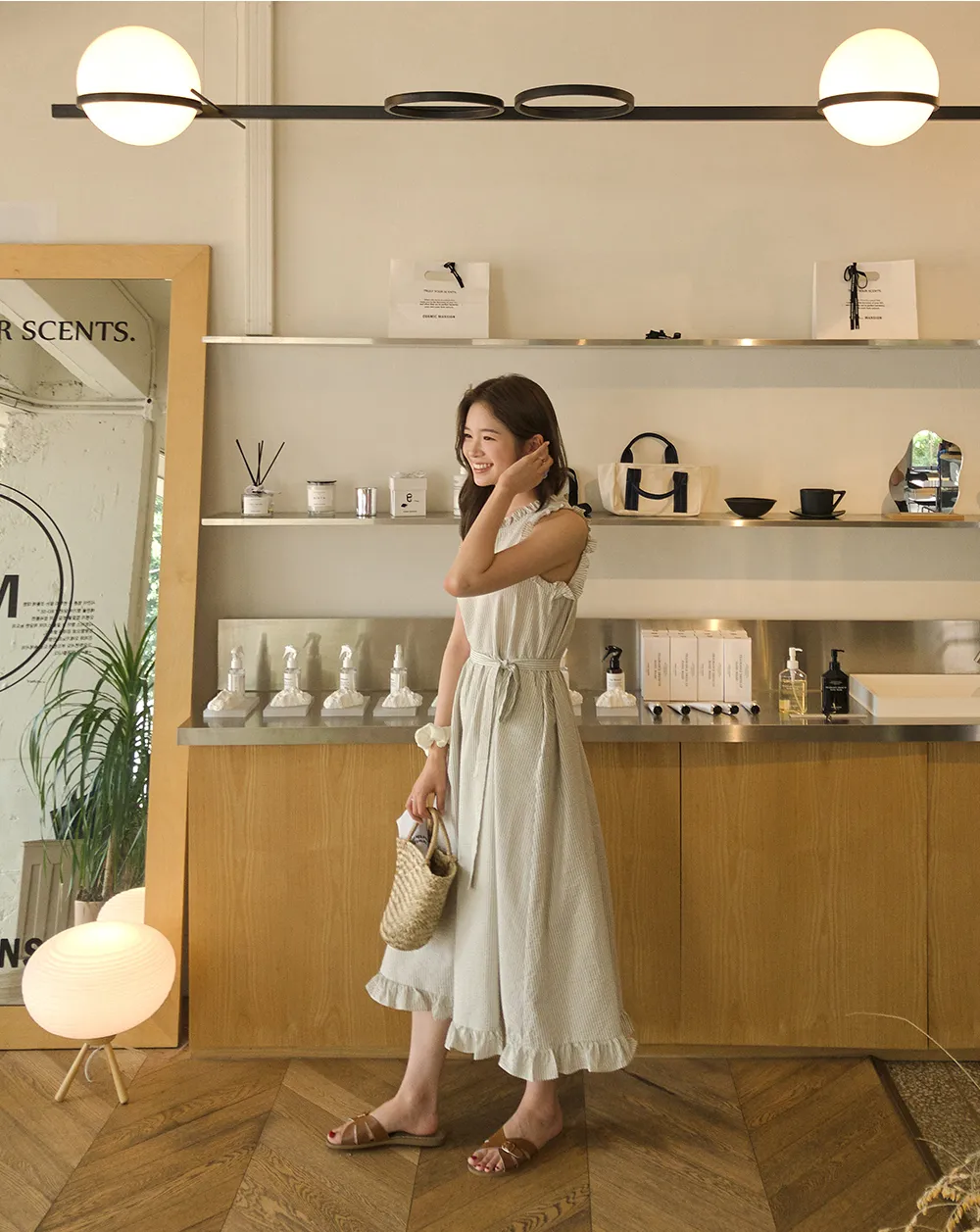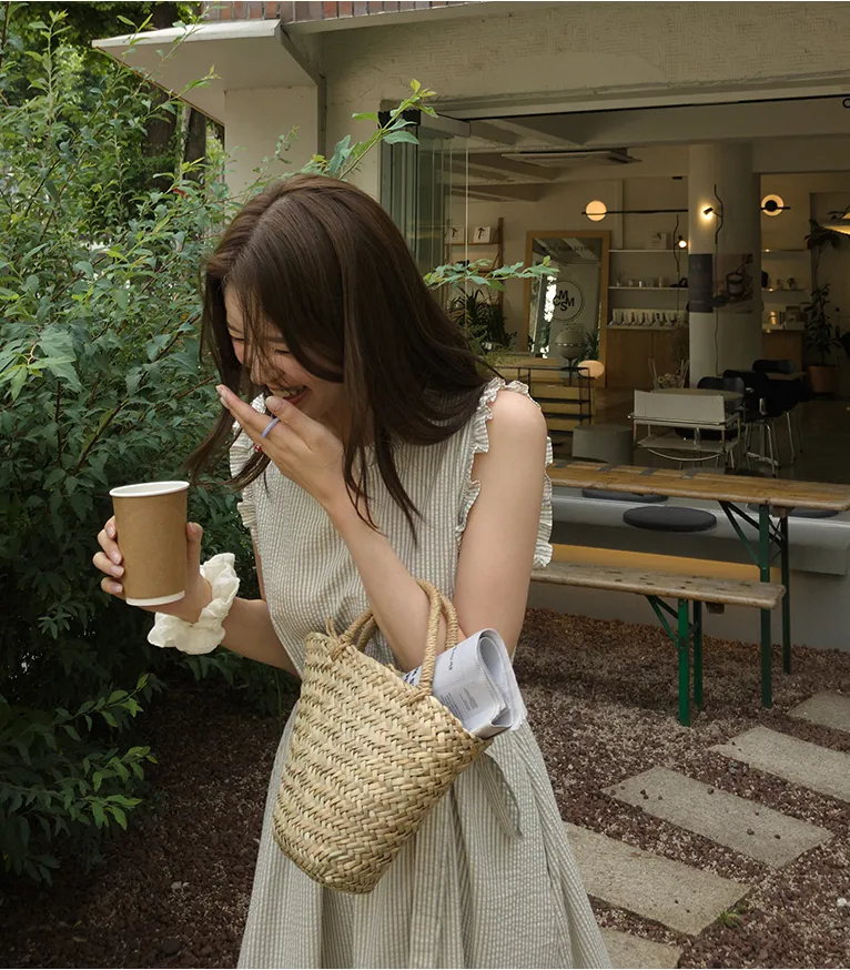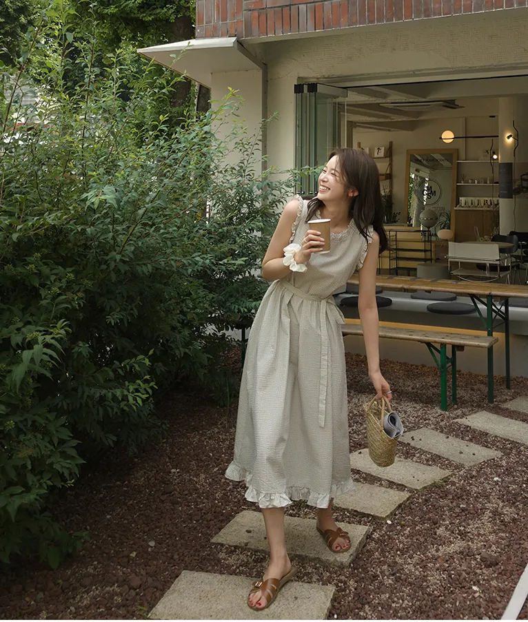 可愛荷葉摺邊設計附腰帶條紋無袖連身裙