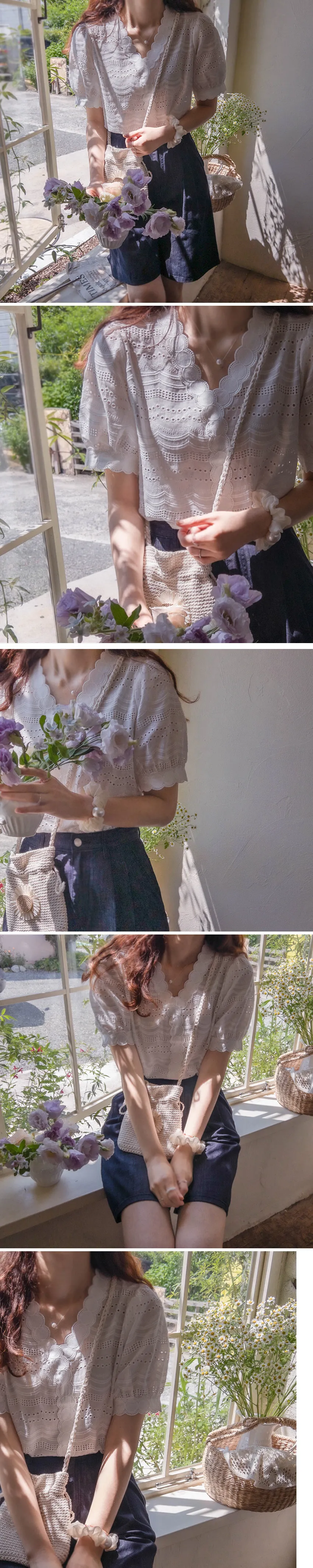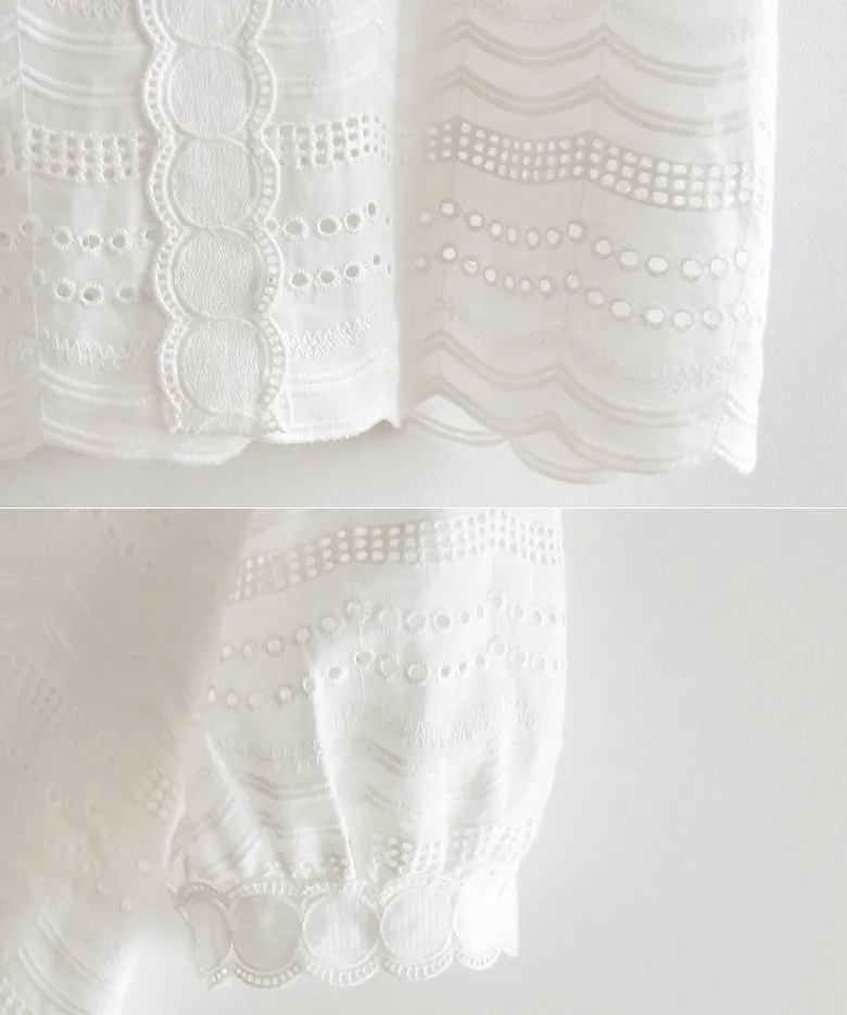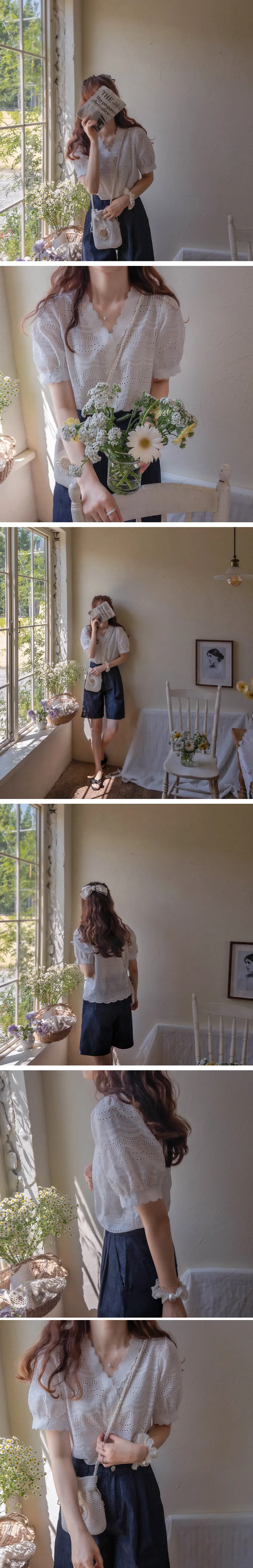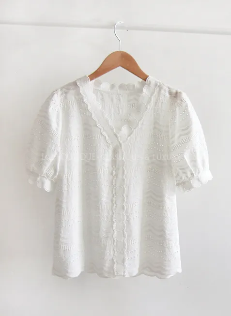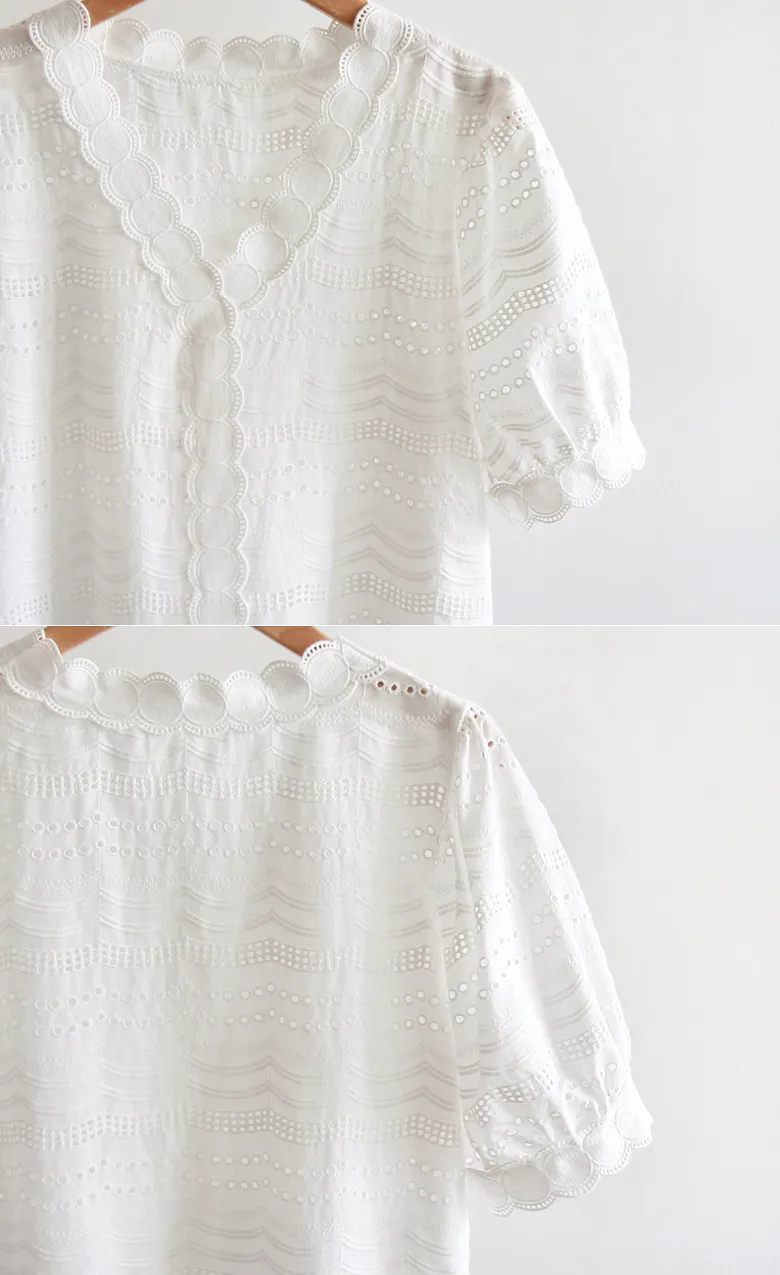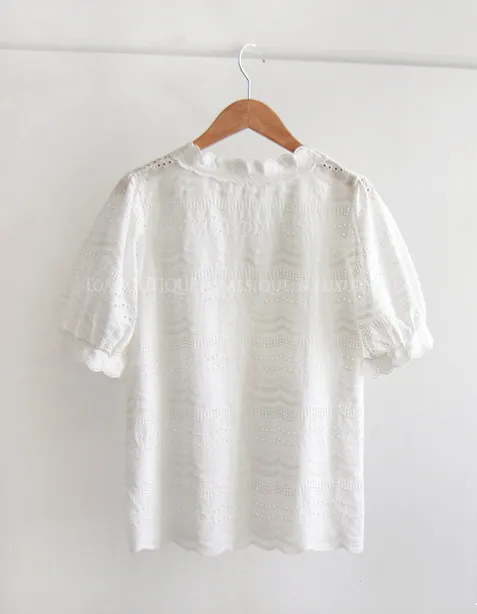 獨特波浪圓邊鏤空刺繡泡泡袖上衣