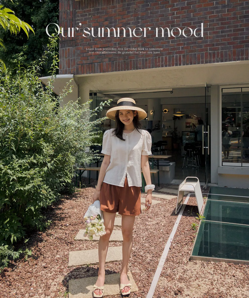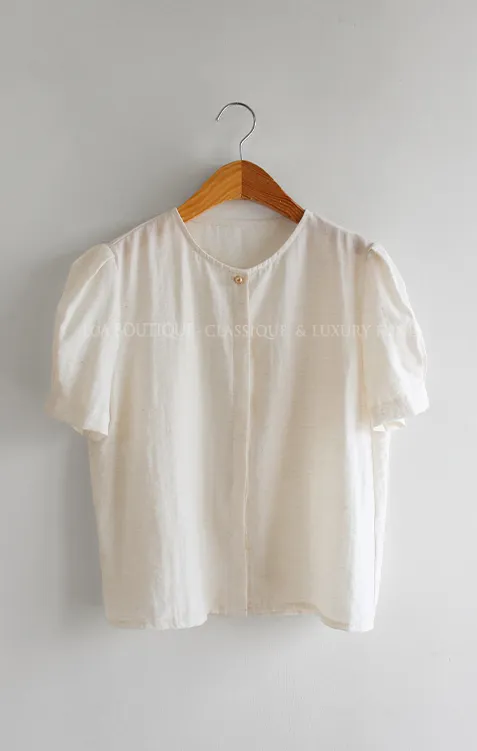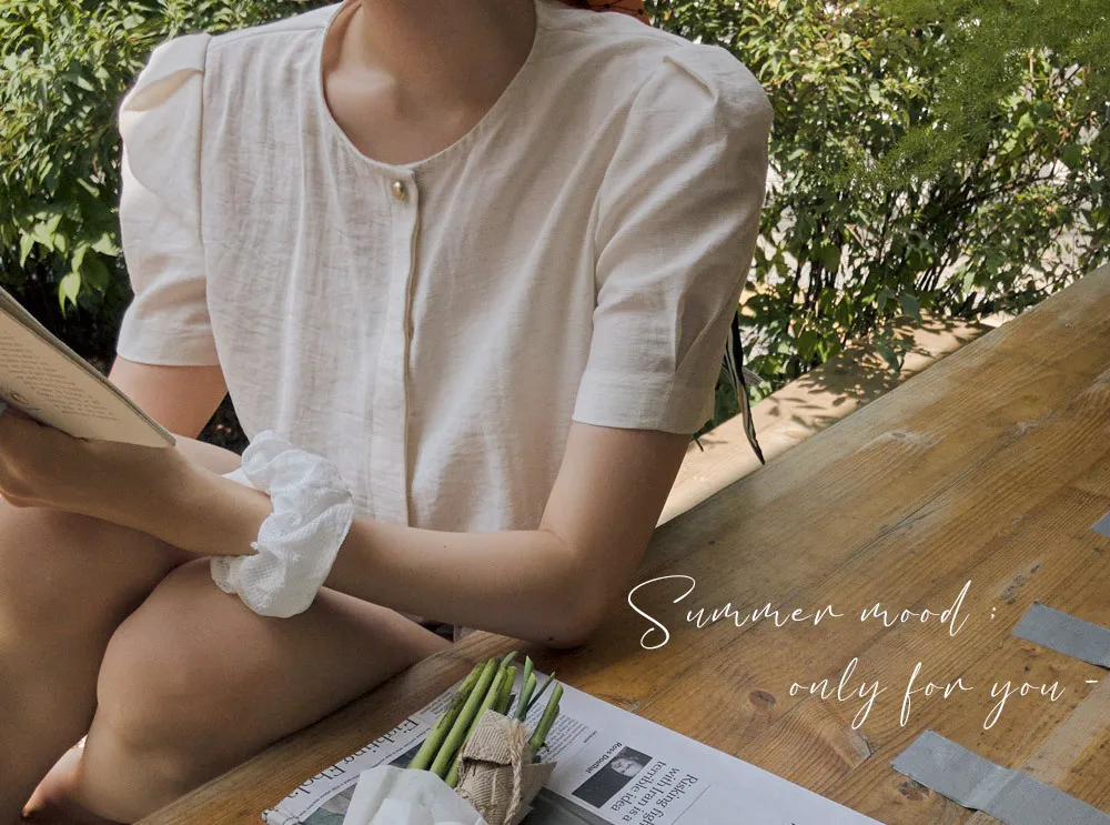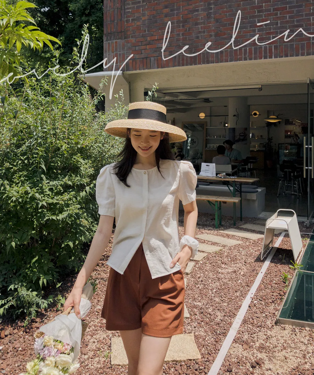 點綴單金扣隱藏鈕扣肩袖細摺泡泡袖上衣