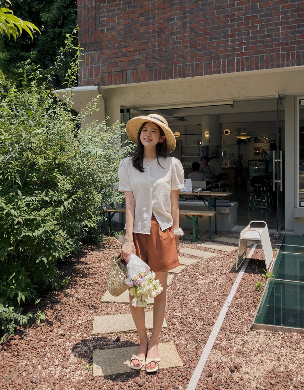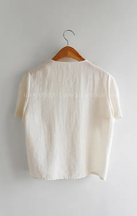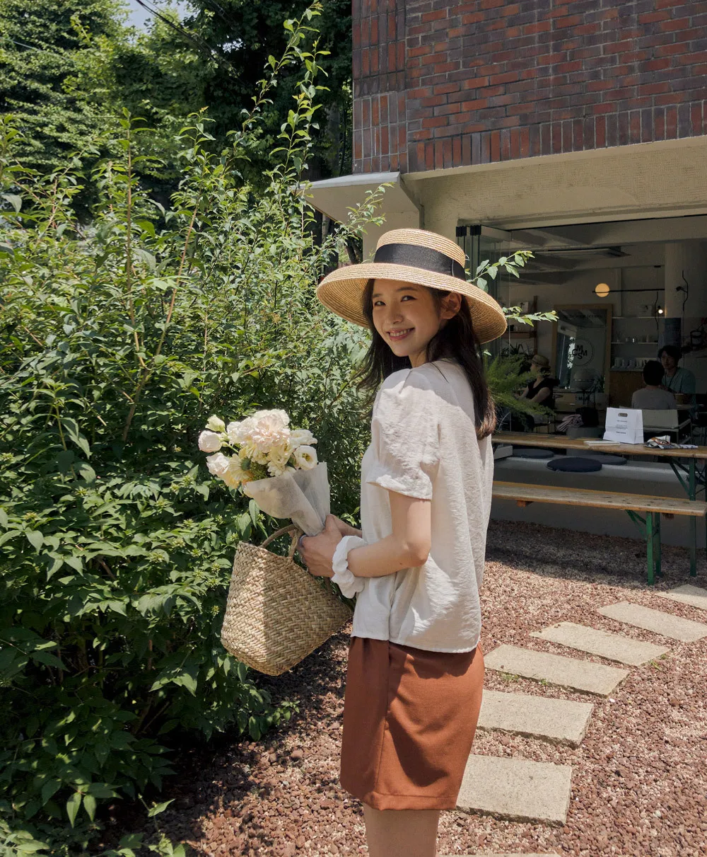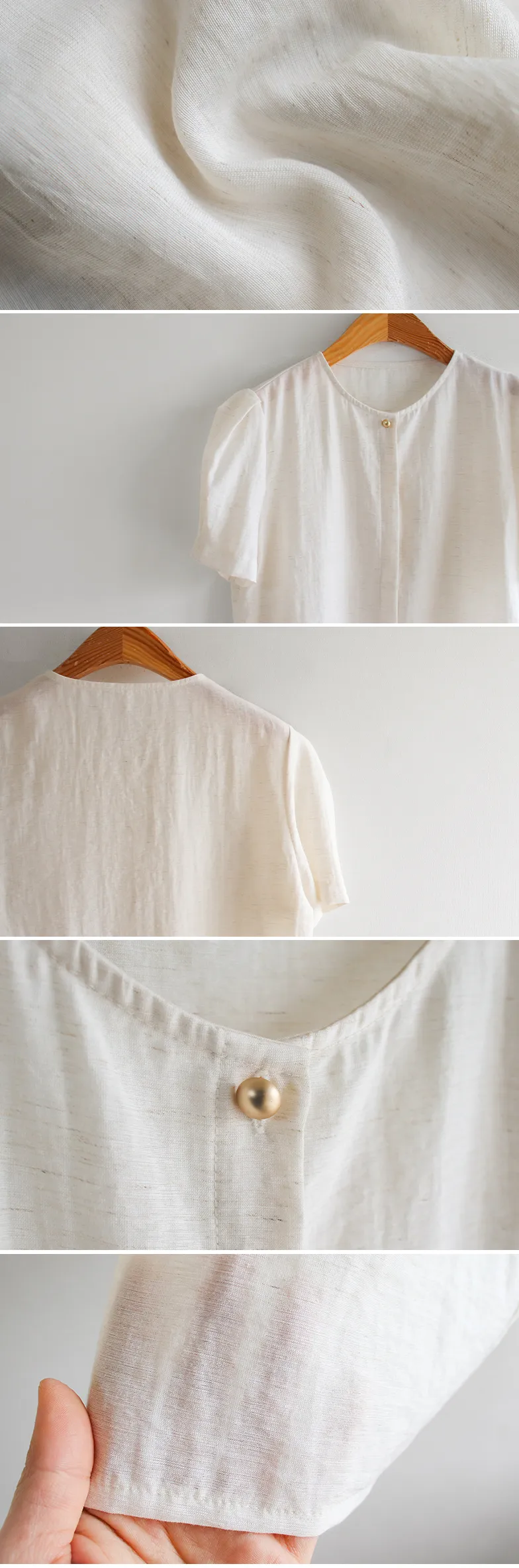 點綴單金扣隱藏鈕扣肩袖細摺泡泡袖上衣