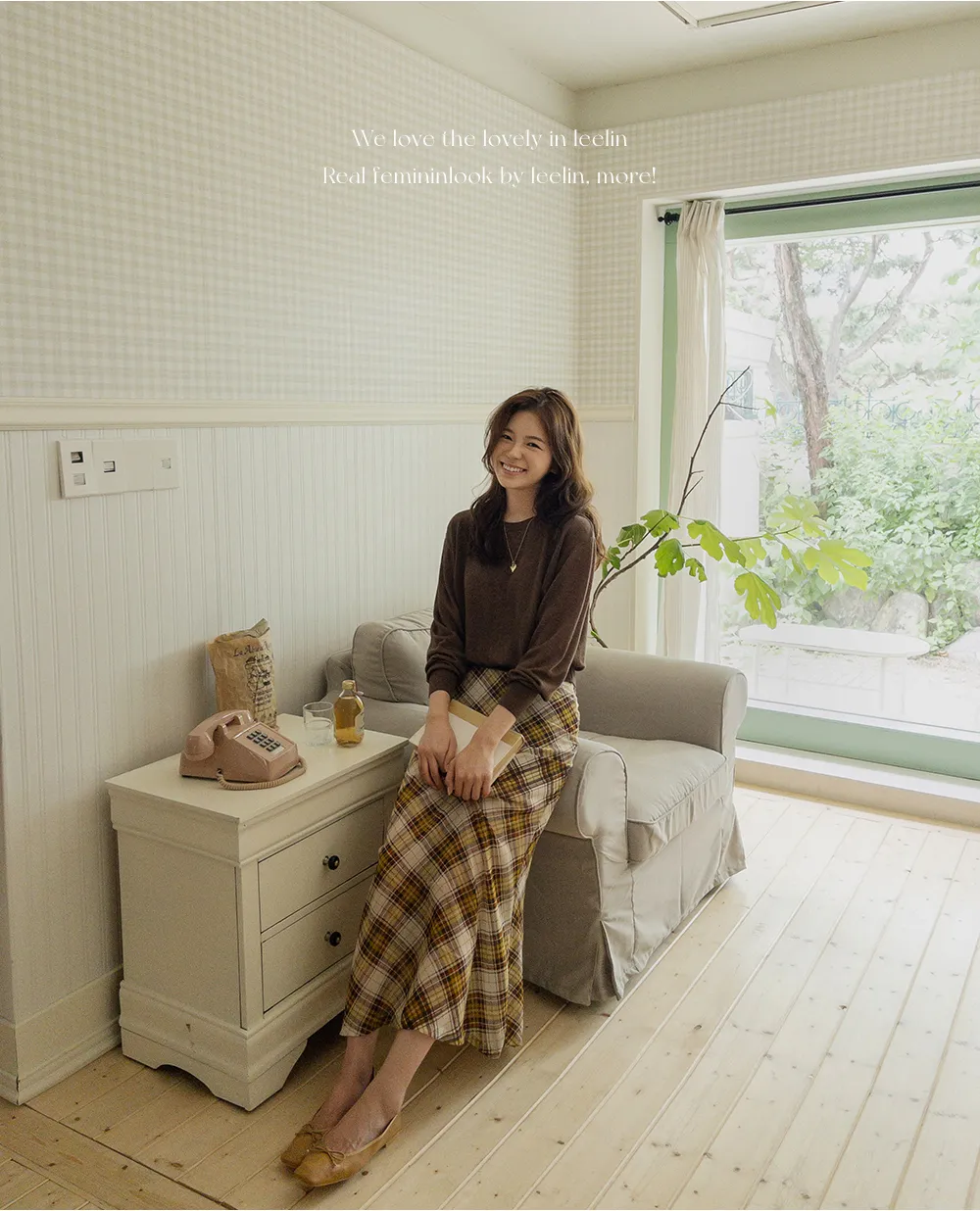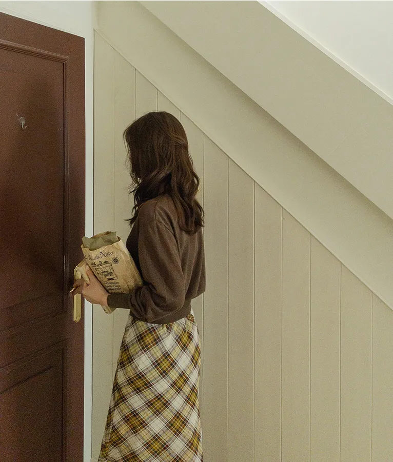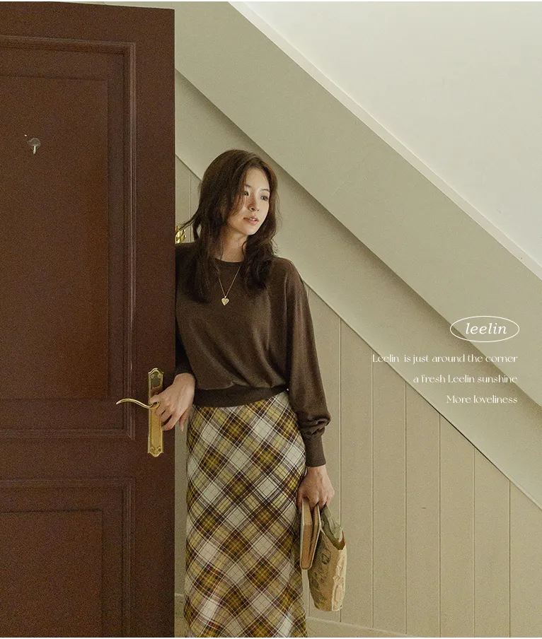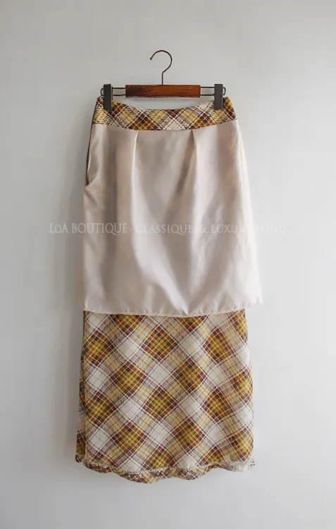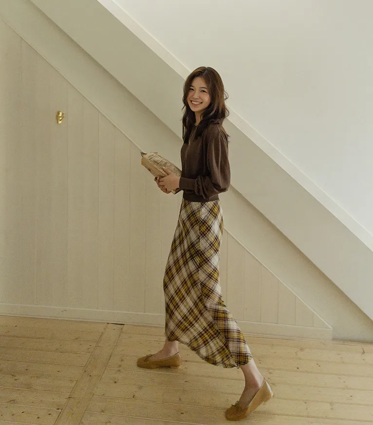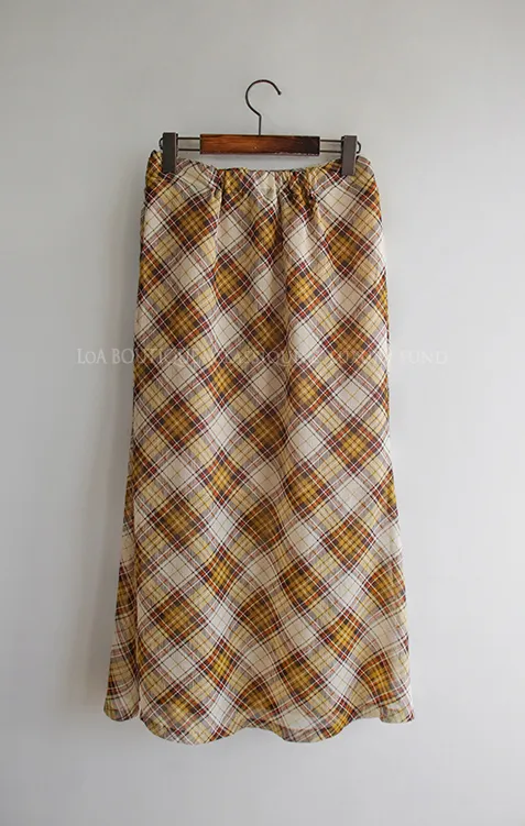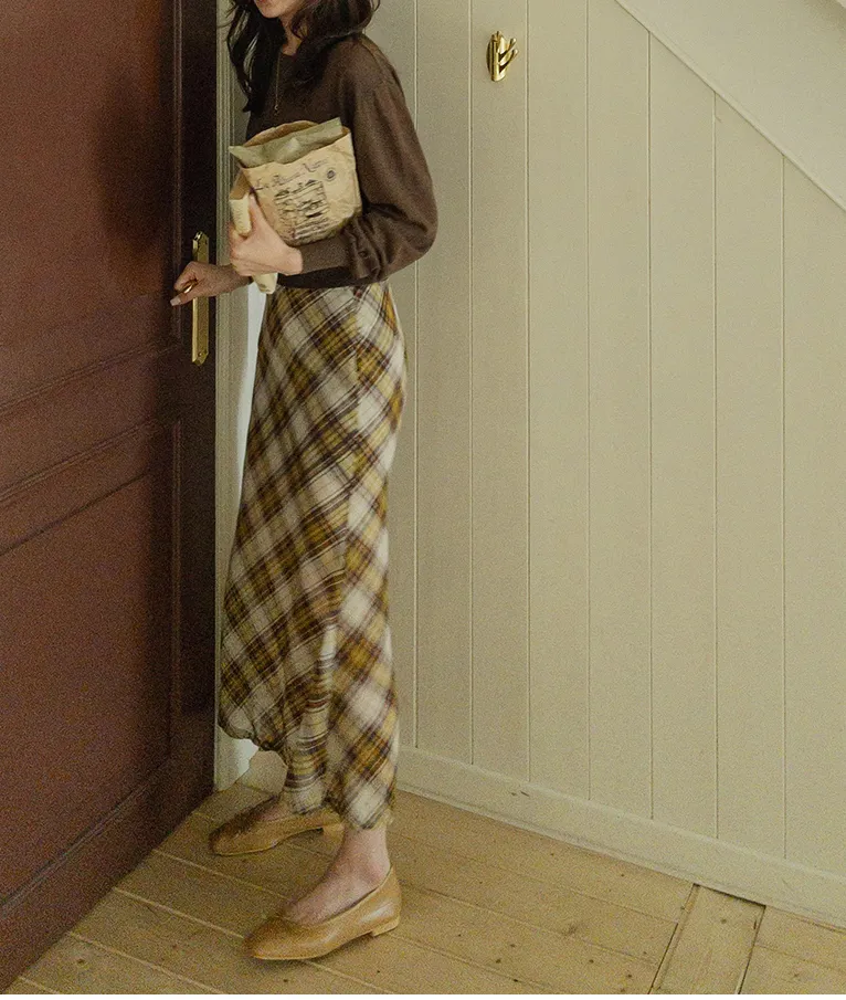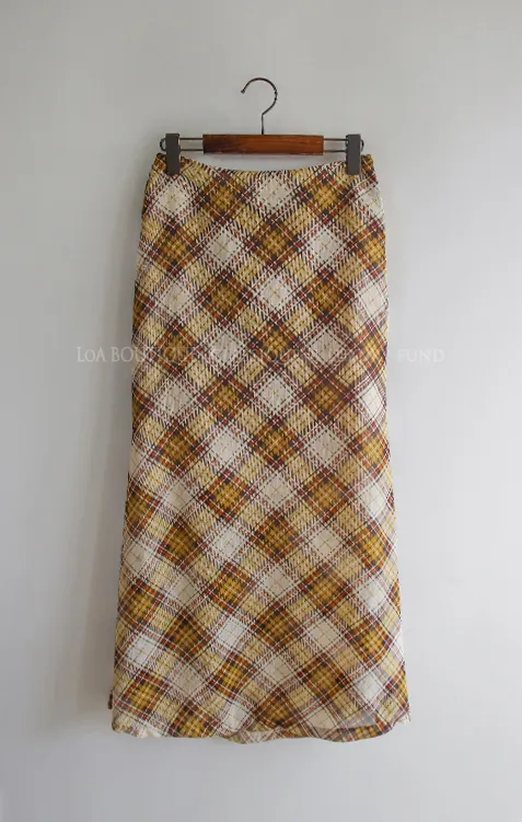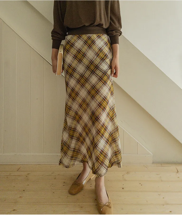 柔美配色斜格紋A字廓形雪紡中長裙