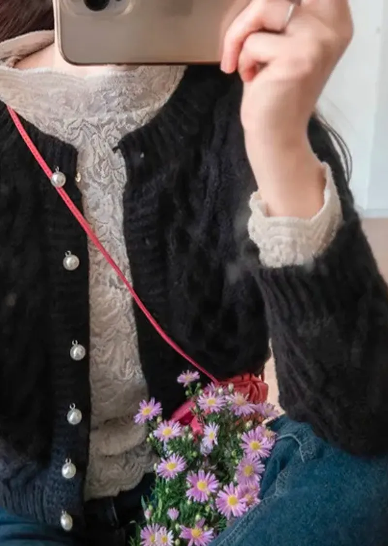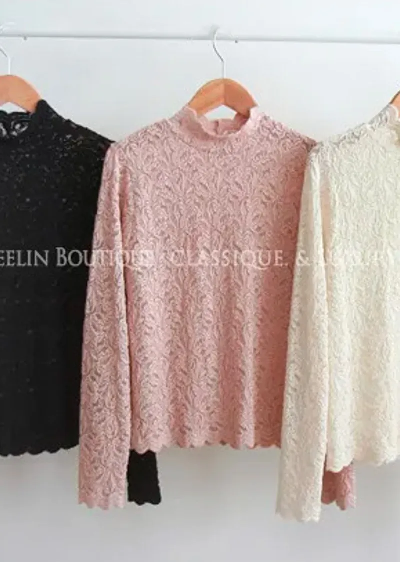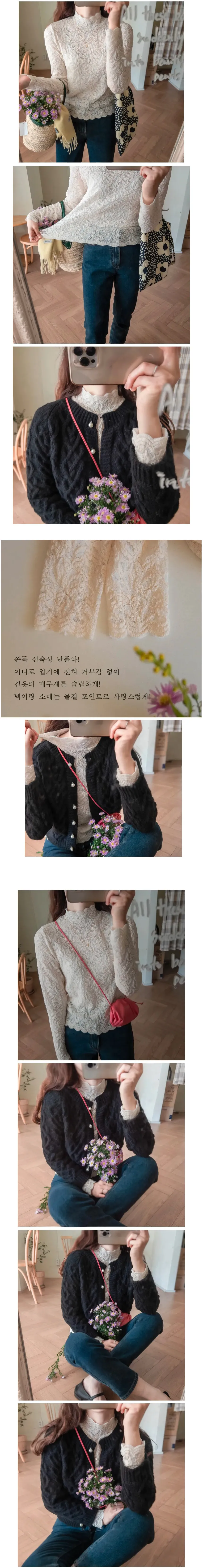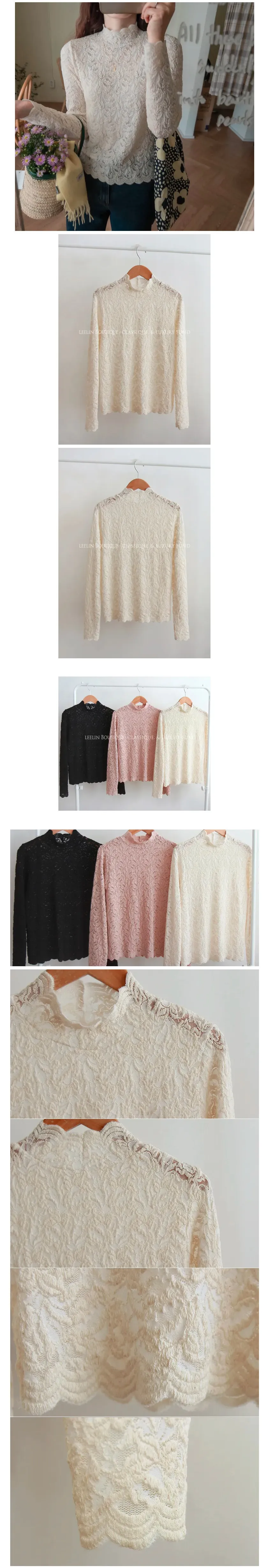[半高領,5%氨綸製成的漂亮波浪領,不會起皺][與花朵圖案舒適搭配的最佳單品!且富有彈性的布料製成,舒適地適合任何外套或開襟衫! ][下擺和袖子的波浪形狀非常漂亮]