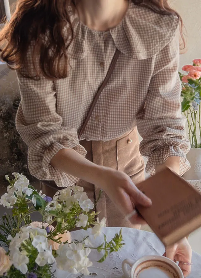 優雅雙領袖口束摺邊格紋排扣上衣 米色
