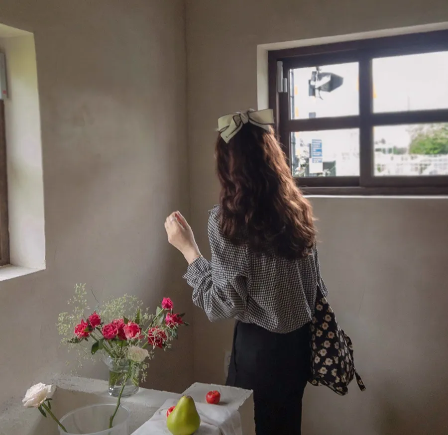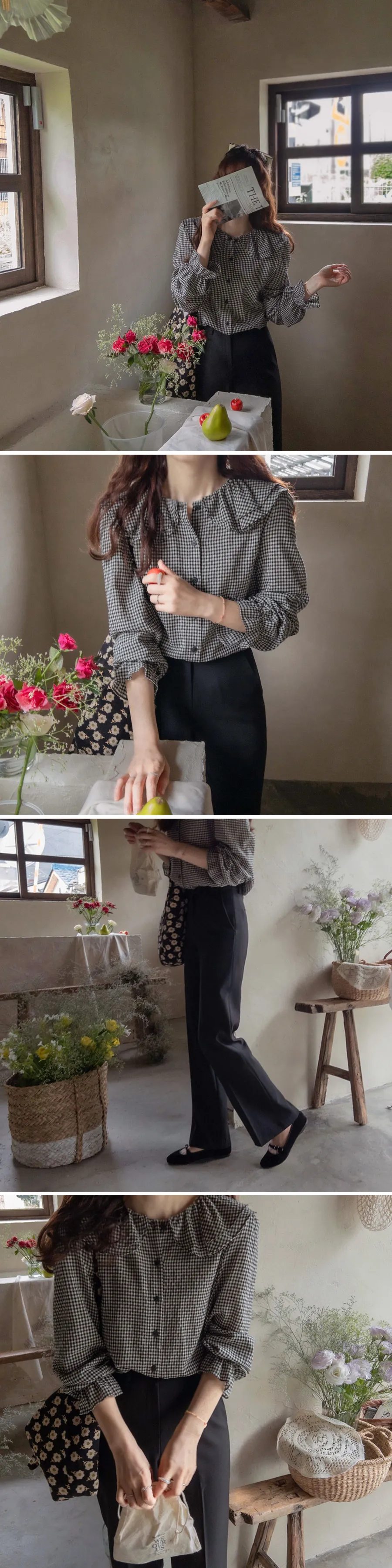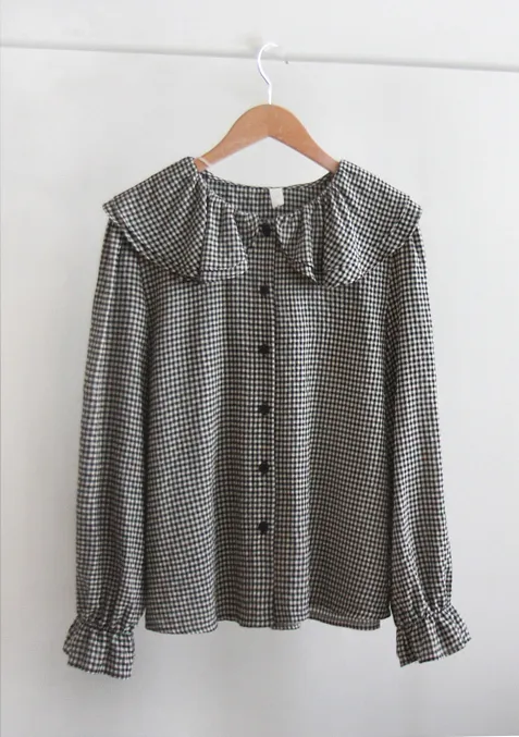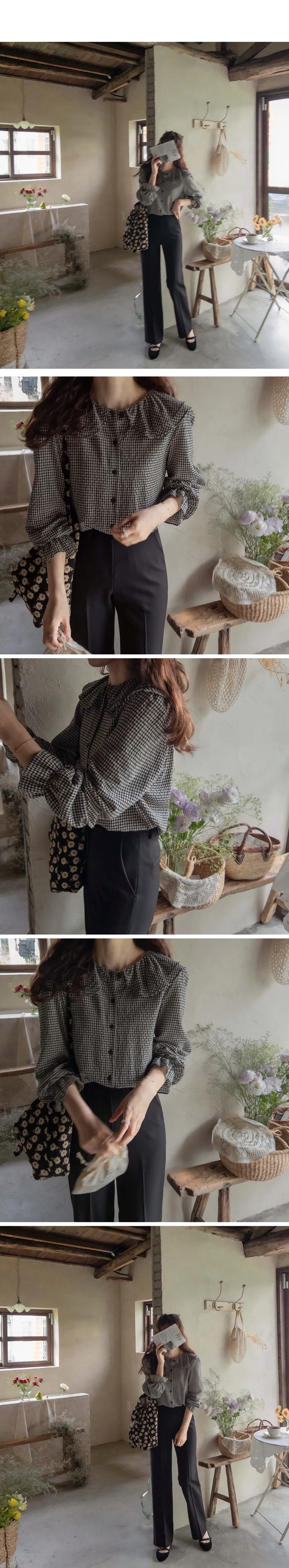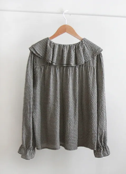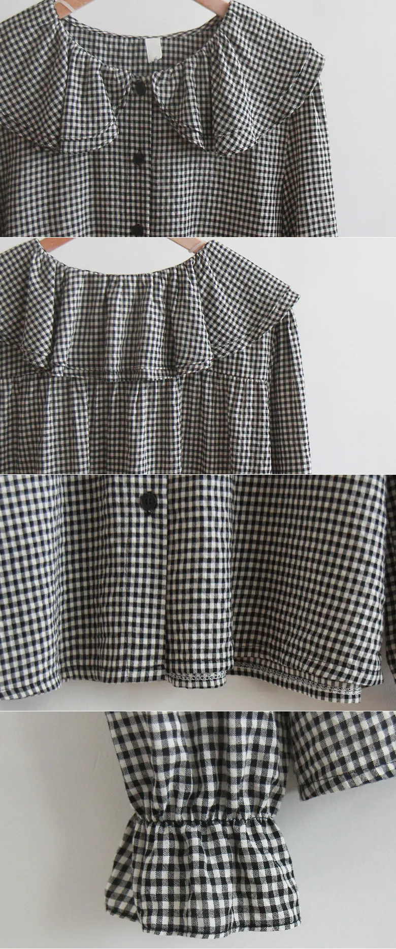 優雅雙領袖口束摺邊格紋排扣上衣 黑色