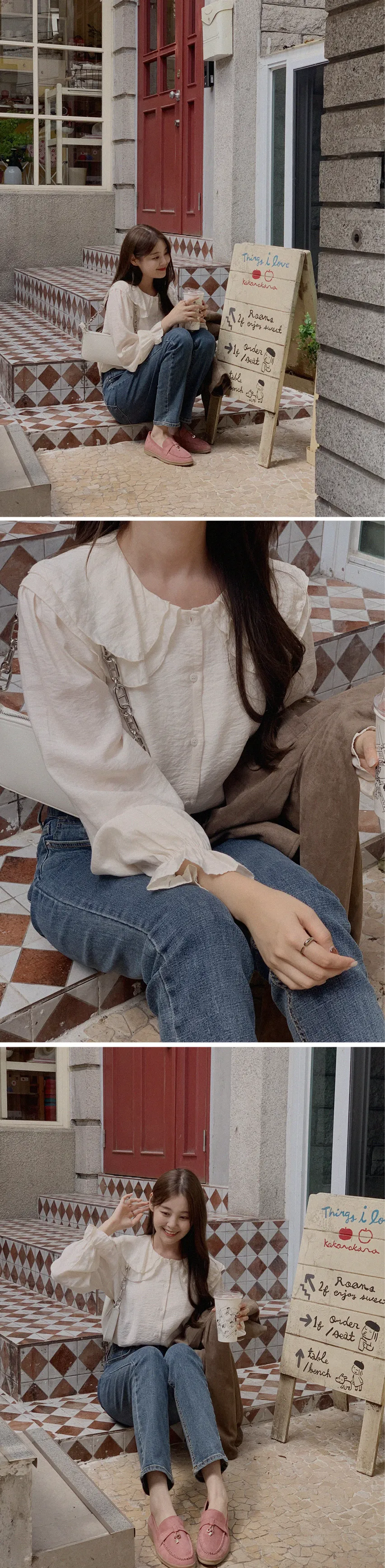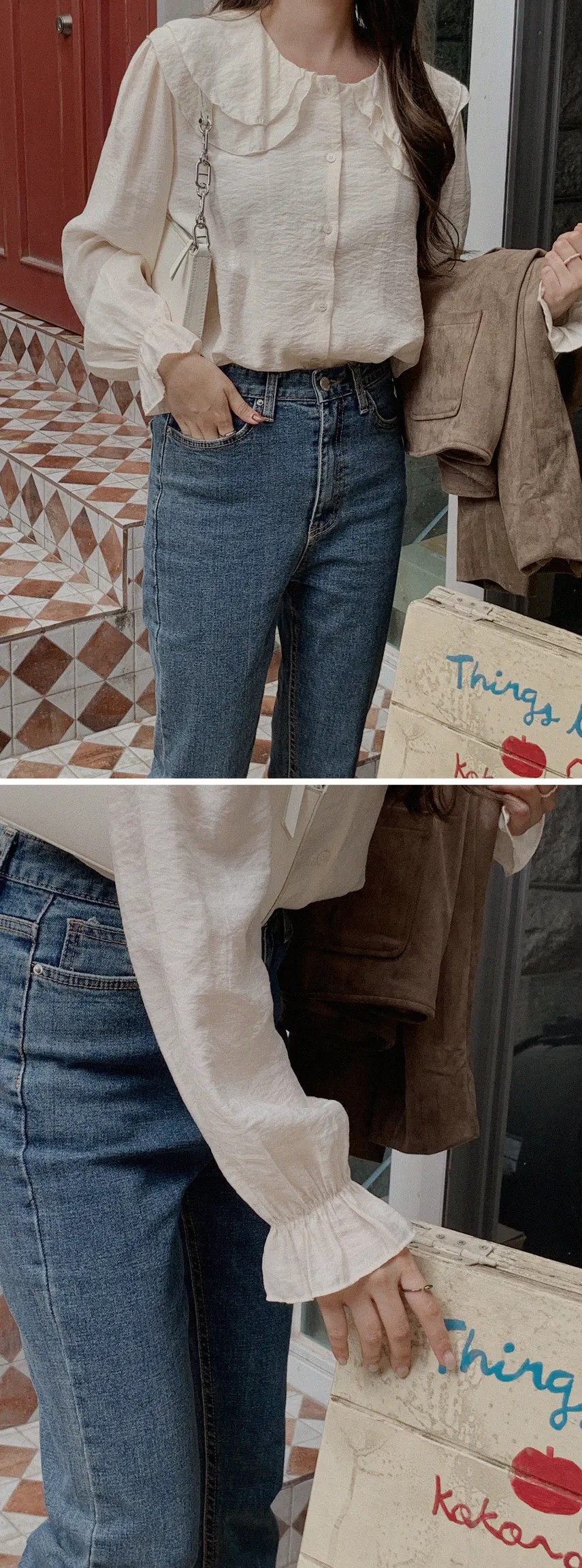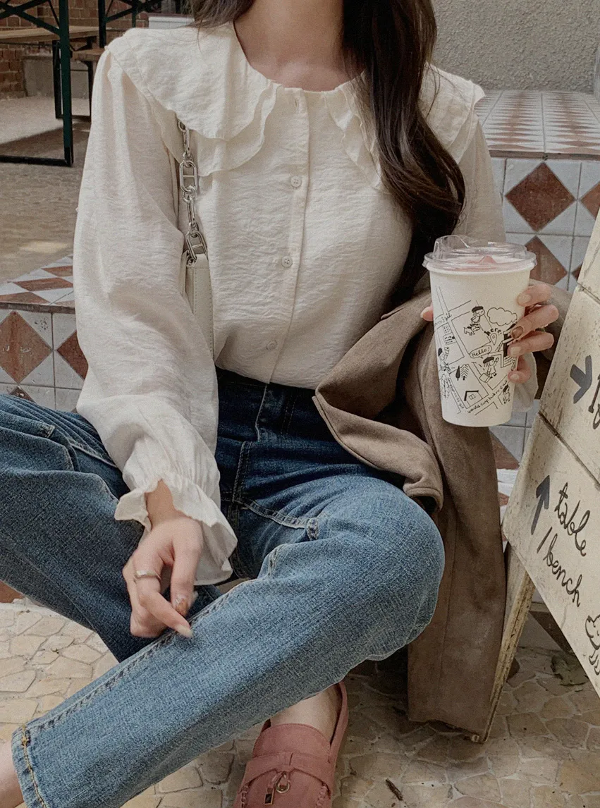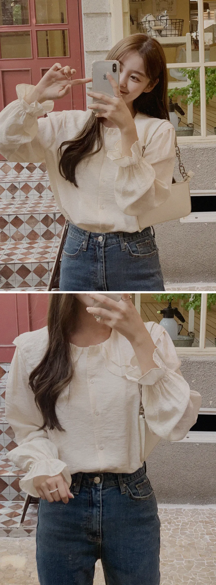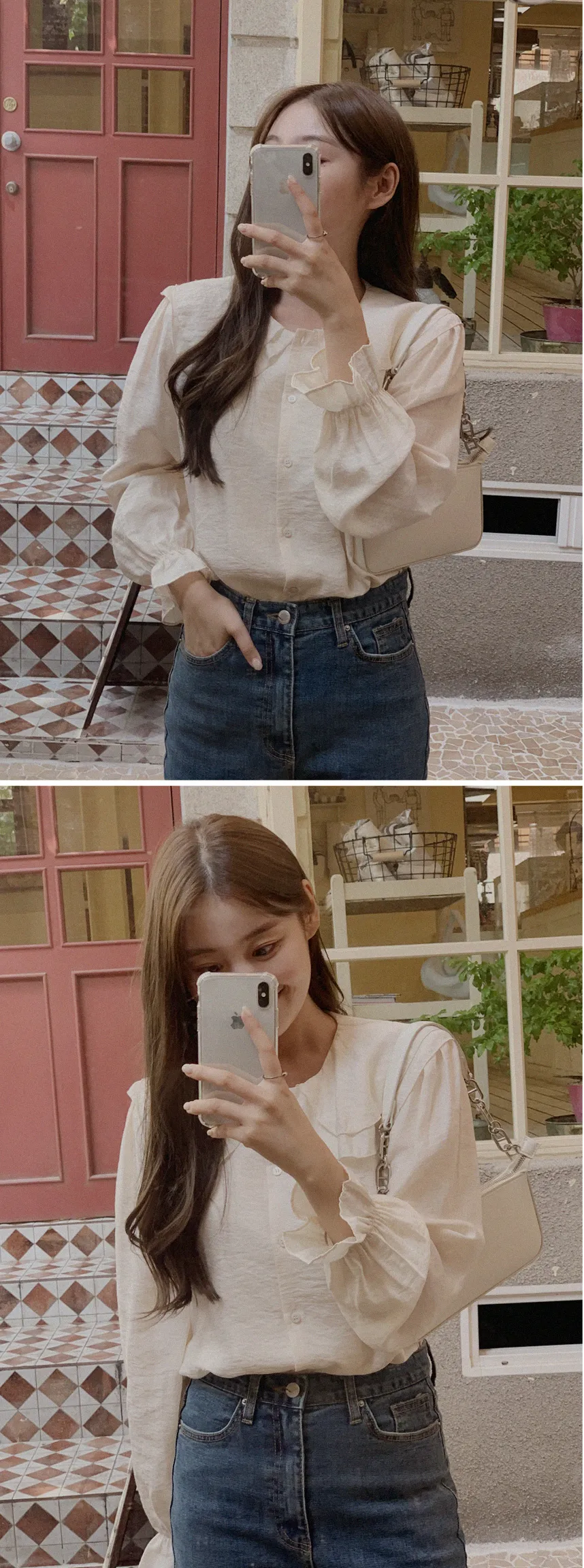 漂亮雙褶邊領袖口束摺邊排扣上衣