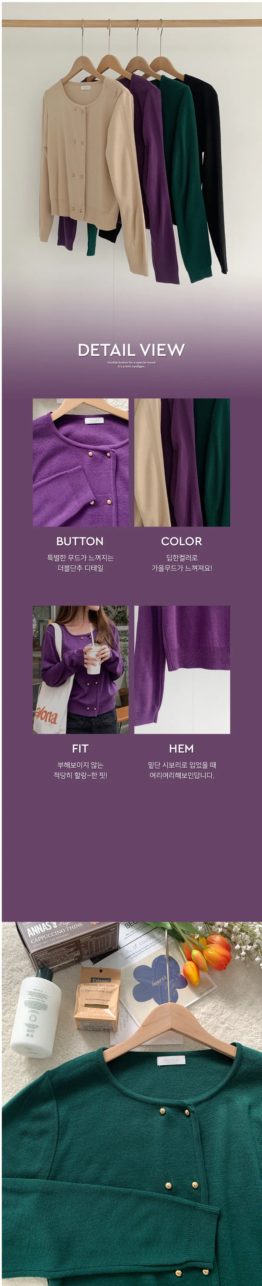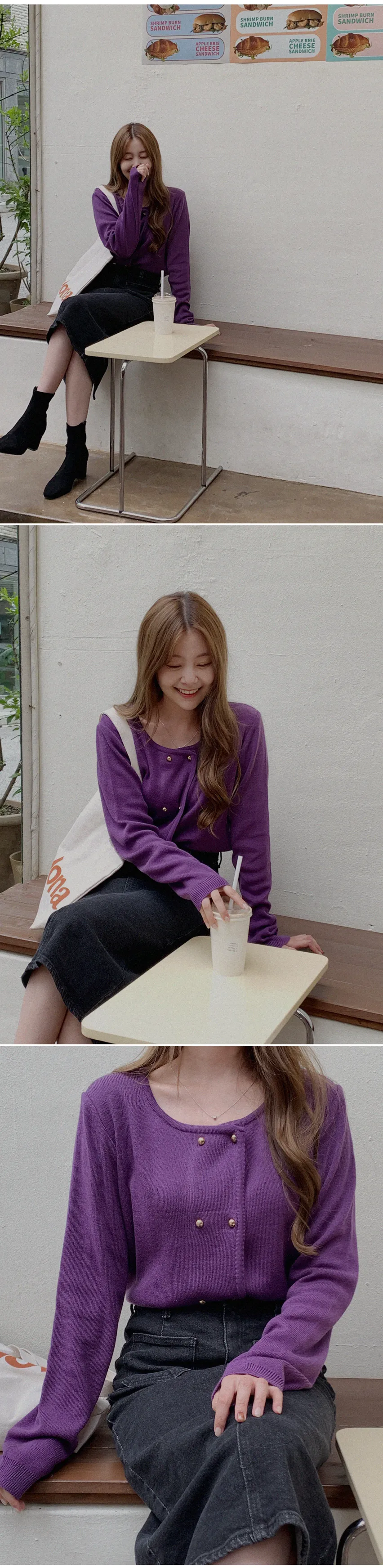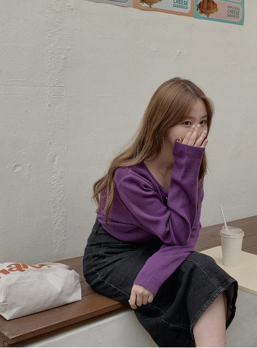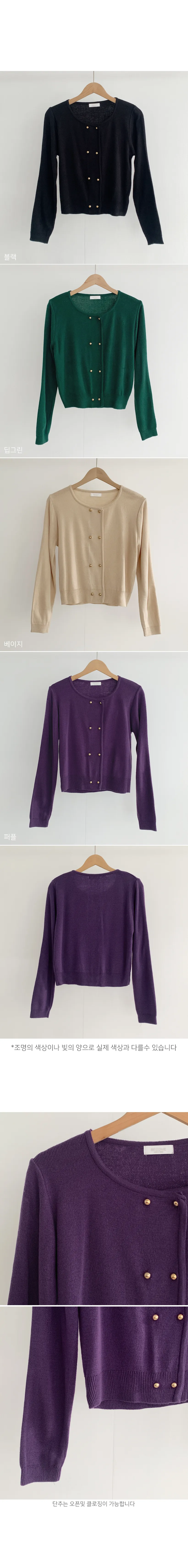 因雙鈕扣而具有特殊情調的針織開衫。開衫閉合非常漂亮。採用修身的針織面料,適度寬鬆的版型和下擺穿起來,肩線和手臂線條看起來很精緻。金色鈕扣帶賦予它閃亮的氣息,使其看起來奢華而女性化。它與模特一樣舒適的牛仔下身ㄉ很相配,也與滌綸面料製成的女性化裙子完美搭配。顏色精緻又不失女人味和奢華,非常推薦。即使只是搭配牛仔褲也會閃閃發光♡