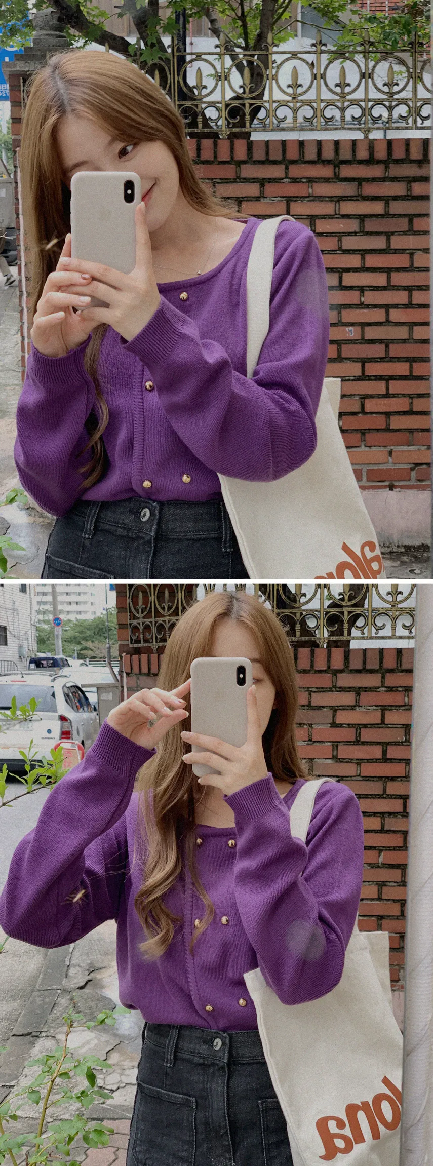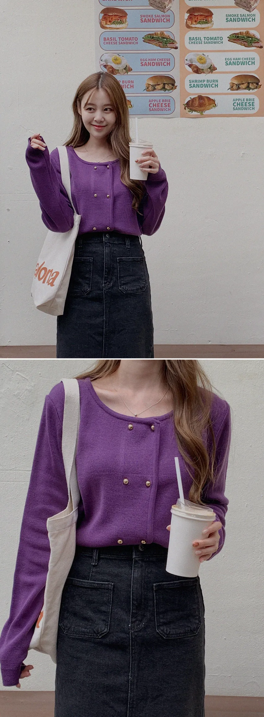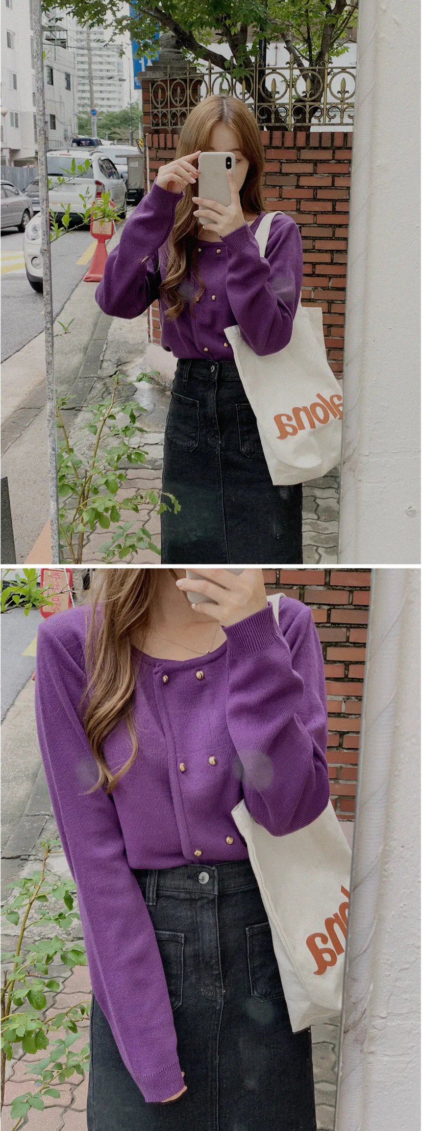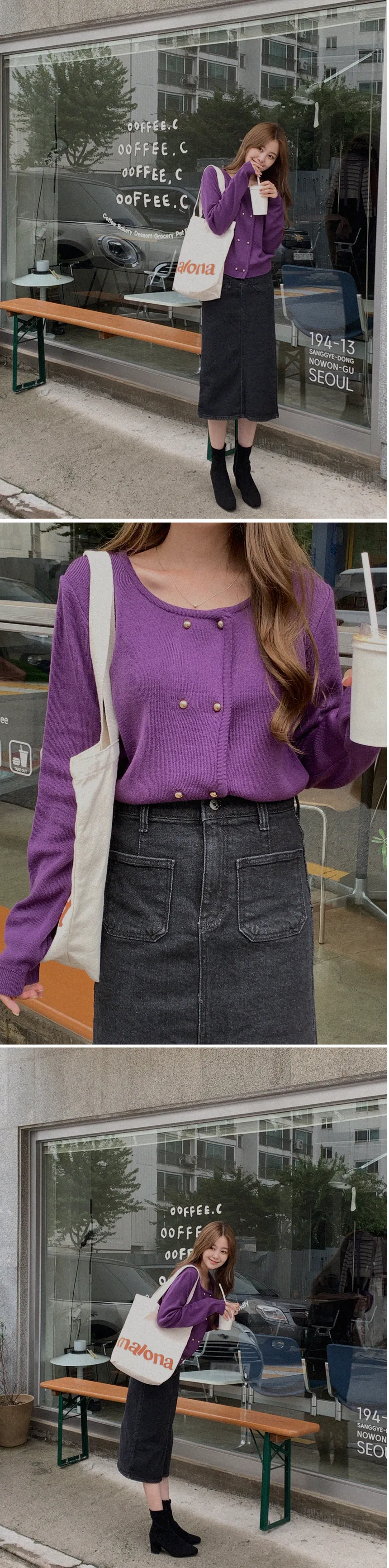 因雙鈕扣而具有特殊情調的針織開衫。開衫閉合非常漂亮。採用修身的針織面料,適度寬鬆的版型和下擺穿起來,肩線和手臂線條看起來很精緻。金色鈕扣帶賦予它閃亮的氣息,使其看起來奢華而女性化。它與模特一樣舒適的牛仔下身ㄉ很相配,也與滌綸面料製成的女性化裙子完美搭配。顏色精緻又不失女人味和奢華,非常推薦。即使只是搭配牛仔褲也會閃閃發光♡