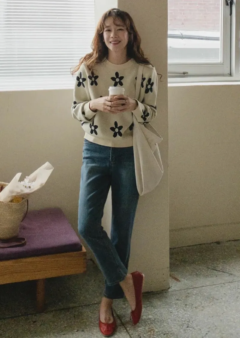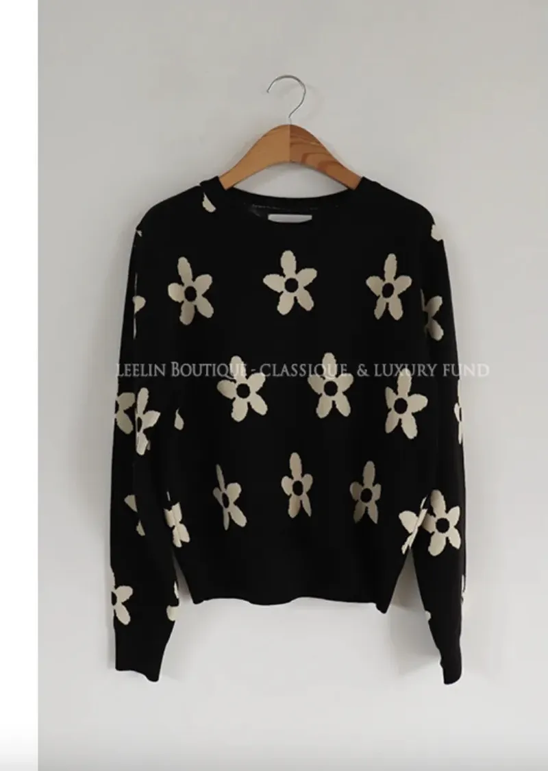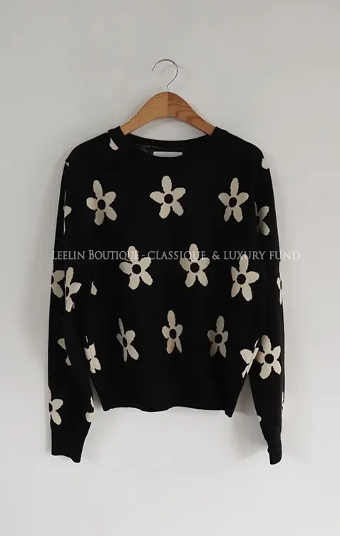 魅力花朵柔軟針織上衣 黑色穿搭照