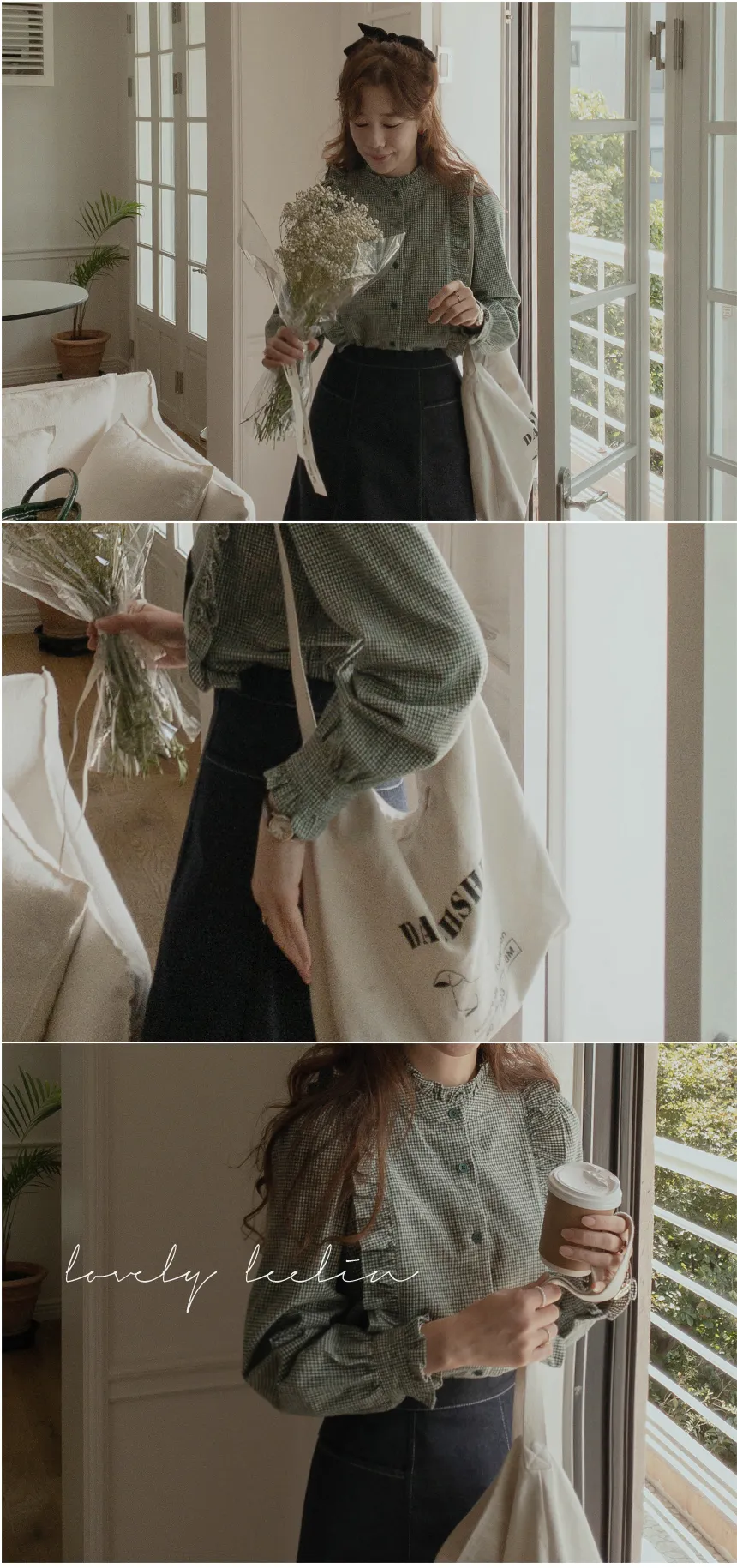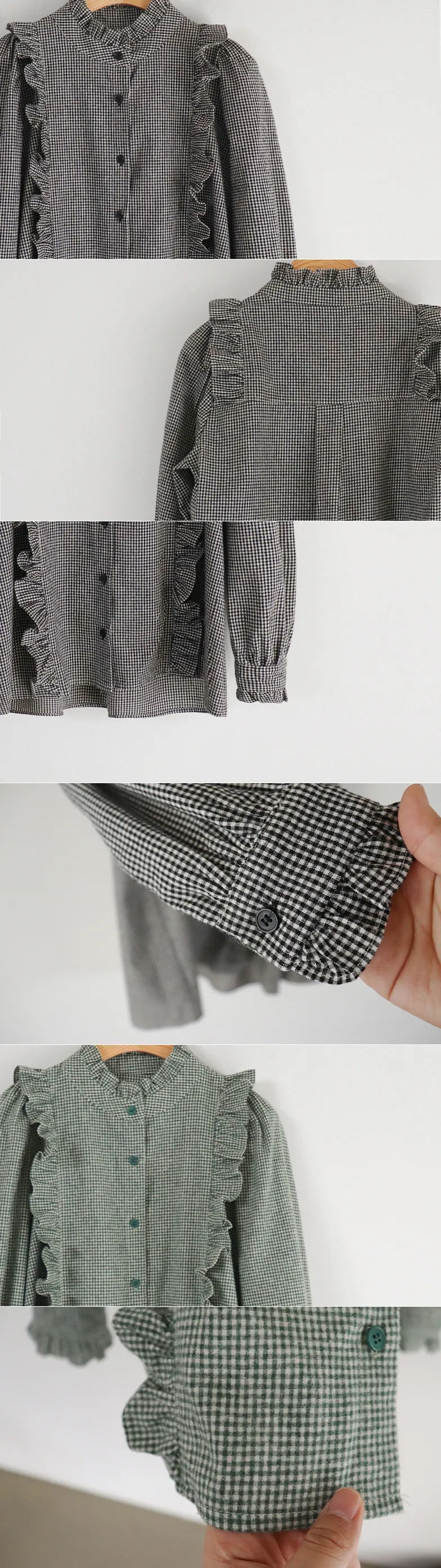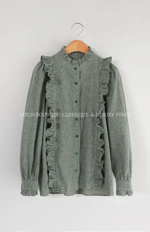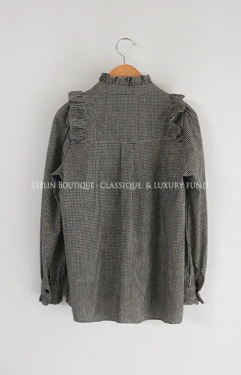 [格紋圖案排扣上衣][可愛的褶邊細節][即使在冬天也很享受的羊毛材質][即使接觸裸露的皮膚也很柔軟~]