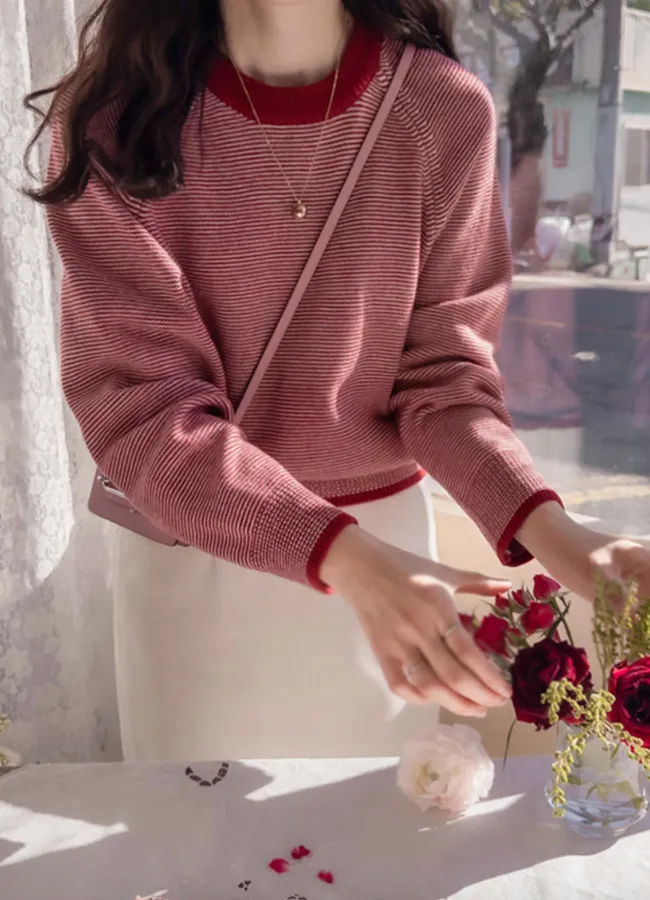 精緻感領口組合色柔軟舒適條紋針織上衣