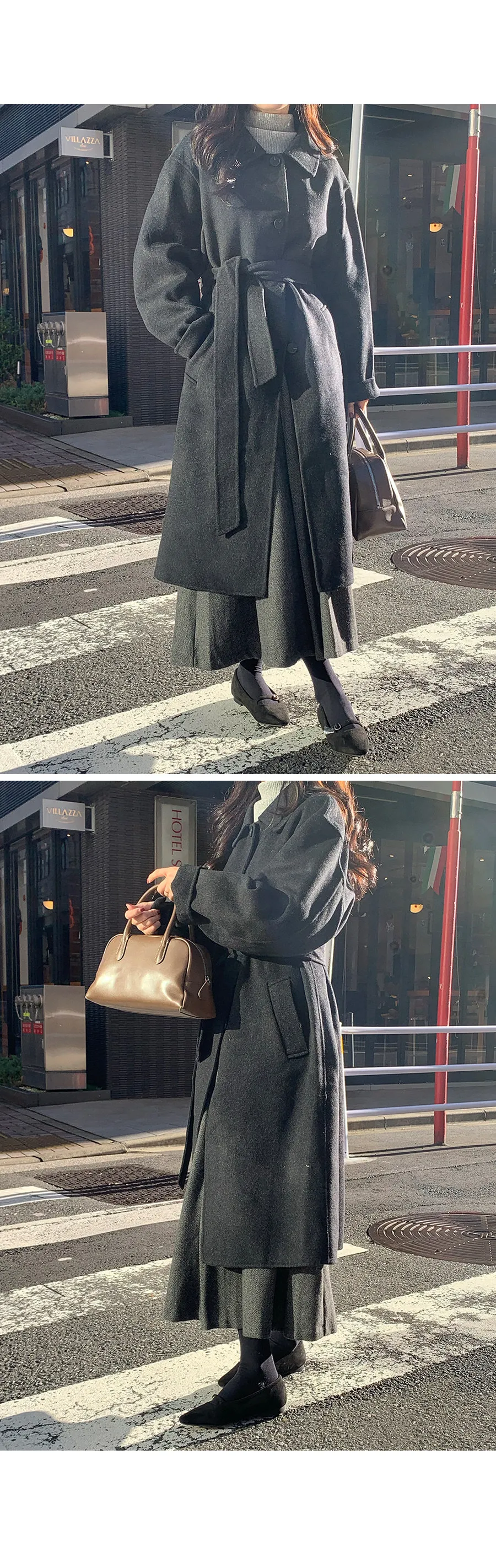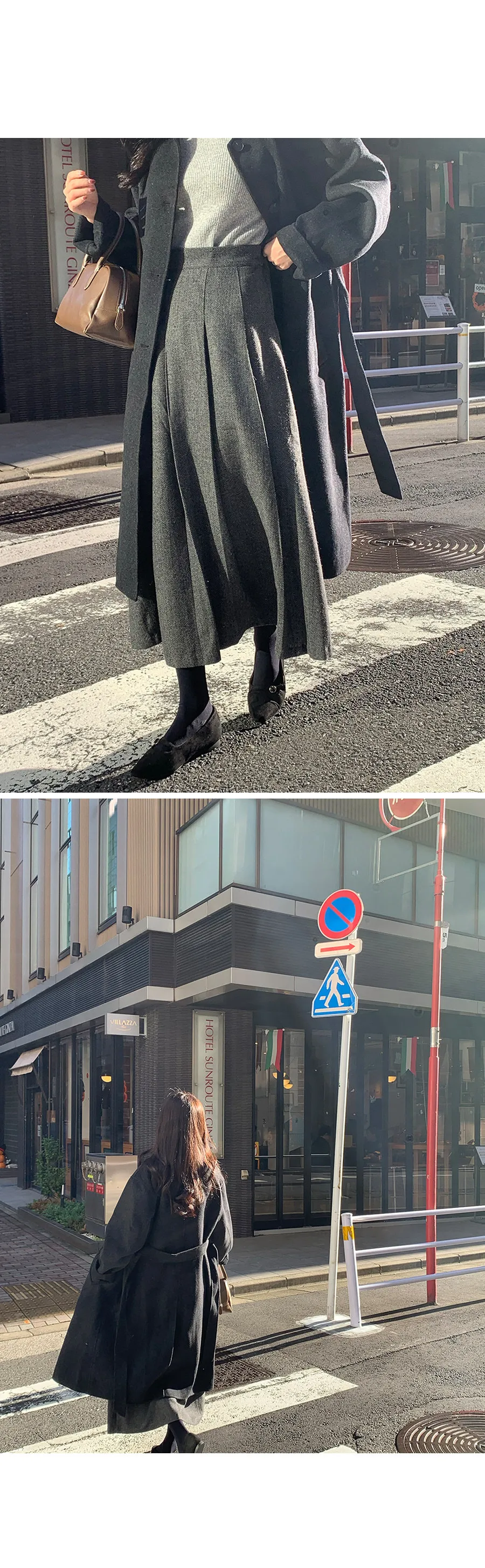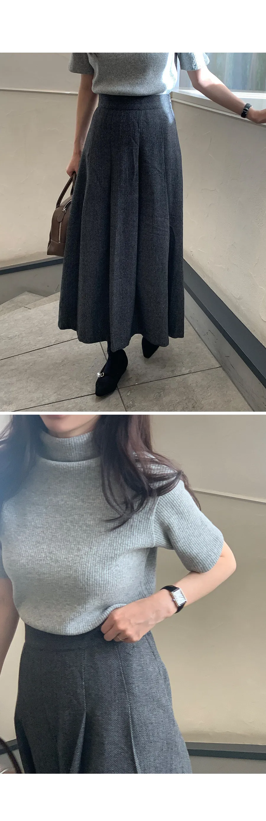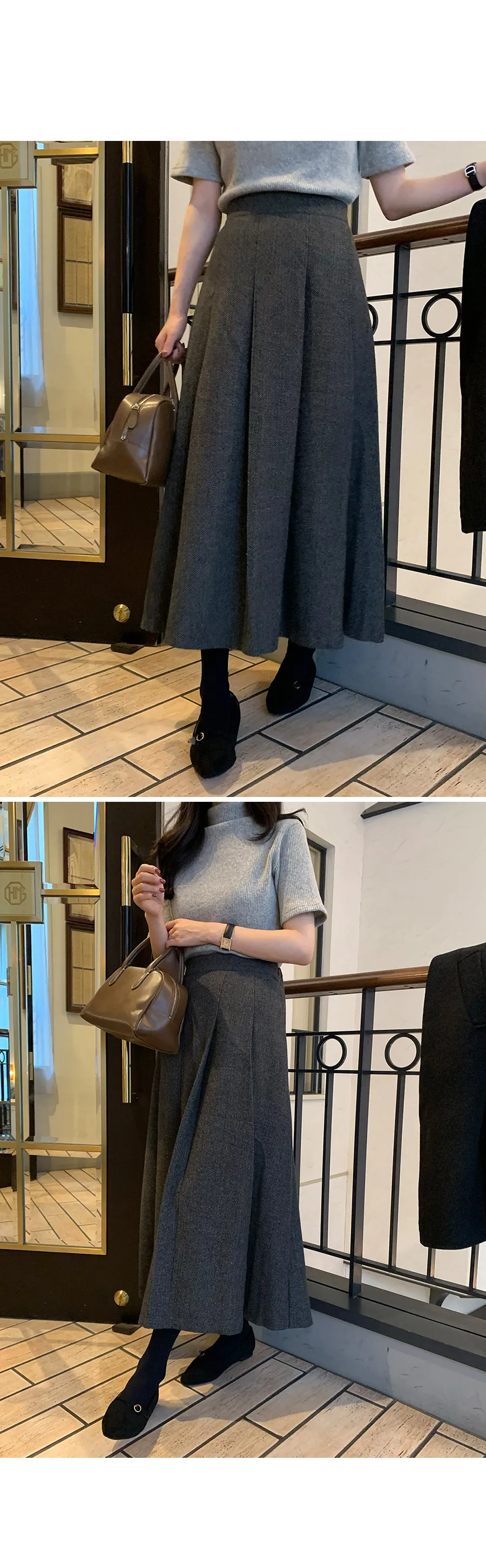 優雅針褶傘擺線條人字紋中長裙
