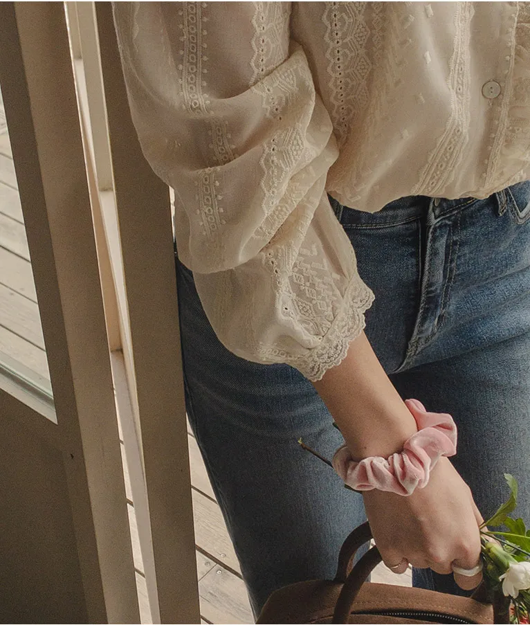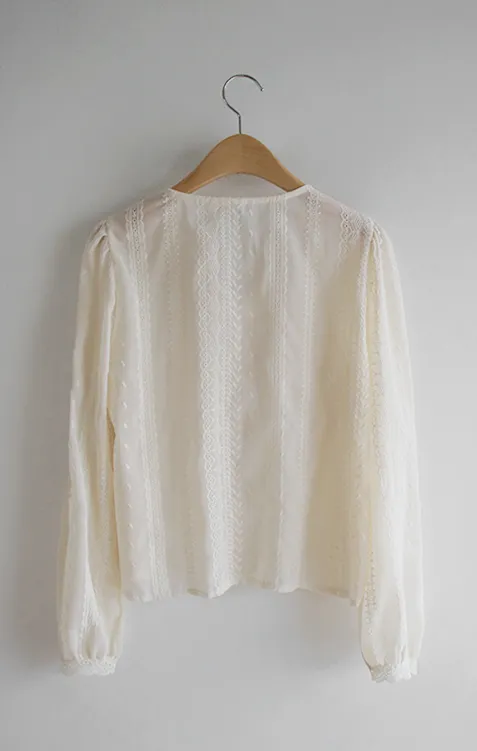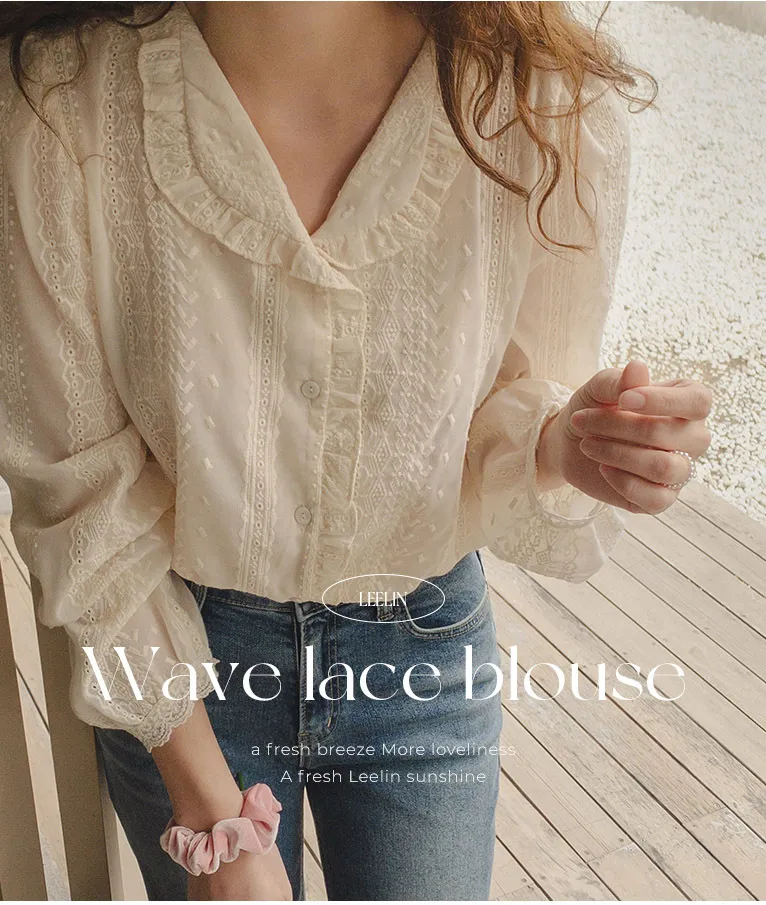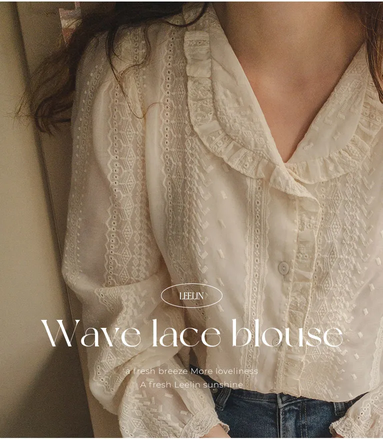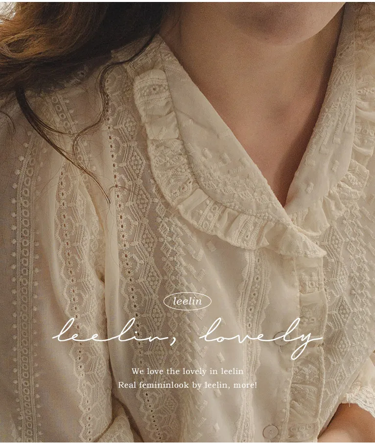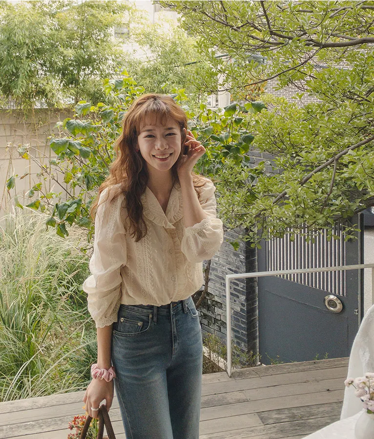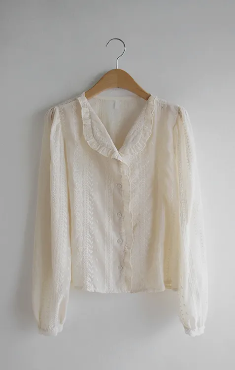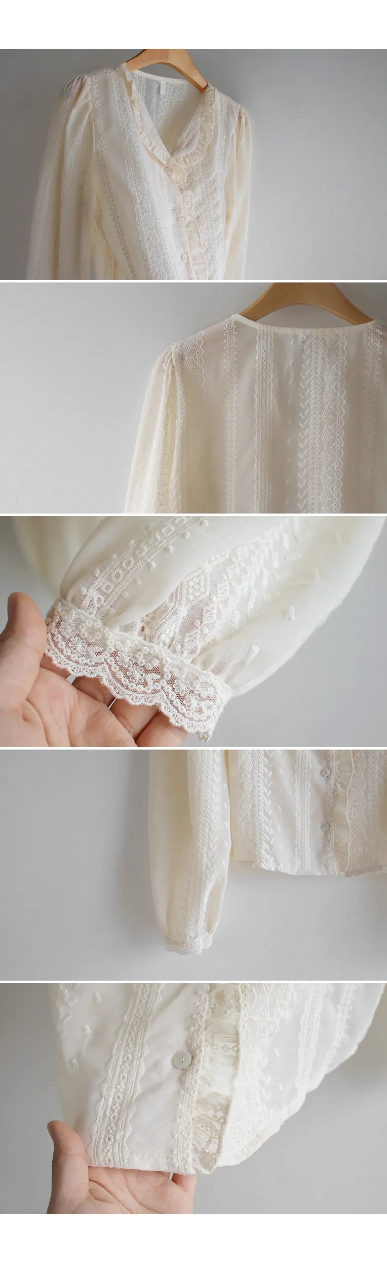 優雅精緻摺邊領蕾絲刺繡排扣上衣