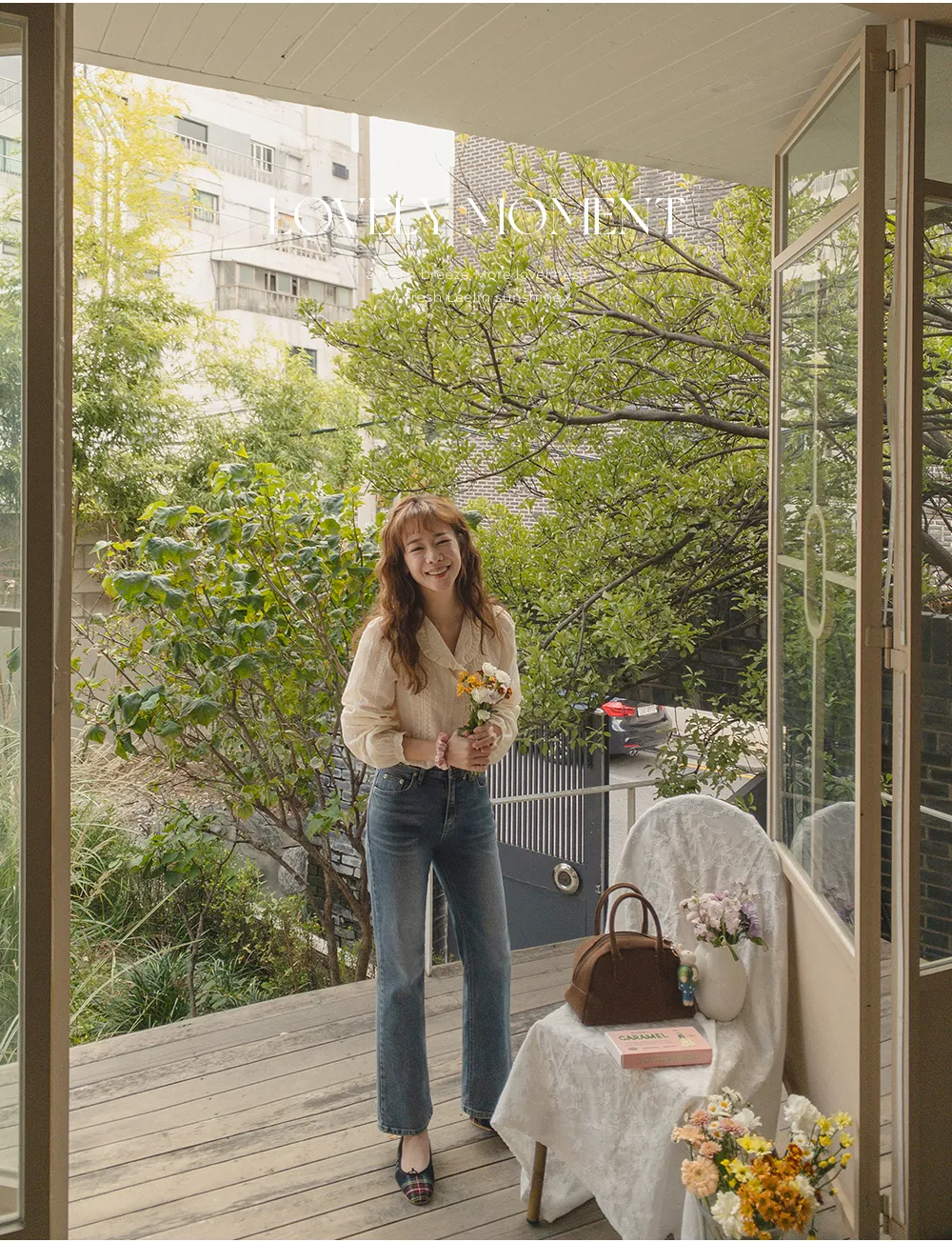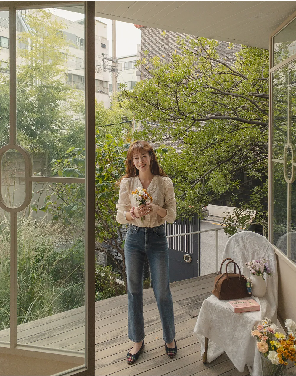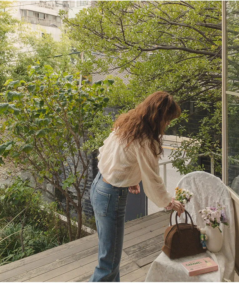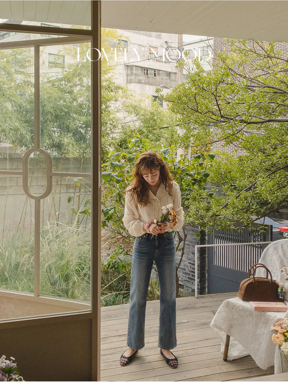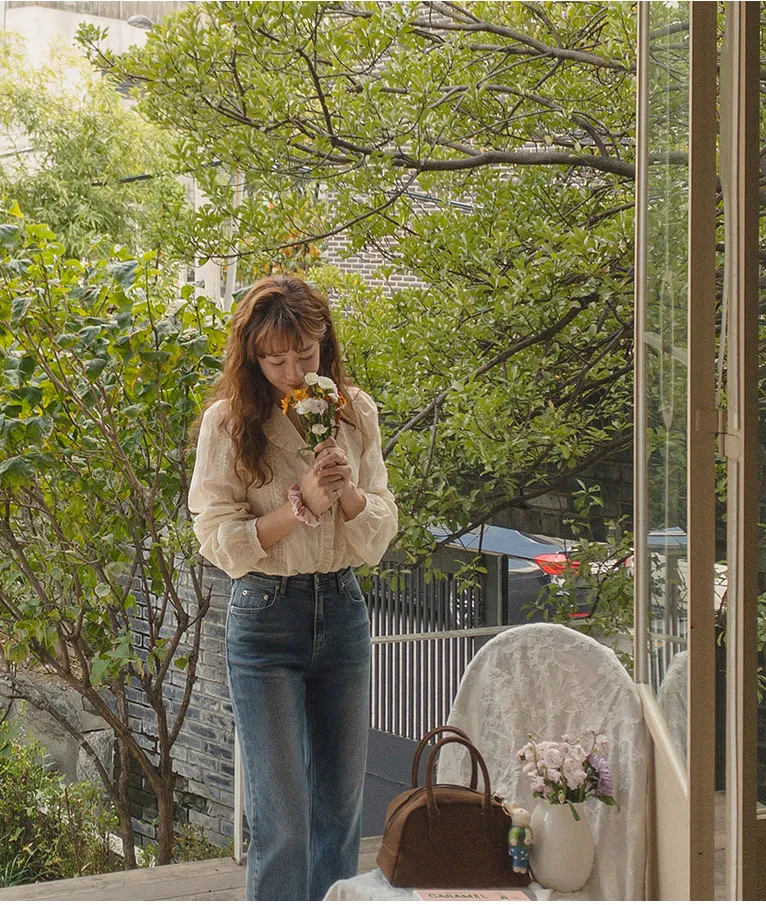 優雅精緻摺邊領蕾絲刺繡排扣上衣
