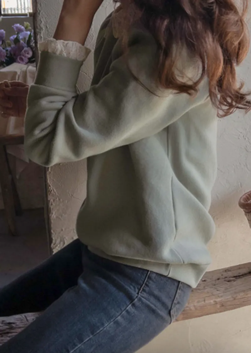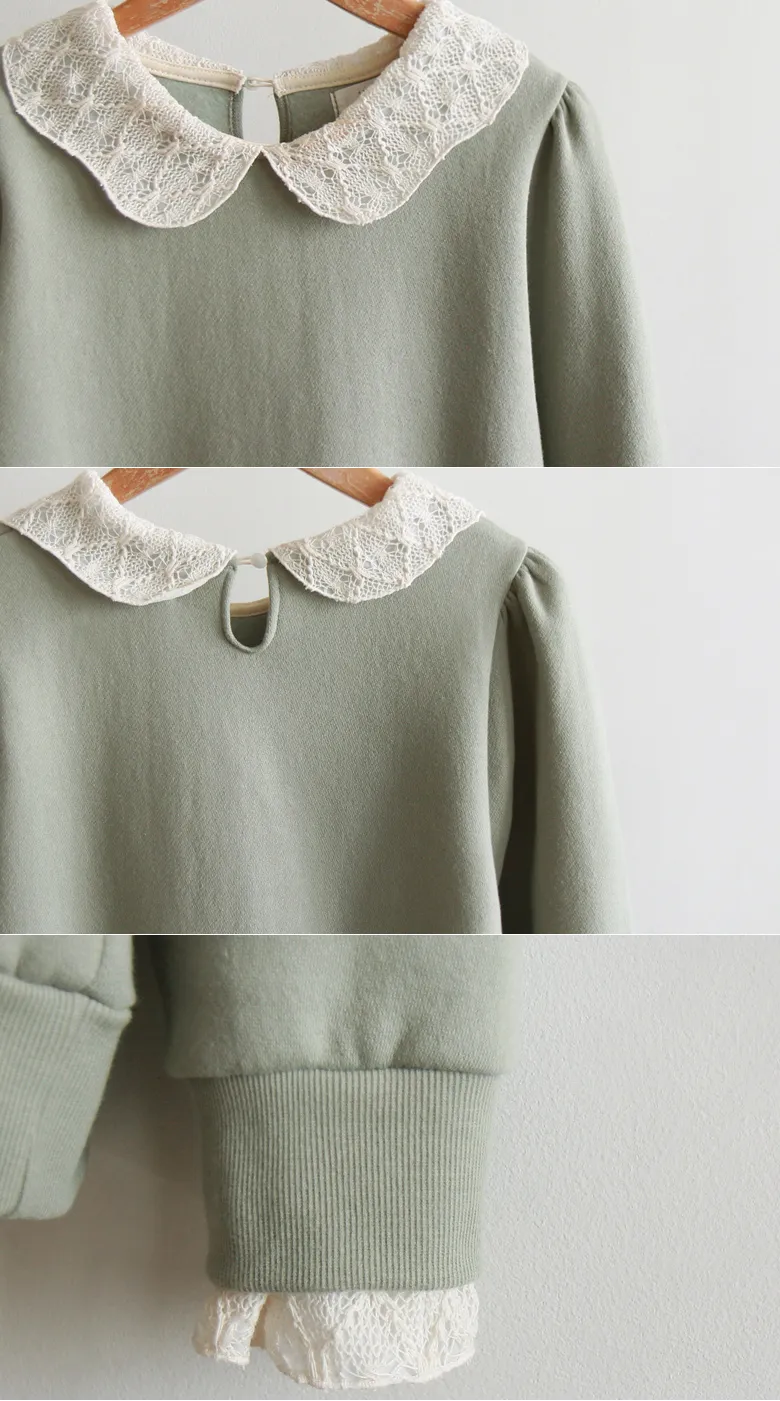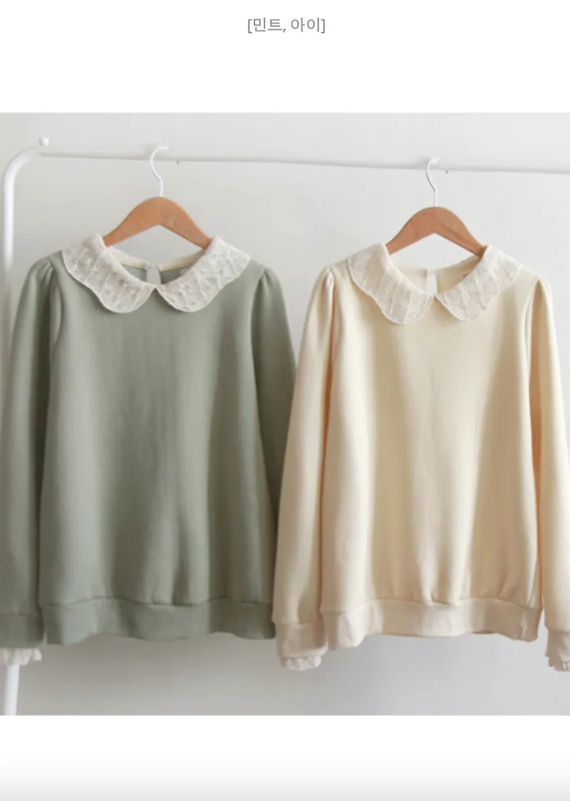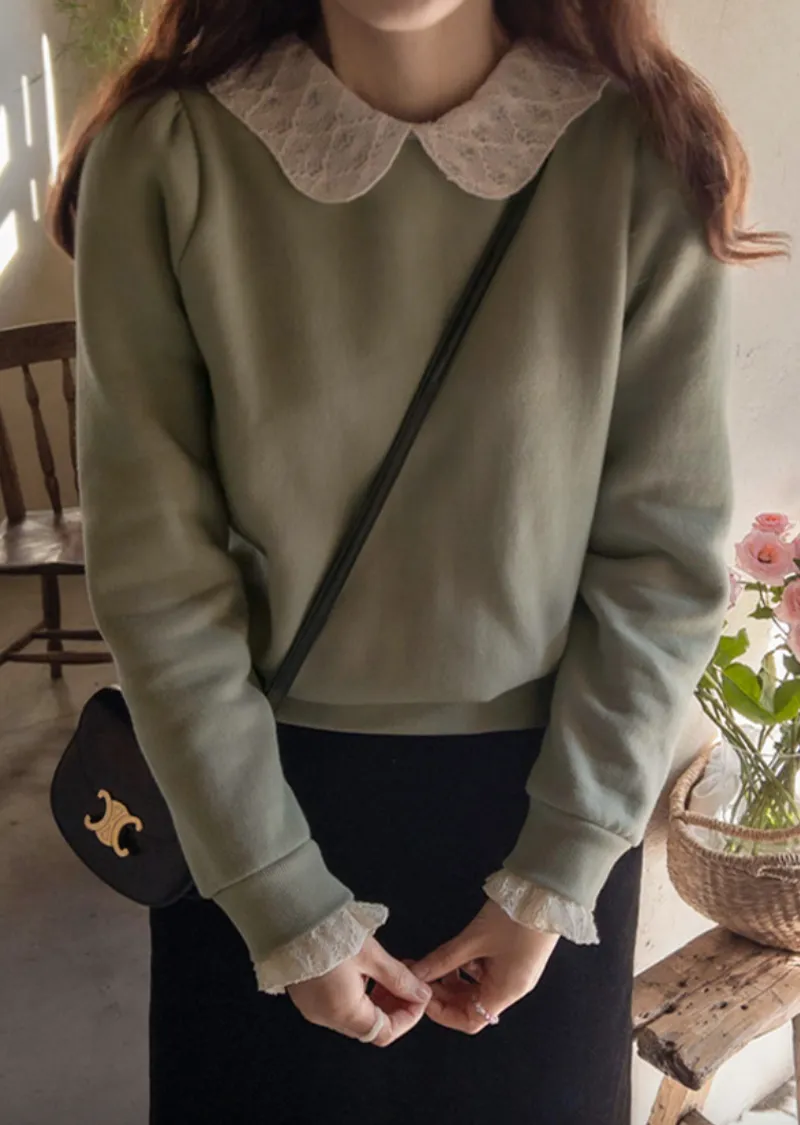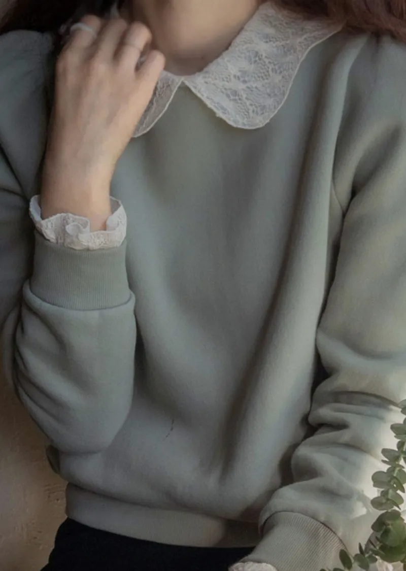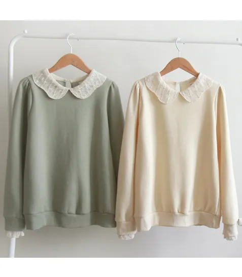 柔和色調蝴蝶蕾絲領袖末配色蕾絲柔軟刷毛上衣