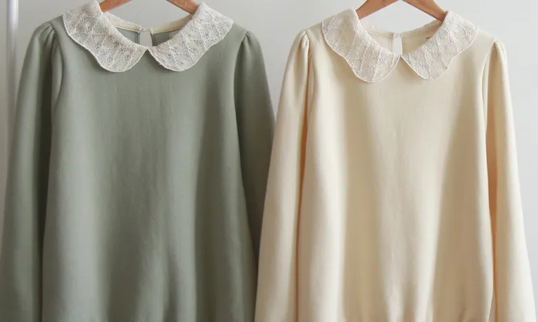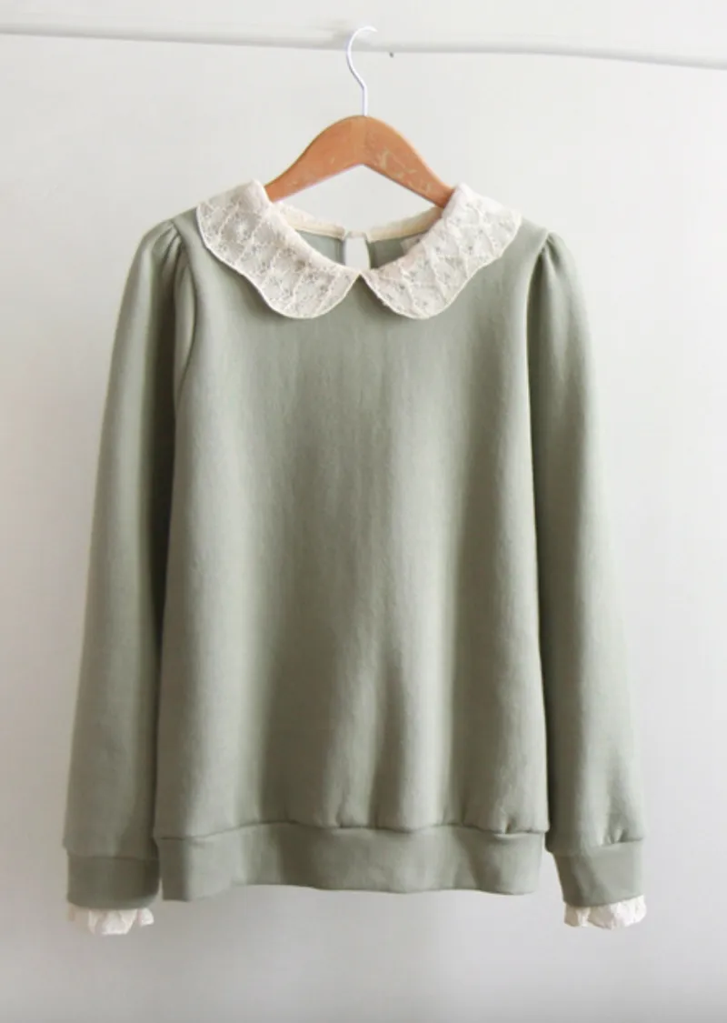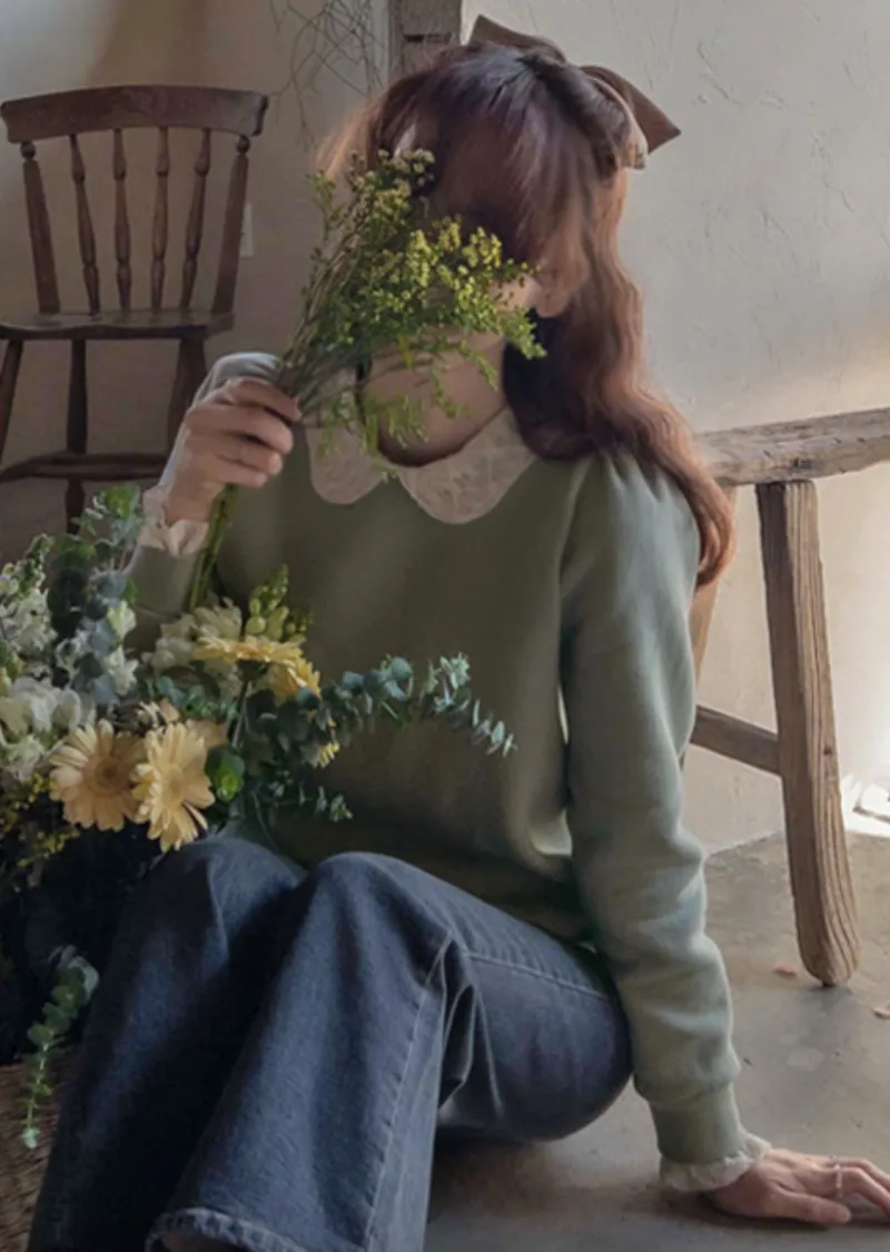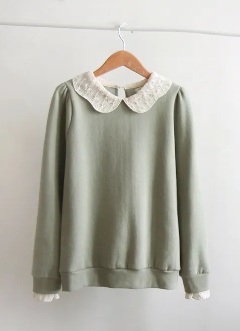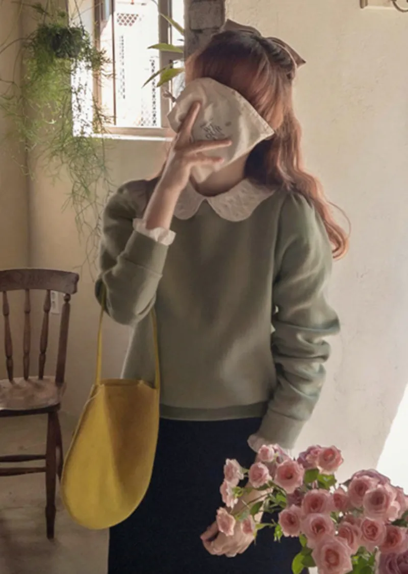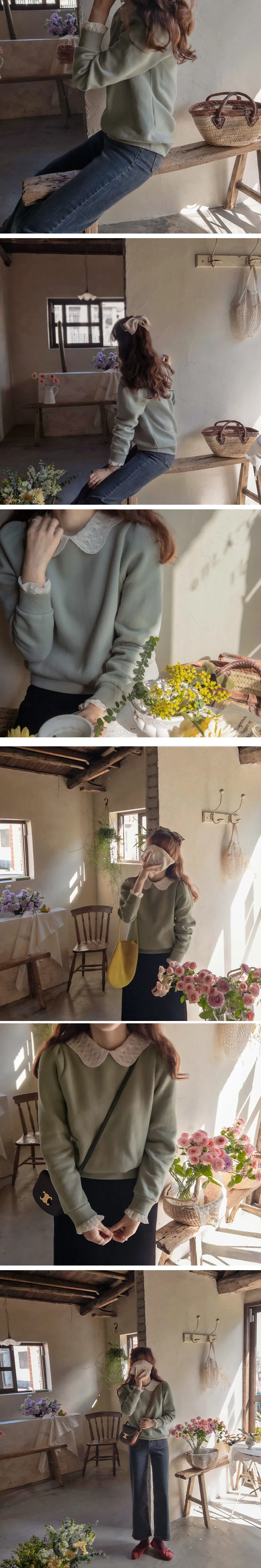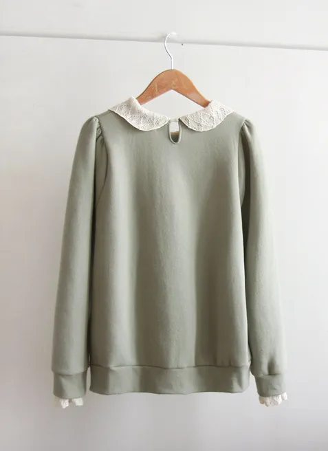 柔和色調蝴蝶蕾絲領袖末配色蕾絲柔軟刷毛上衣
