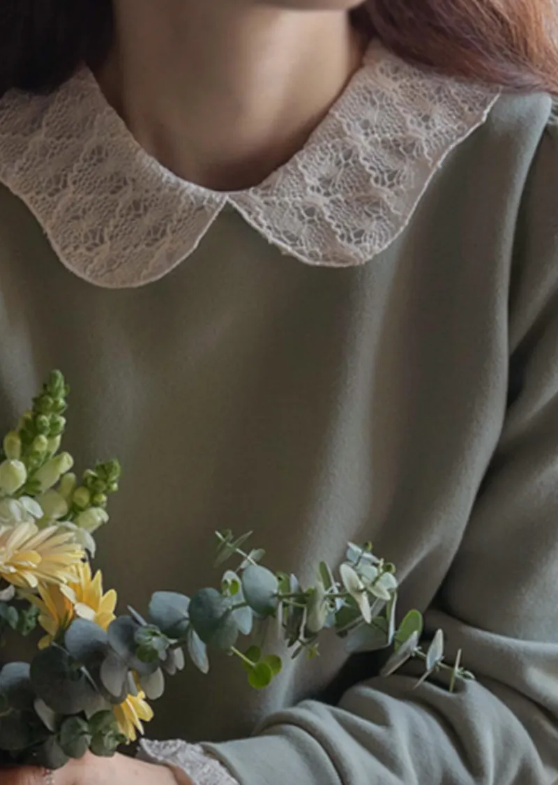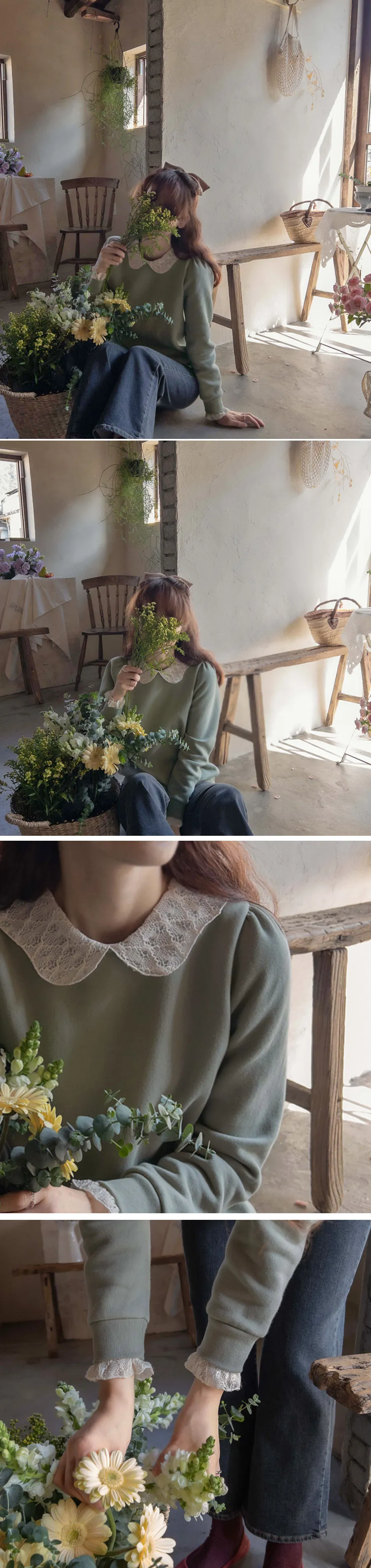 [裡料:溫暖蓬鬆的刷毛][蝴蝶形狀的蕾絲領子是亮點][柔和的色彩給人一種季節感][袖子剪裁有女人味蕾絲配色的感覺][肩部剪裁也很漂亮][柔軟的拉絨溫暖上衣