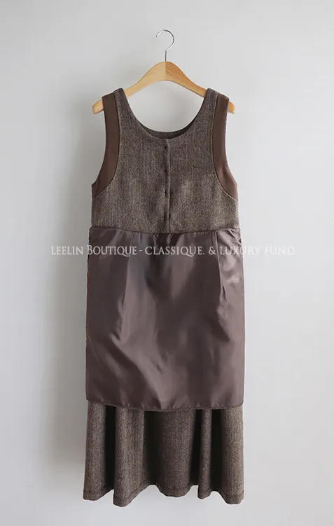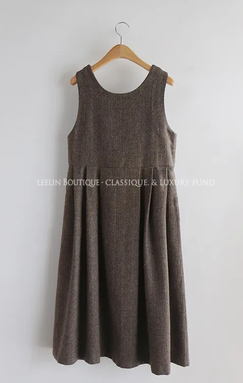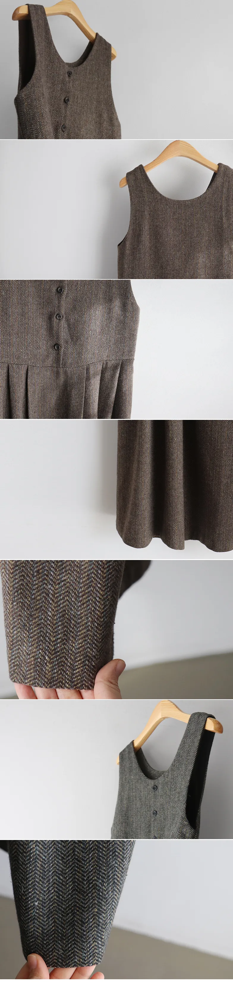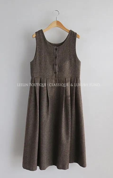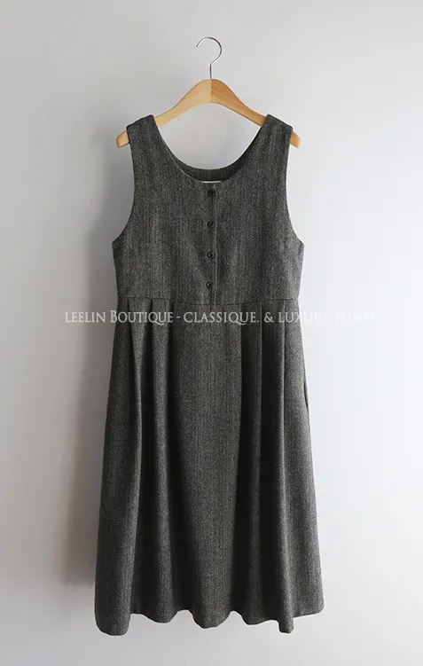 前後兩穿排扣細摺人字紋連身裙