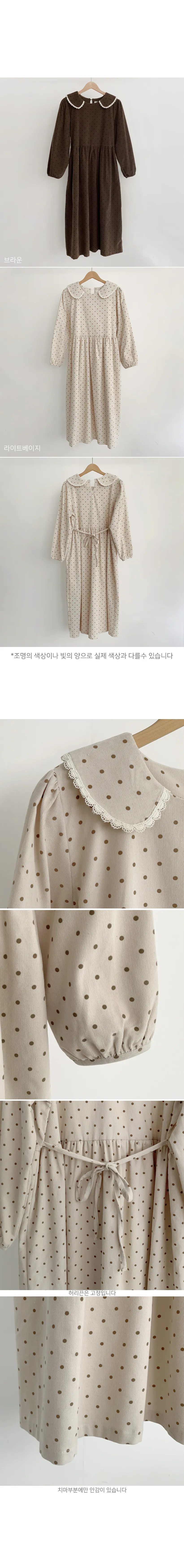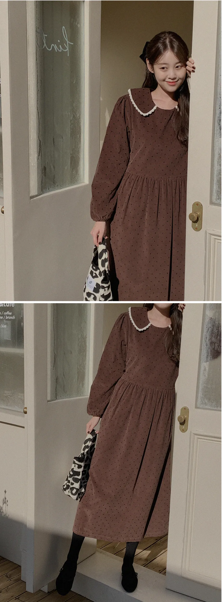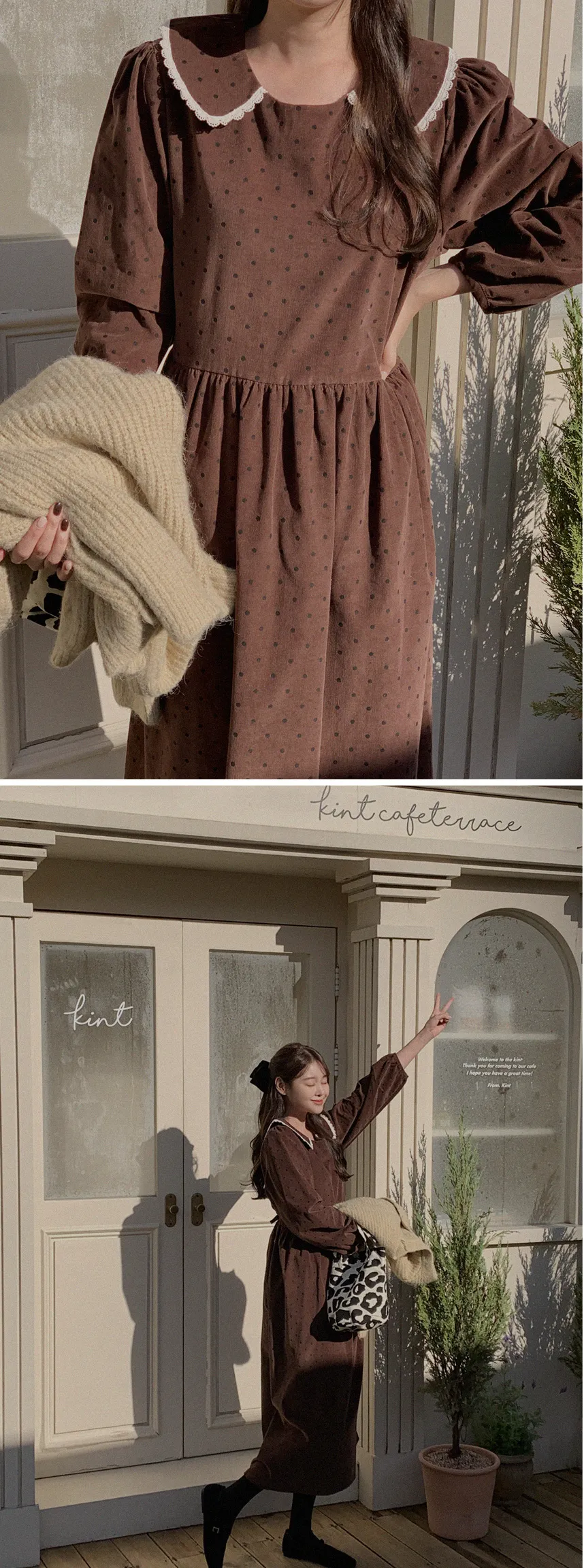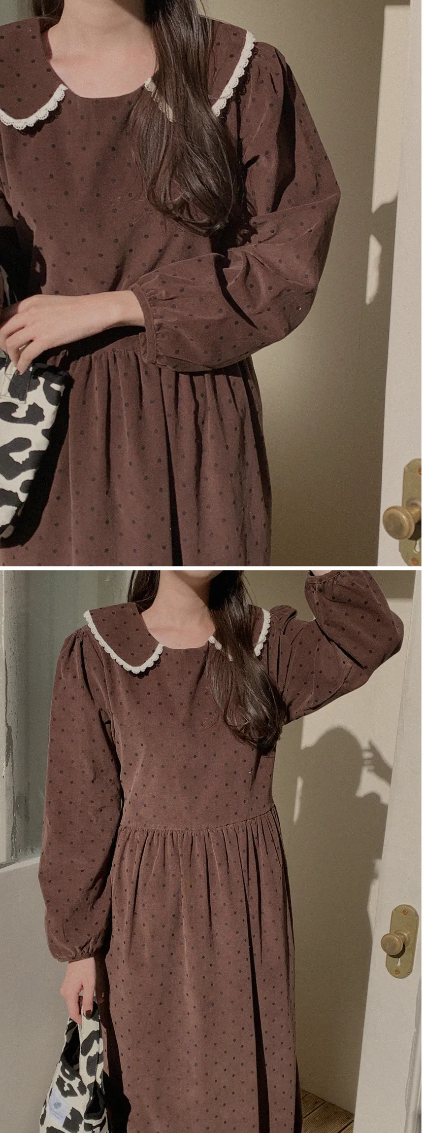 可愛蕾絲平領柔和燈芯絨點點連身裙