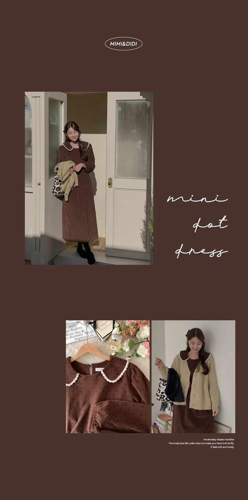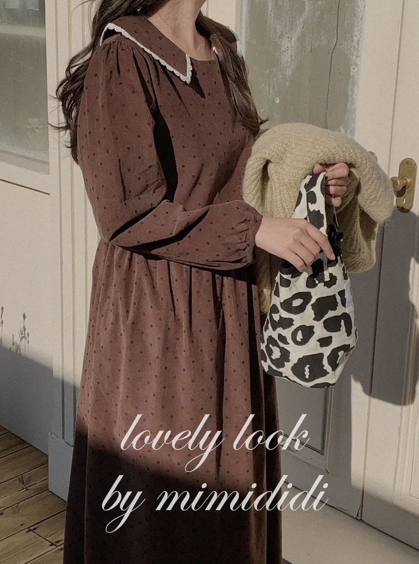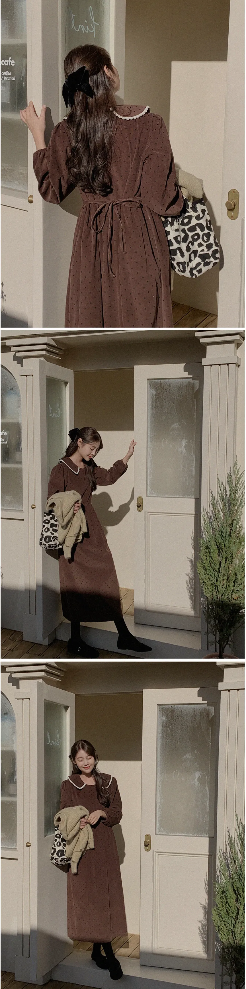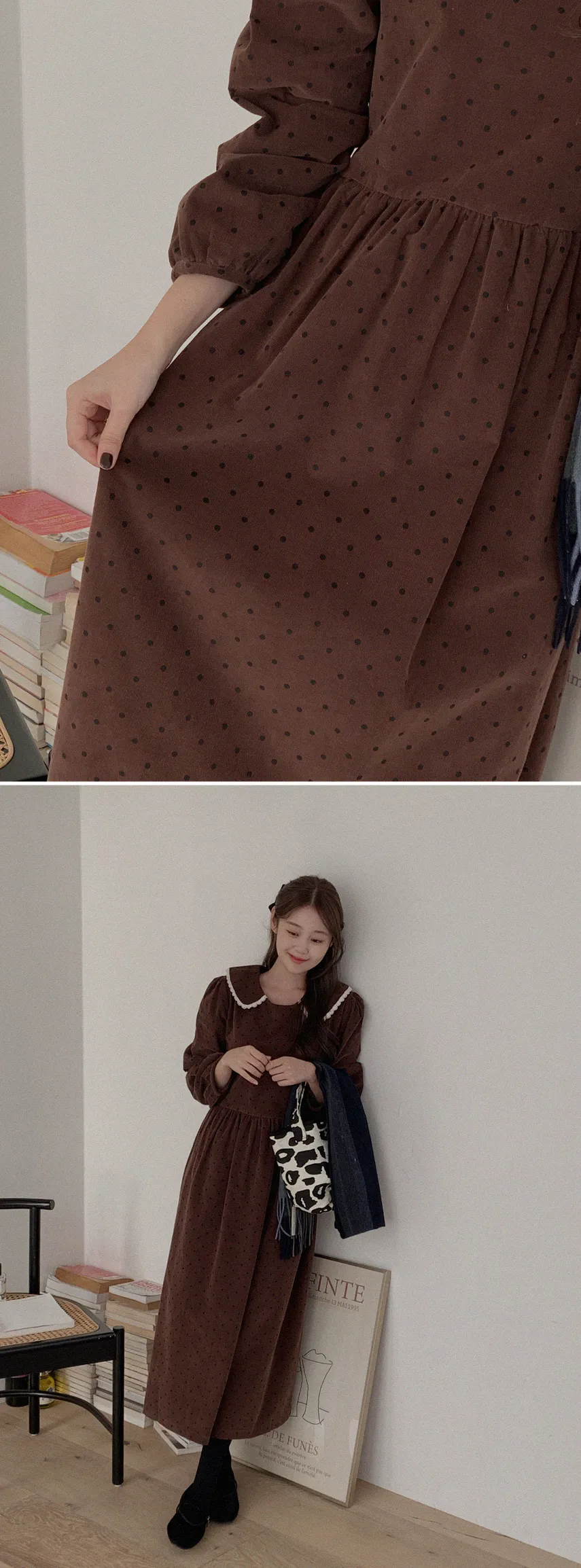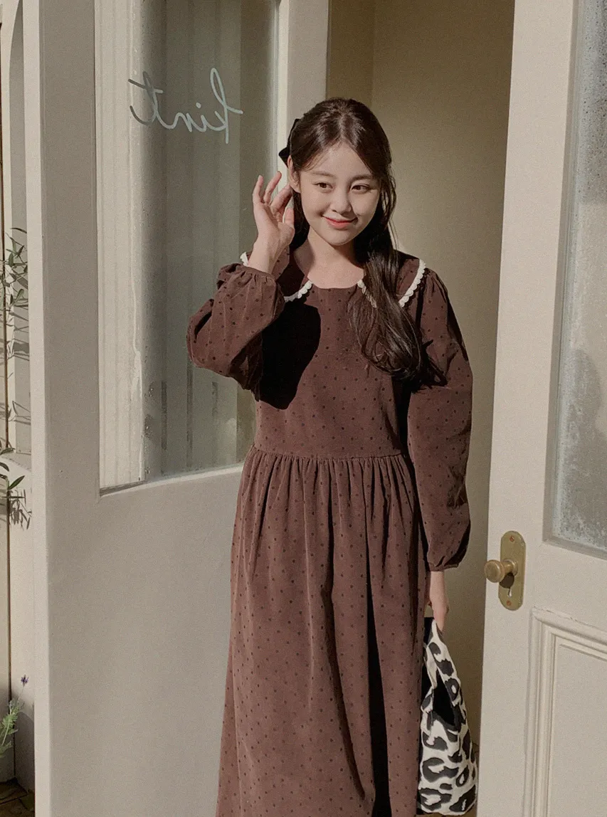 可愛蕾絲平領柔和燈芯絨點點連身裙