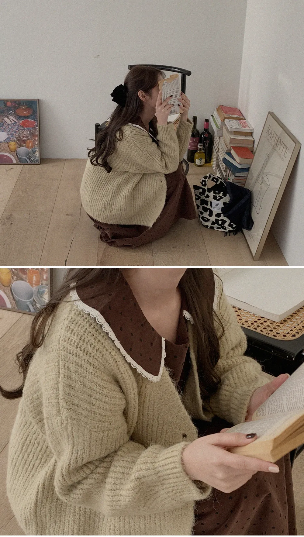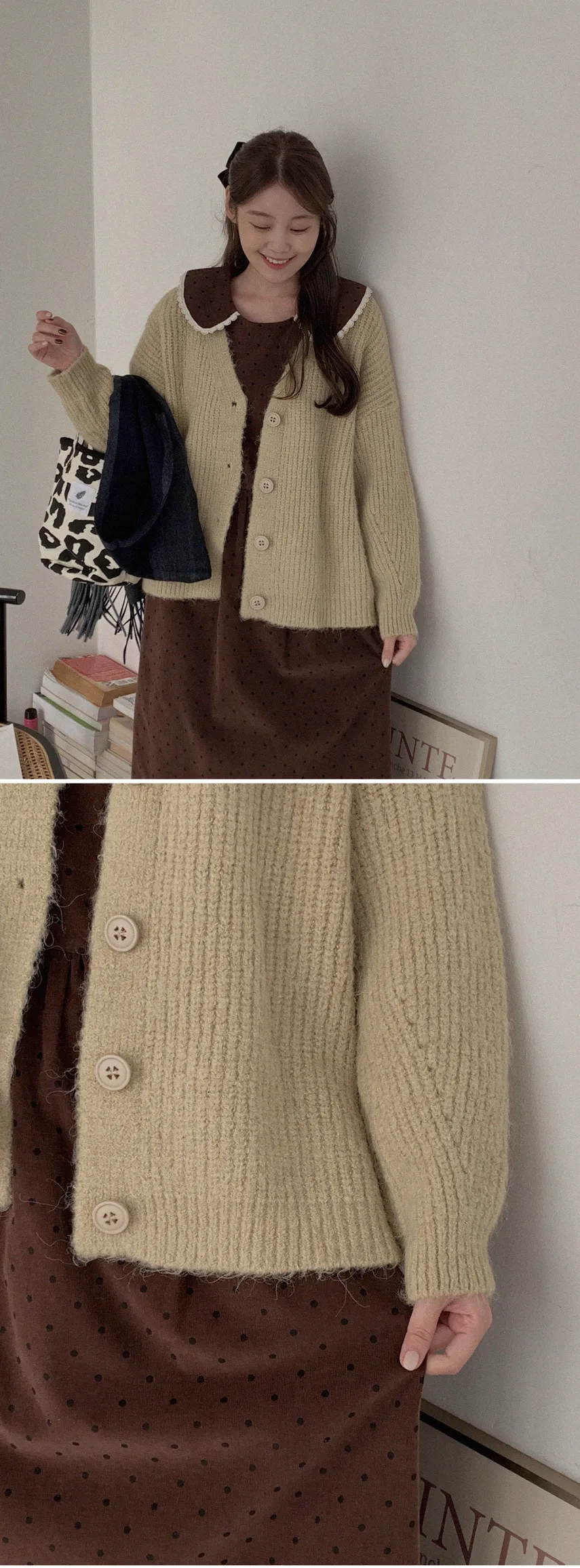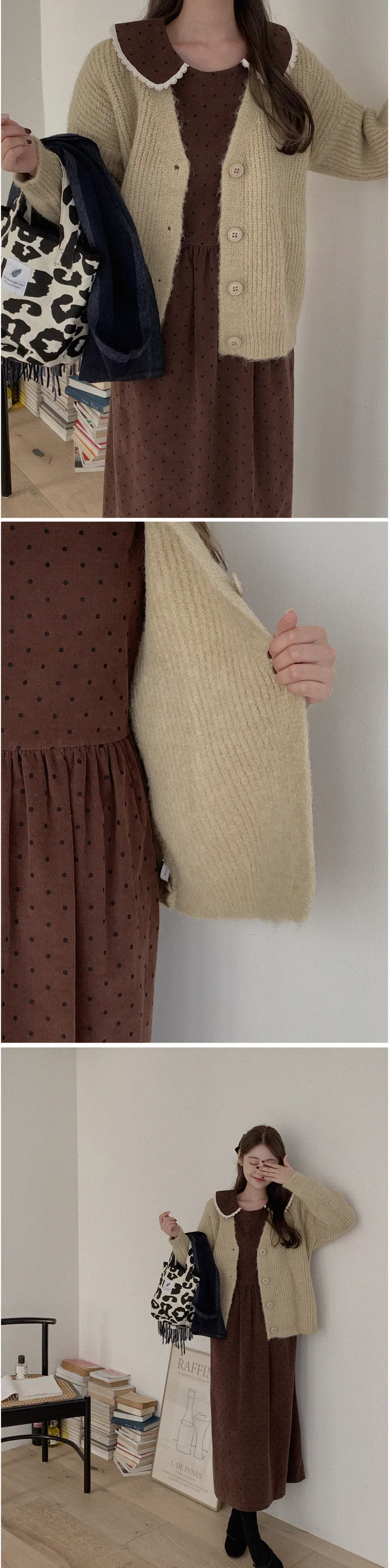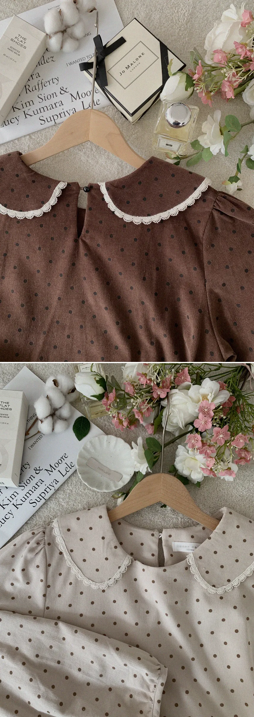 可愛蕾絲平領柔和燈芯絨點點連身裙