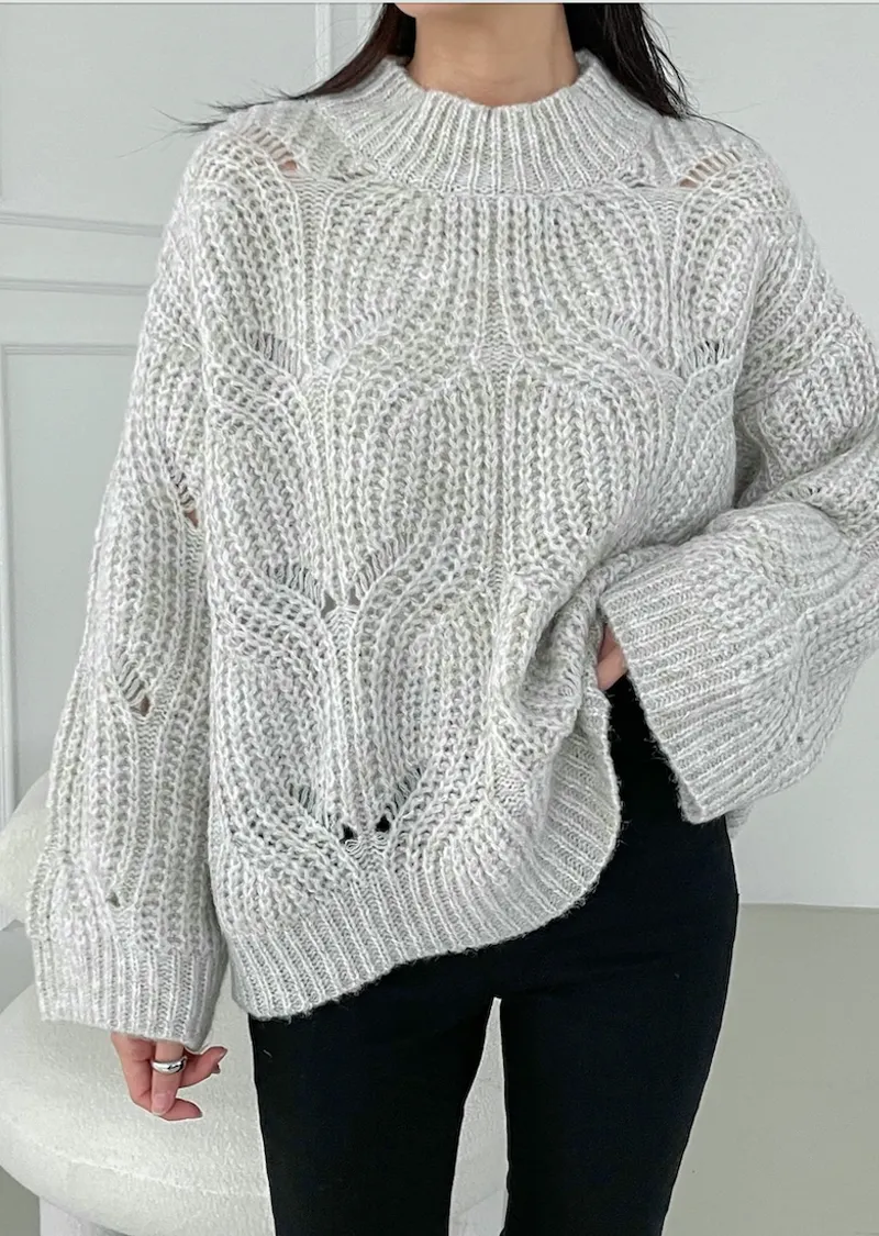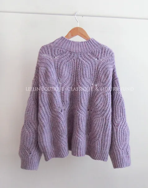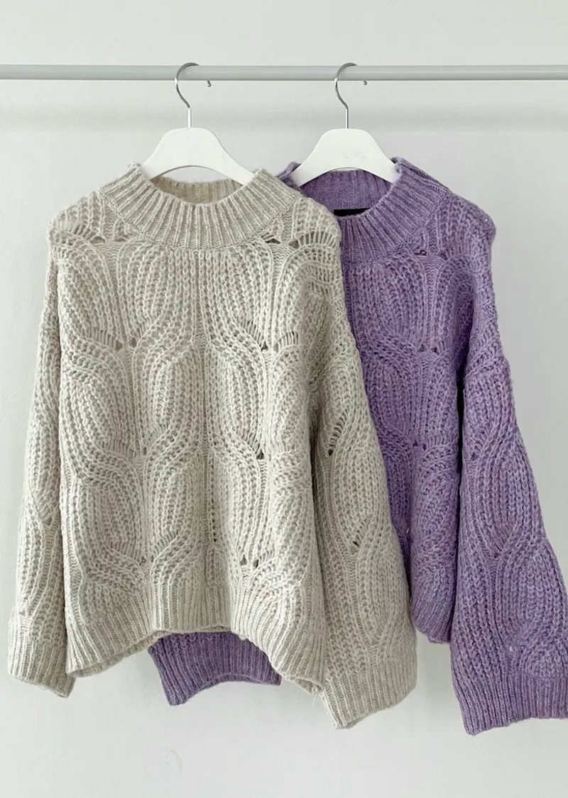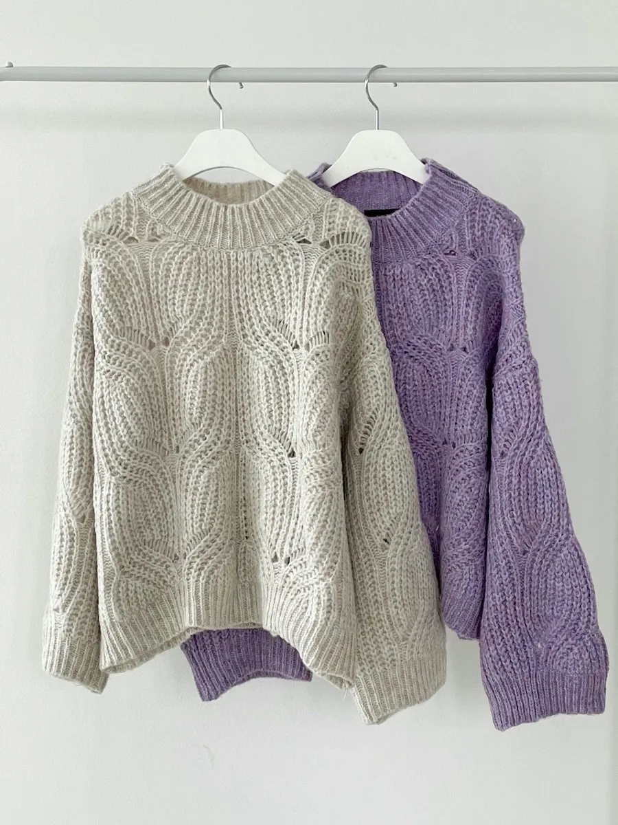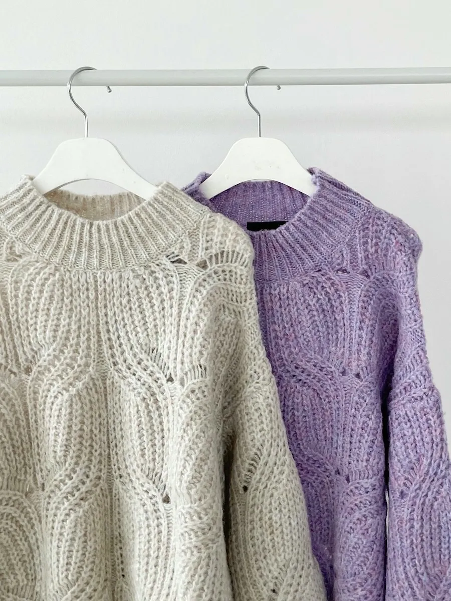 [含有 60% 羊毛] [下擺有漂亮的微妙波浪形狀] [寬鬆輪廓針織,帶有扭曲圖案] [柔和的顏色]
