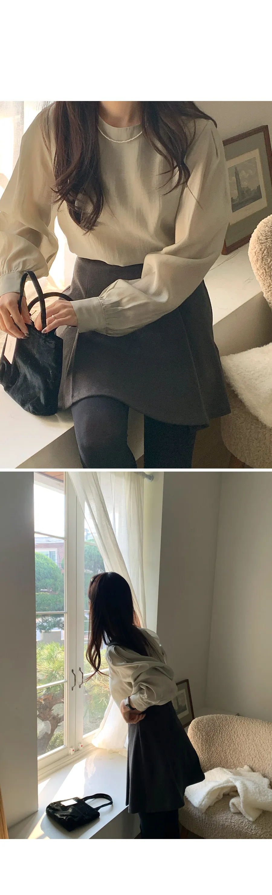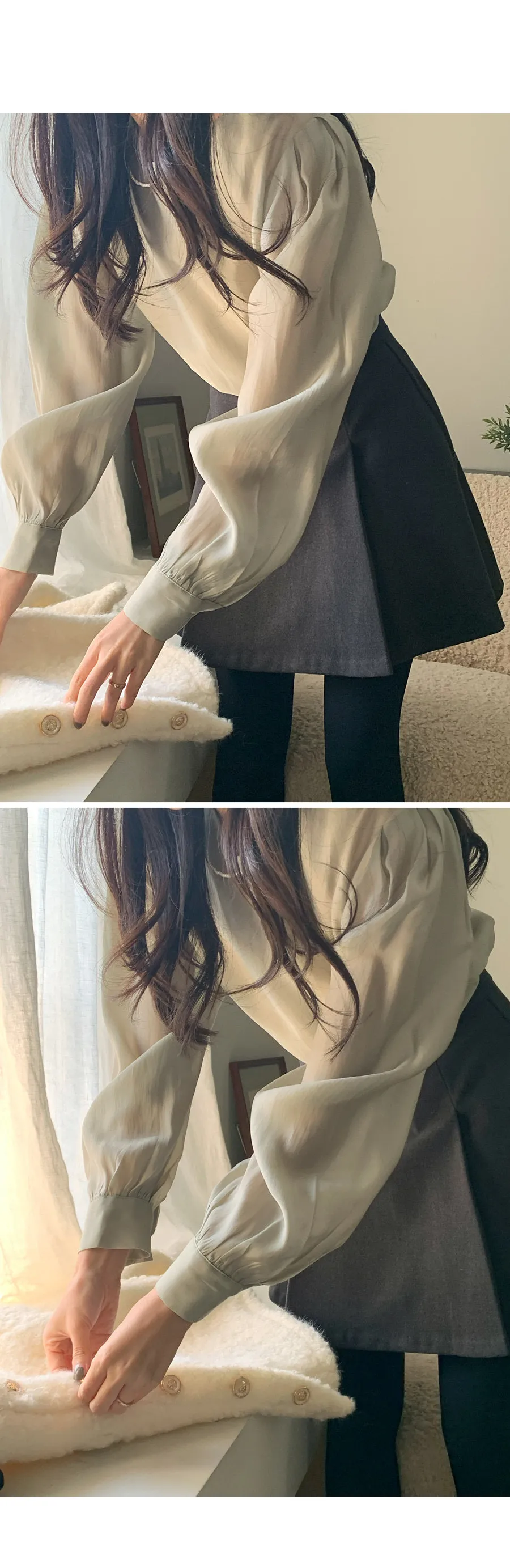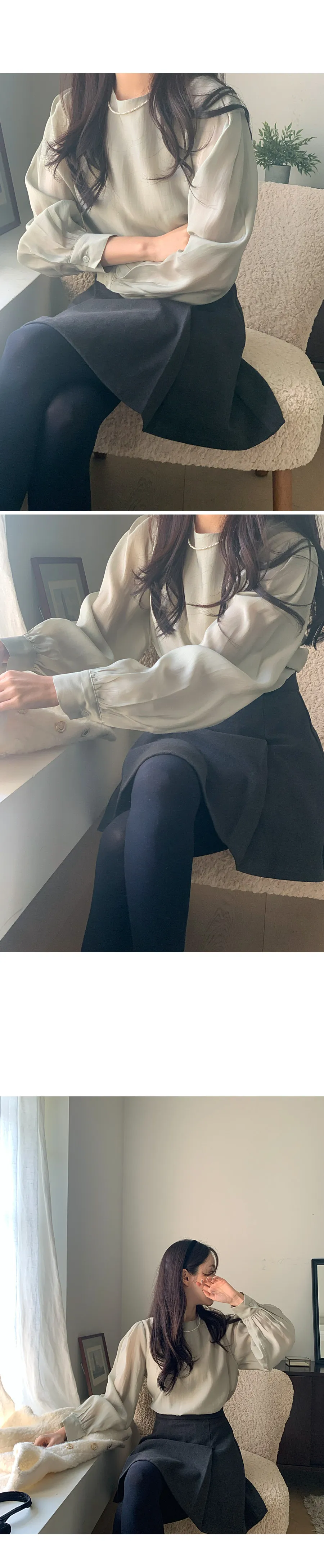 柔美圓領肩部泡泡褶皺飄逸絲質上衣