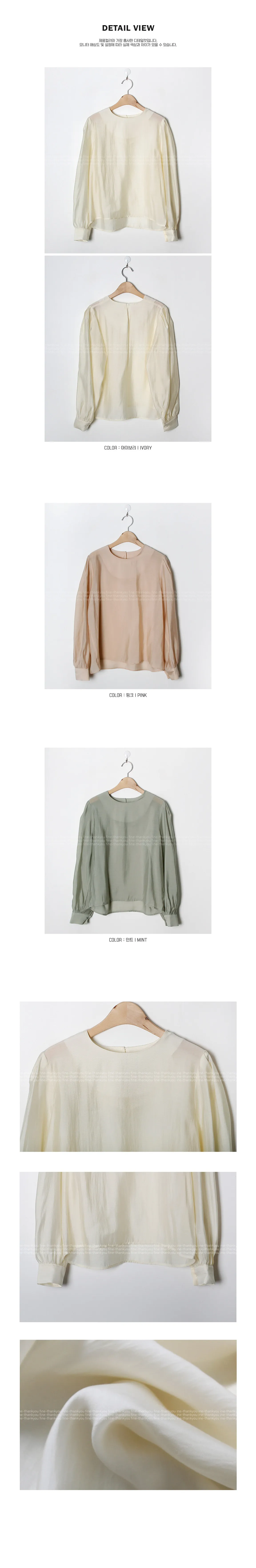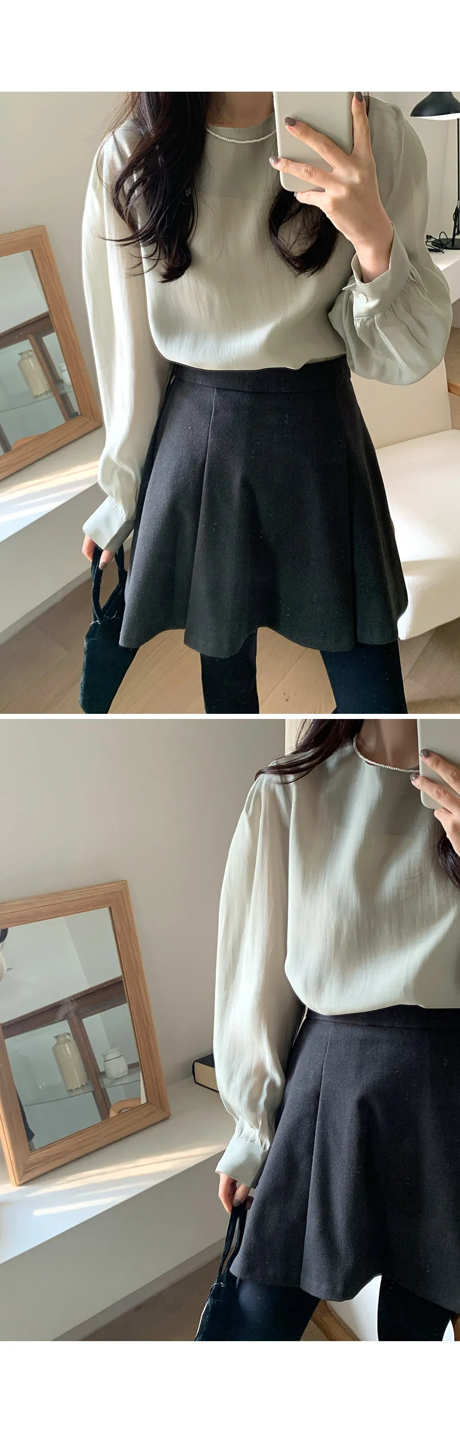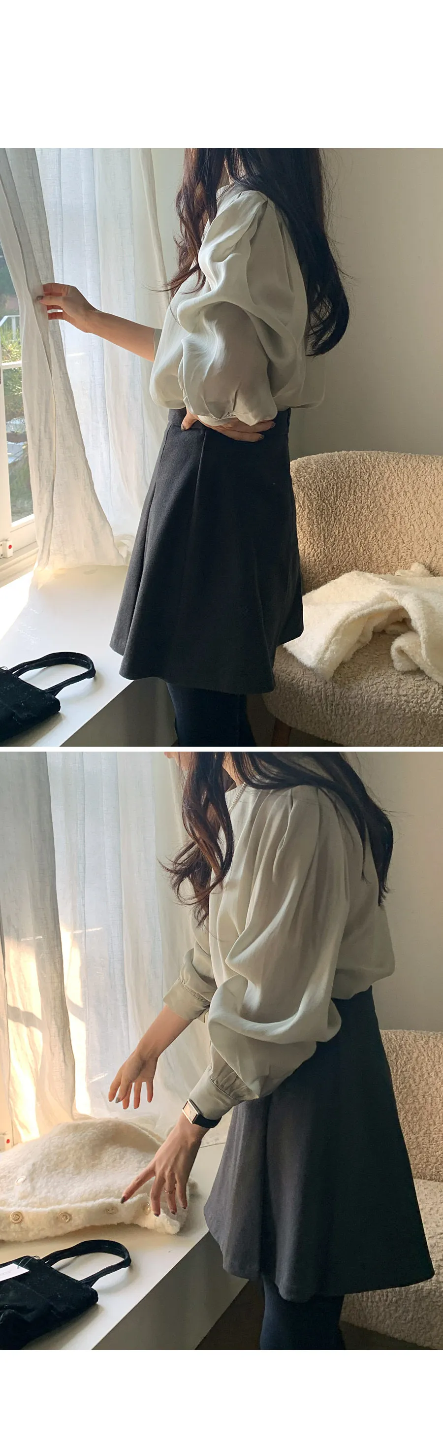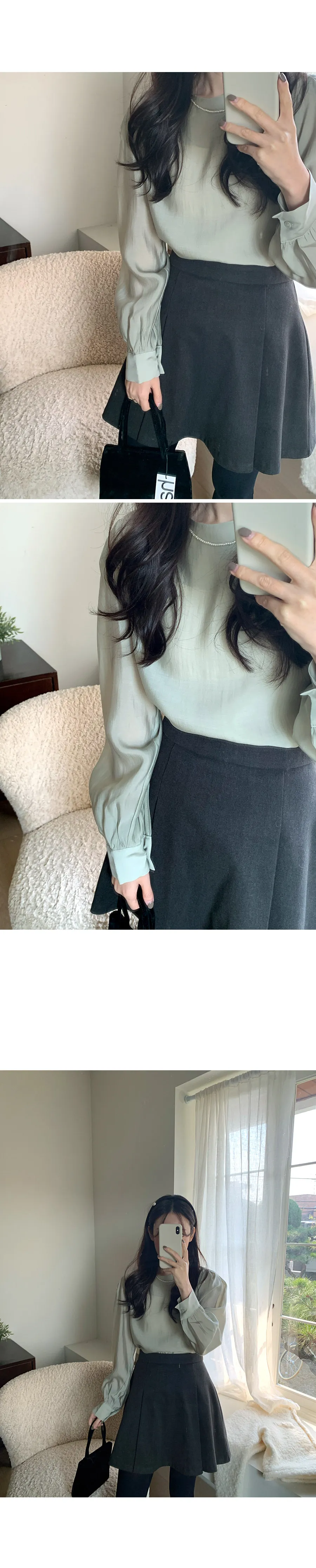 柔美圓領肩部泡泡褶皺飄逸絲質上衣