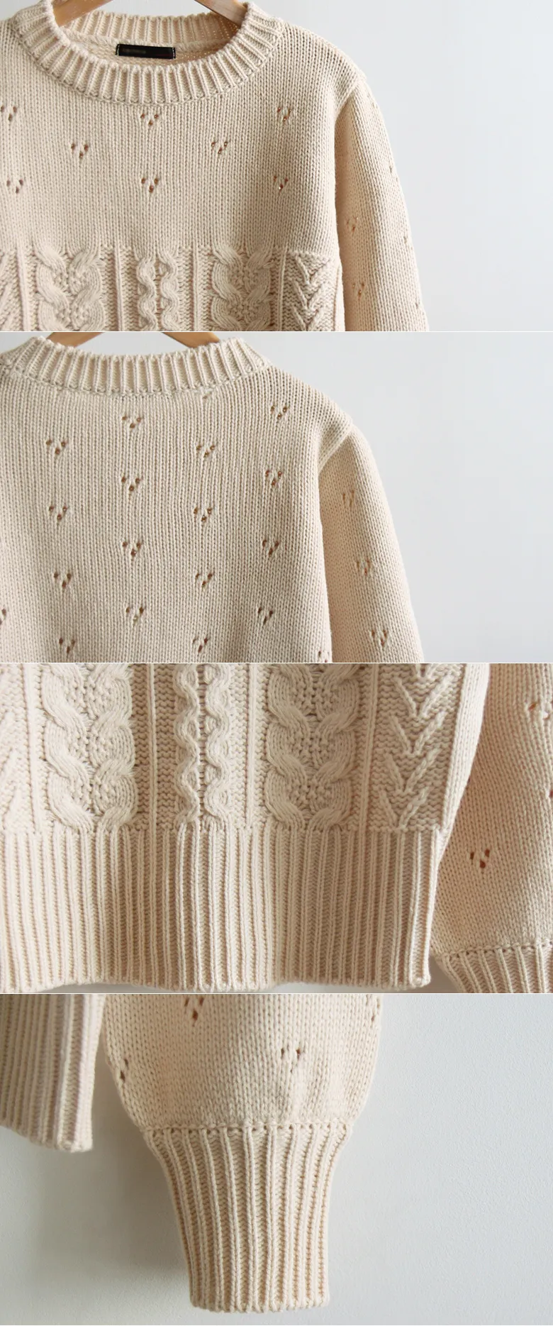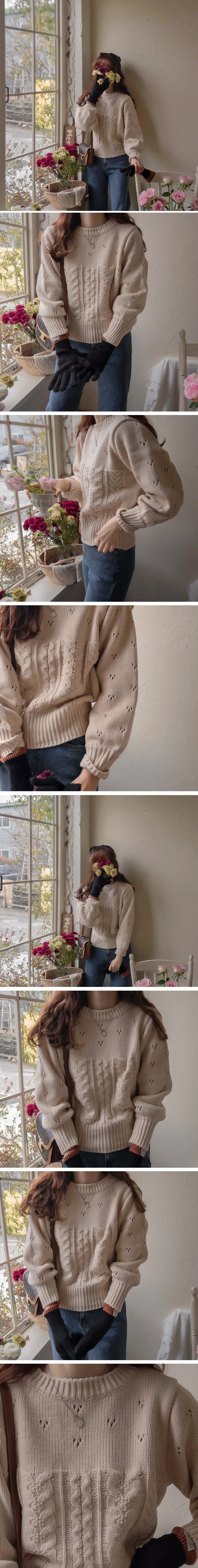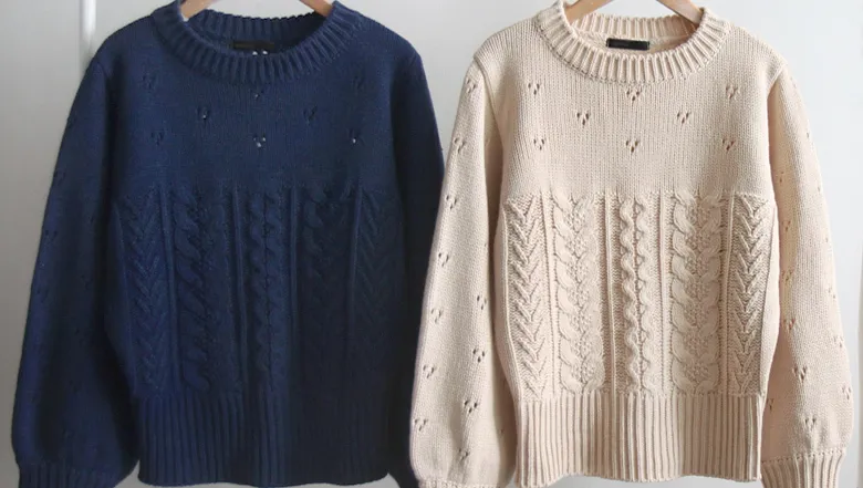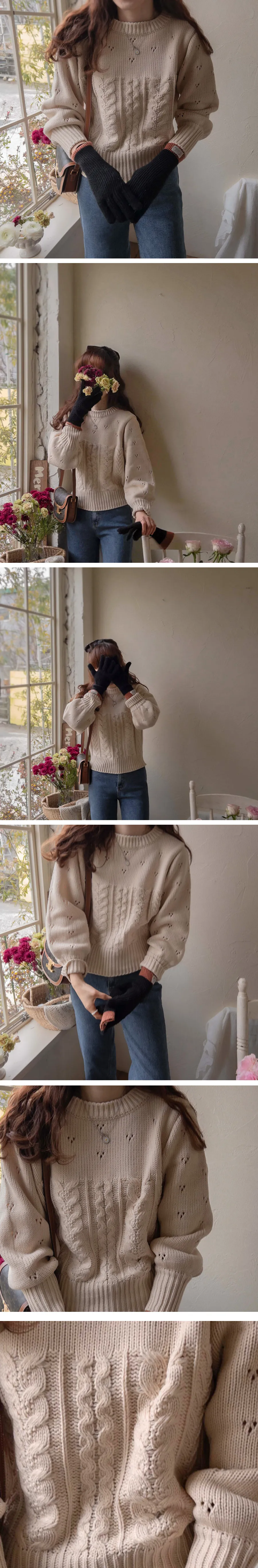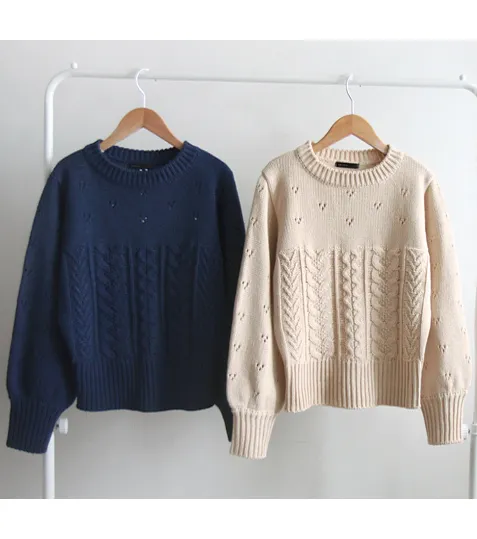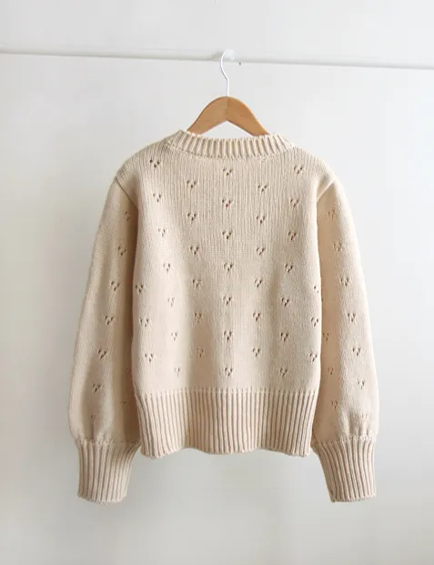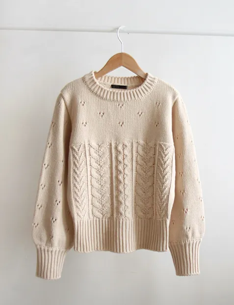 【蘇格蘭針織,柔軟合身】【扭紋圖案充滿活力】【圓領打孔,打造可愛風格】【泡泡袖,精緻感】【推薦時尚款針織上衣