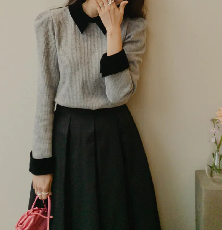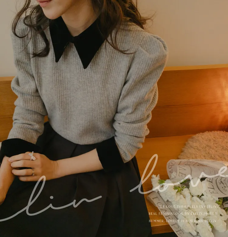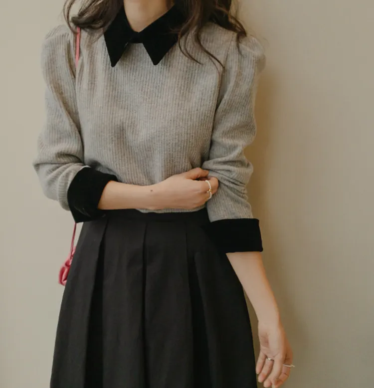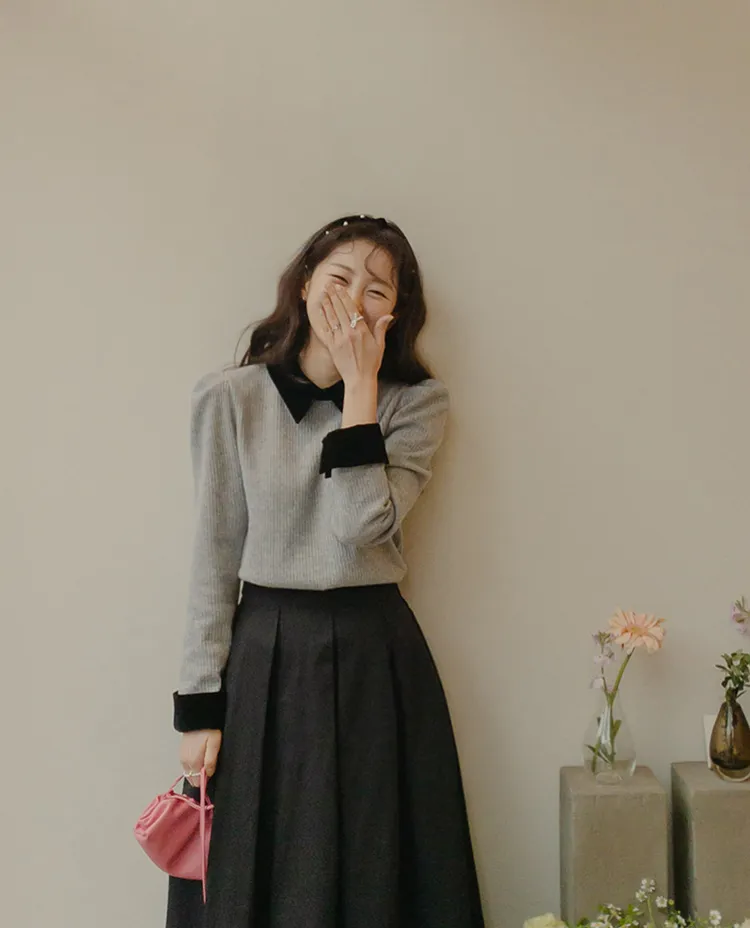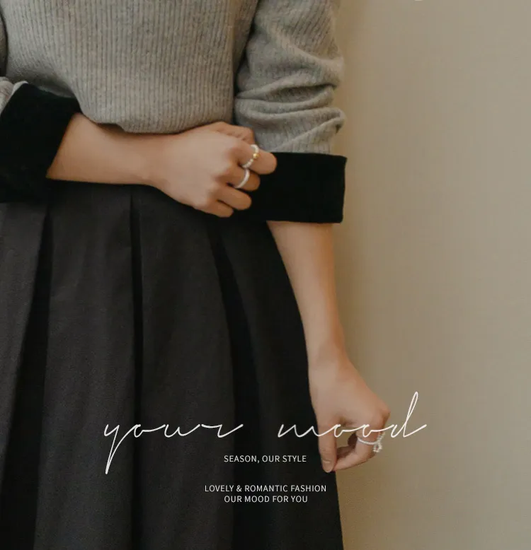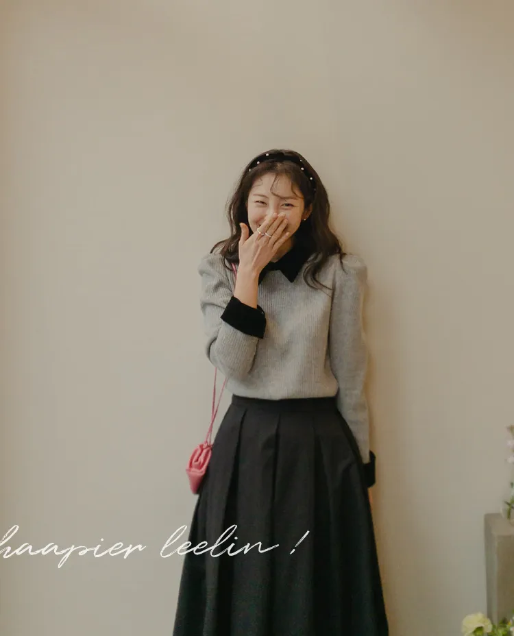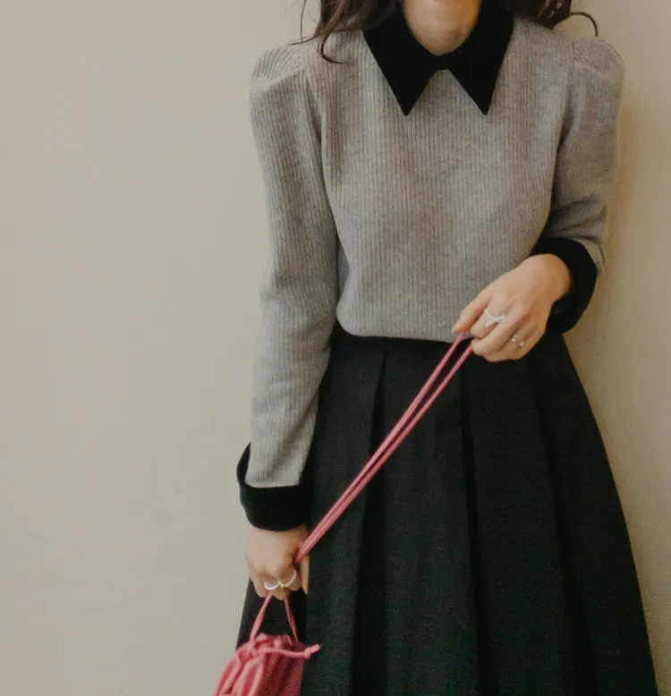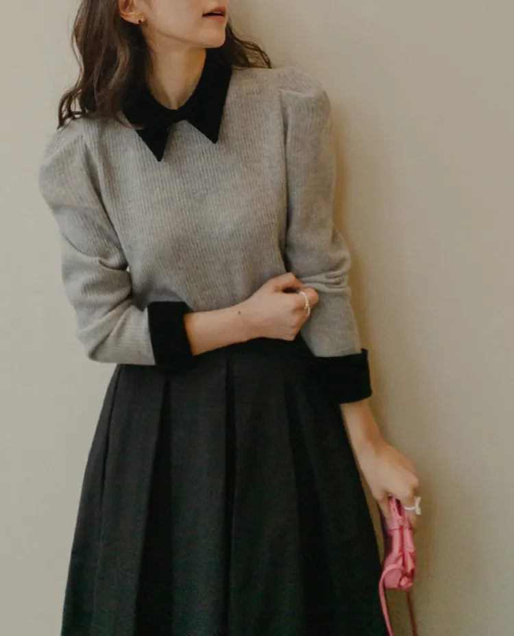 [色彩羅紋針織,乾淨俐落、現代感][彩色,袖子末端的天鵝絨袖口設計,打造精緻設計][肩部褶皺和針褶,打造可愛的肩線♡][包含一個一點點羊毛保暖][只需一件即可完成時尚服裝]