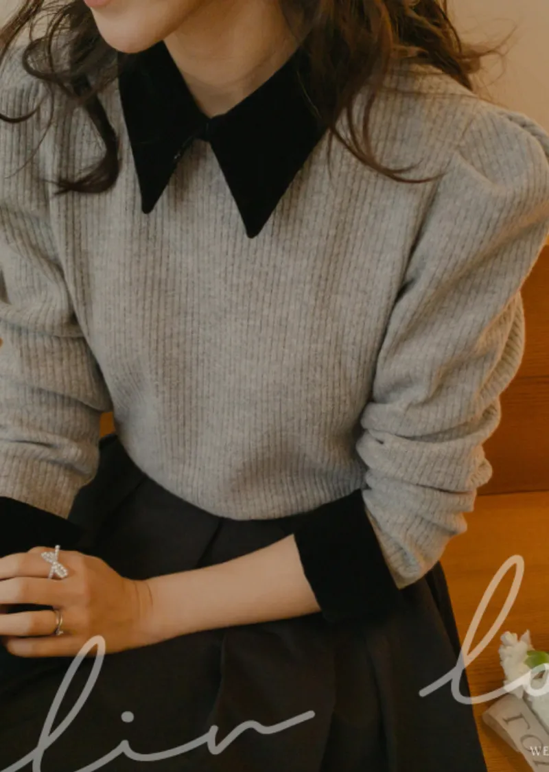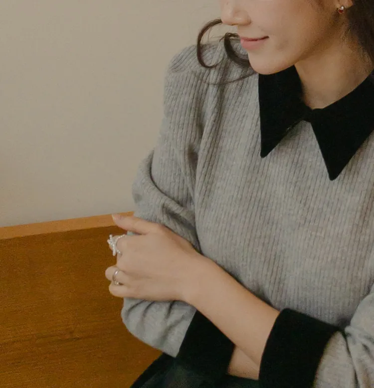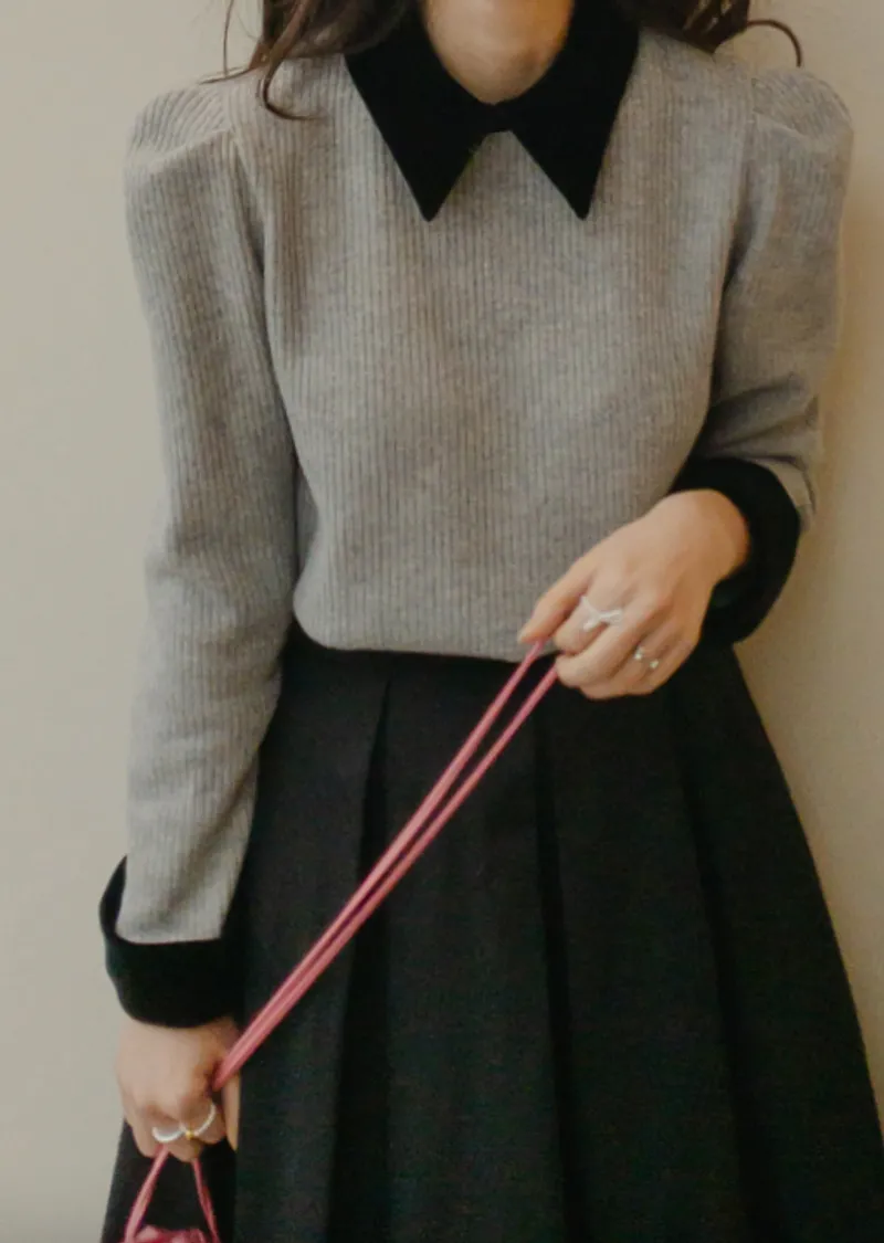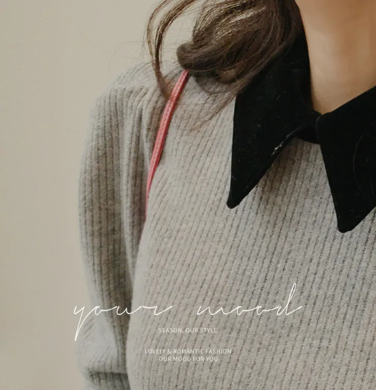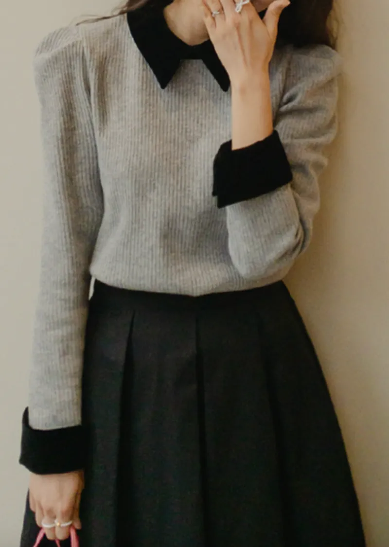 摩登現代感配色天鵝絨領肩線剪裁針織上衣