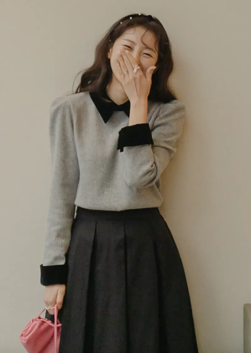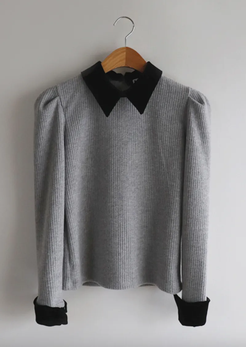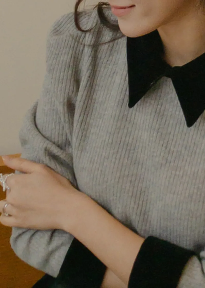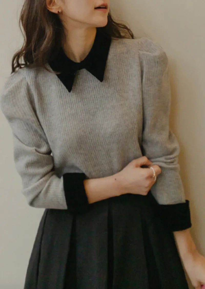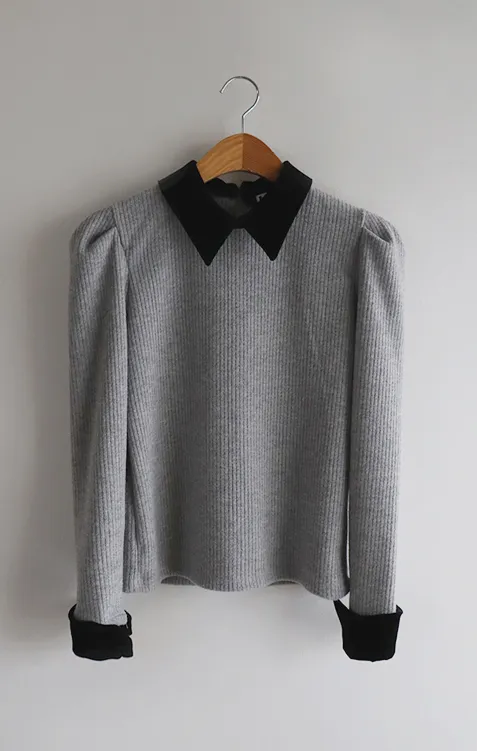 摩登現代感配色天鵝絨領肩線剪裁針織上衣