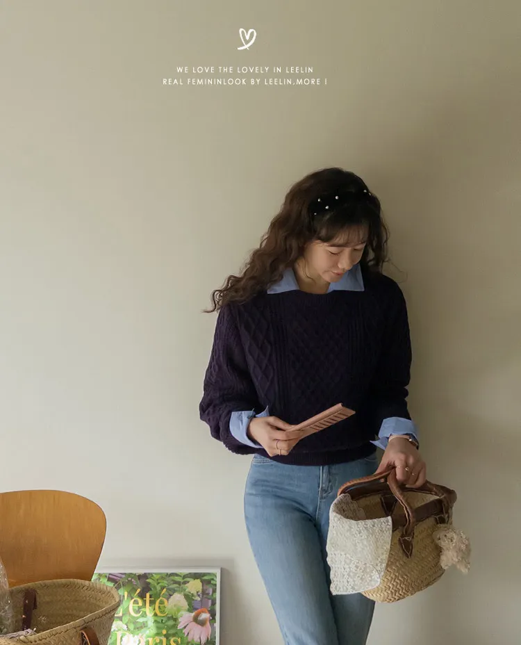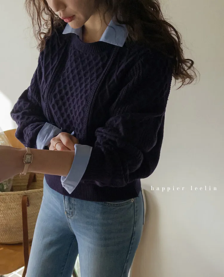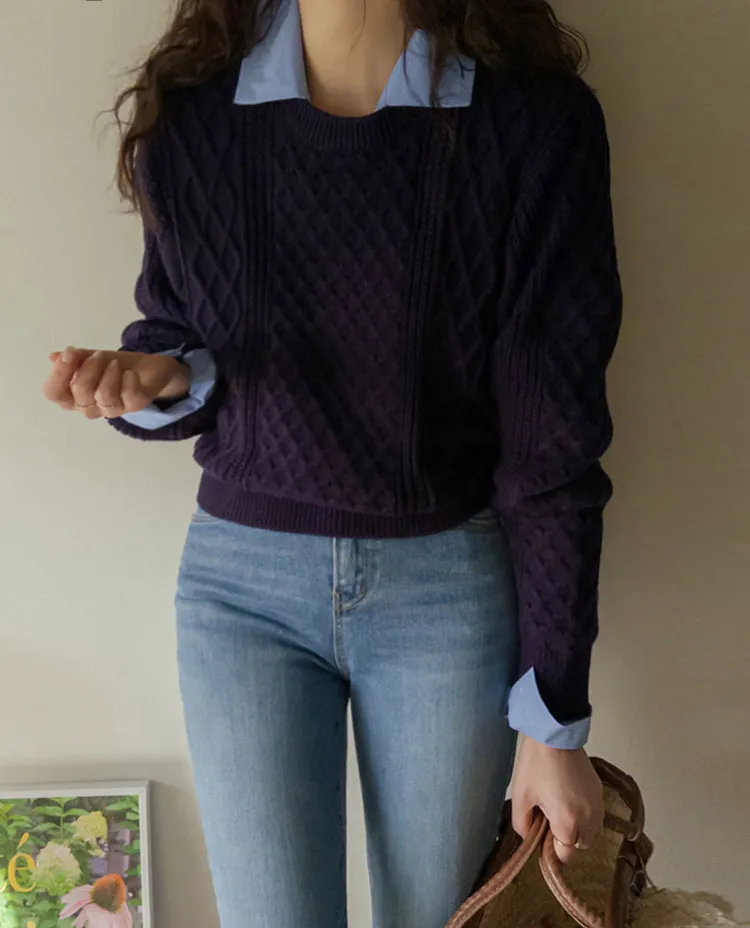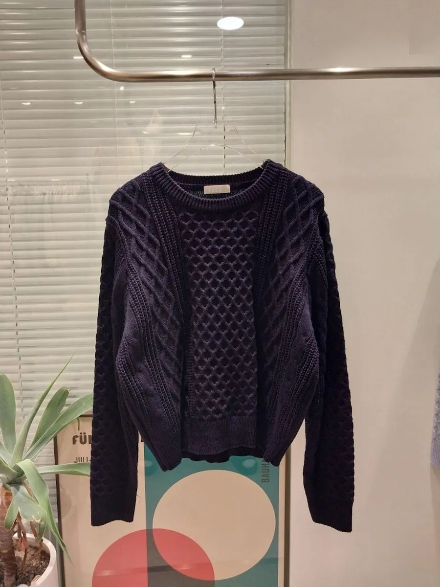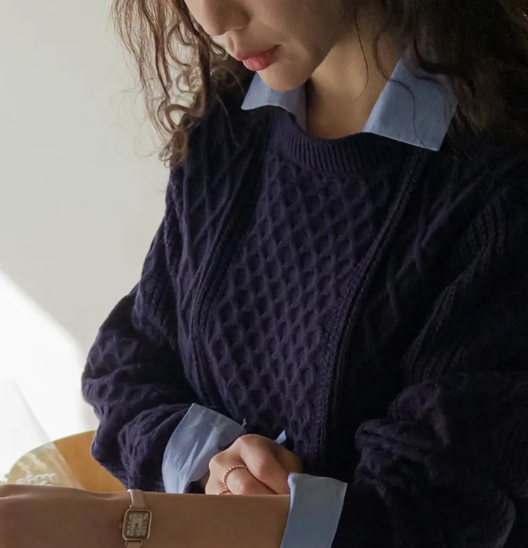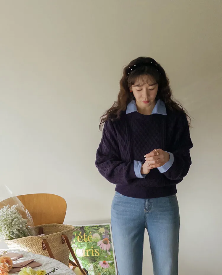 迷人混合編織舒適針織上衣 深藍色穿搭照