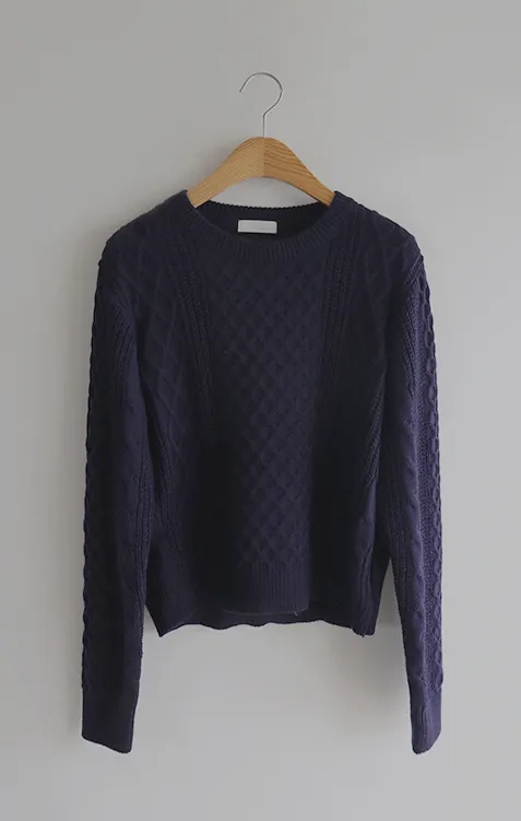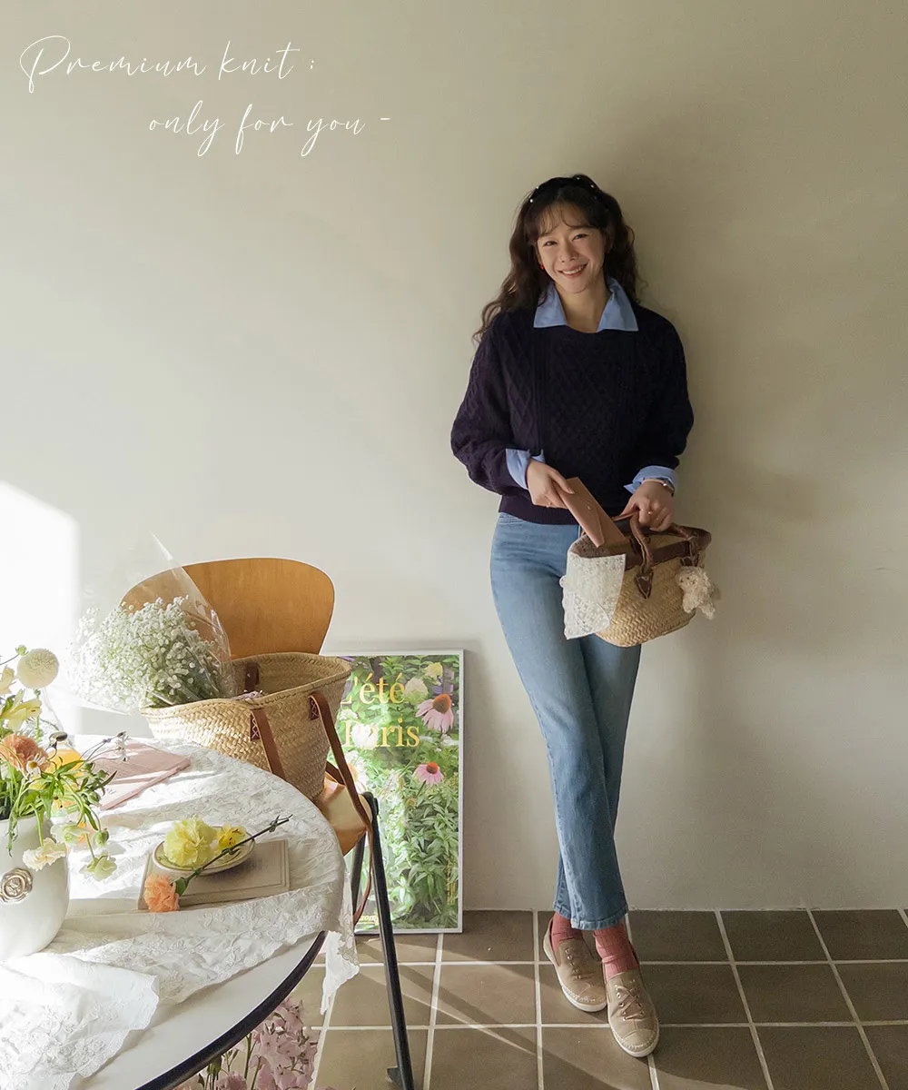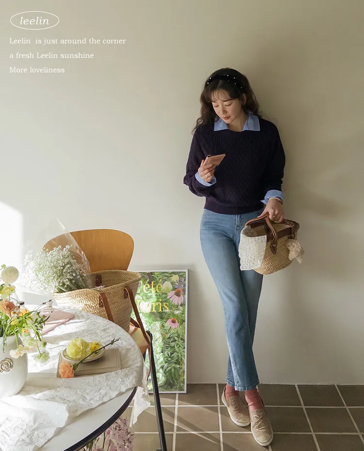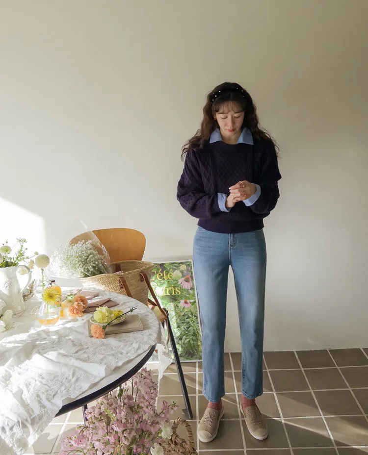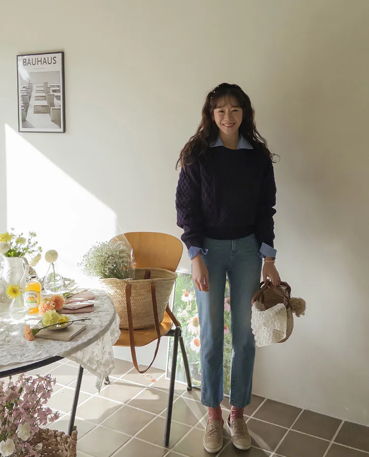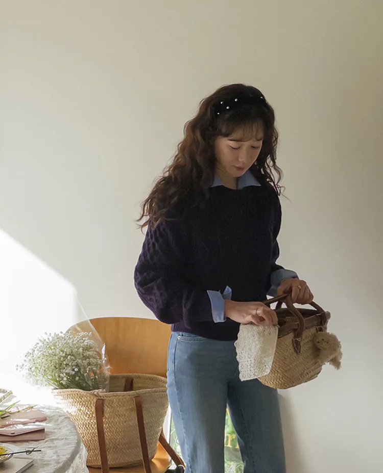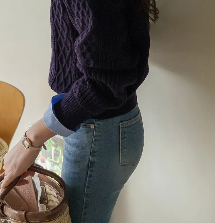 迷人混合編織舒適針織上衣 深藍色穿搭照