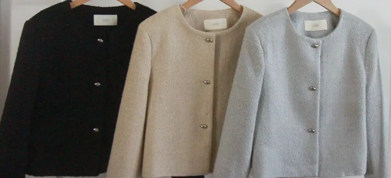 【花呢外套,顏色精緻,珠光感柔和】【銀色圓角鈕扣也很漂亮】【時尚的外套】【營造整體奢華優雅的氛圍】