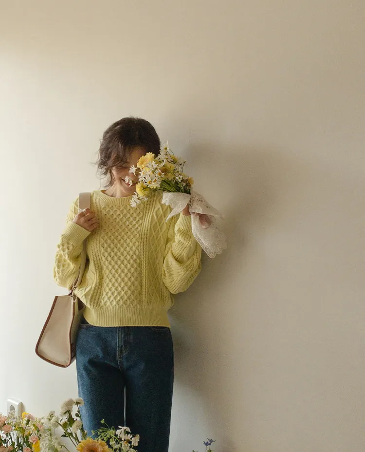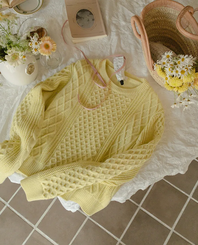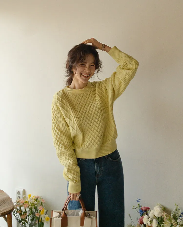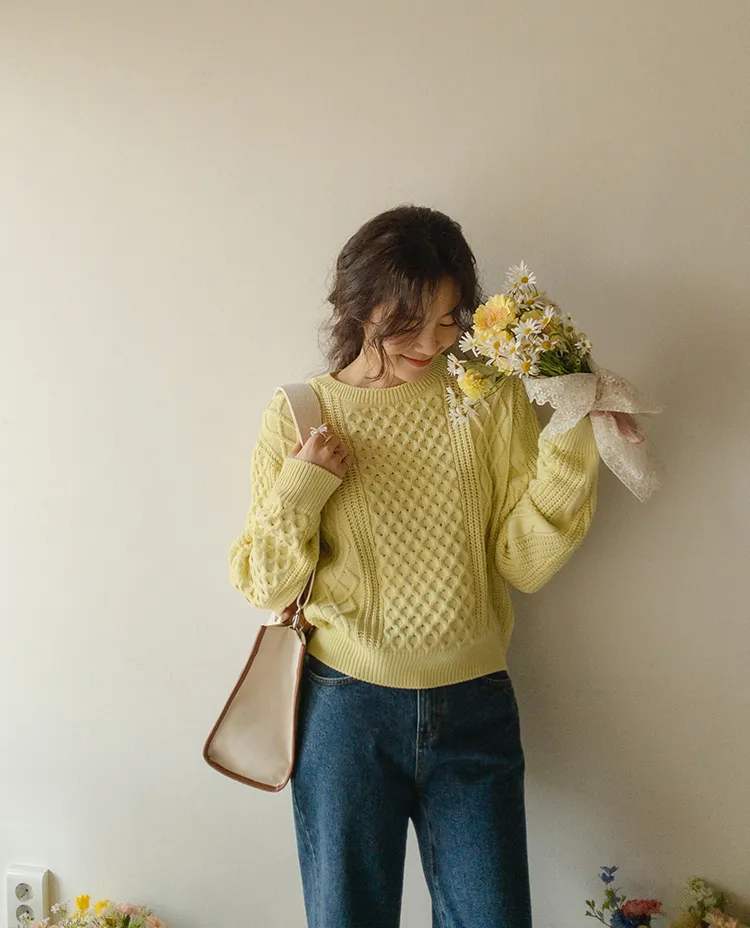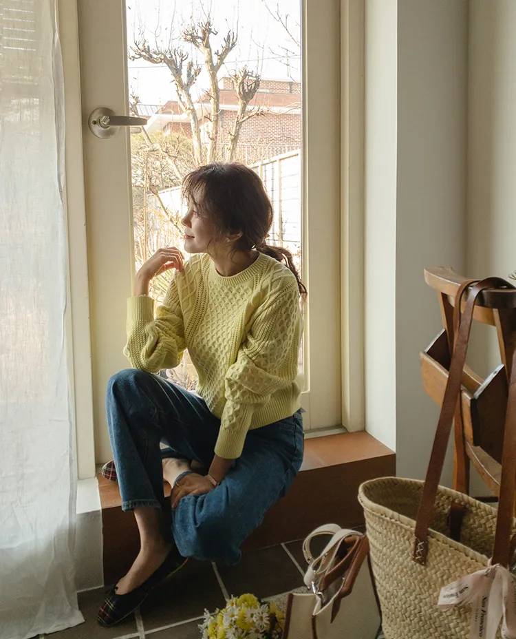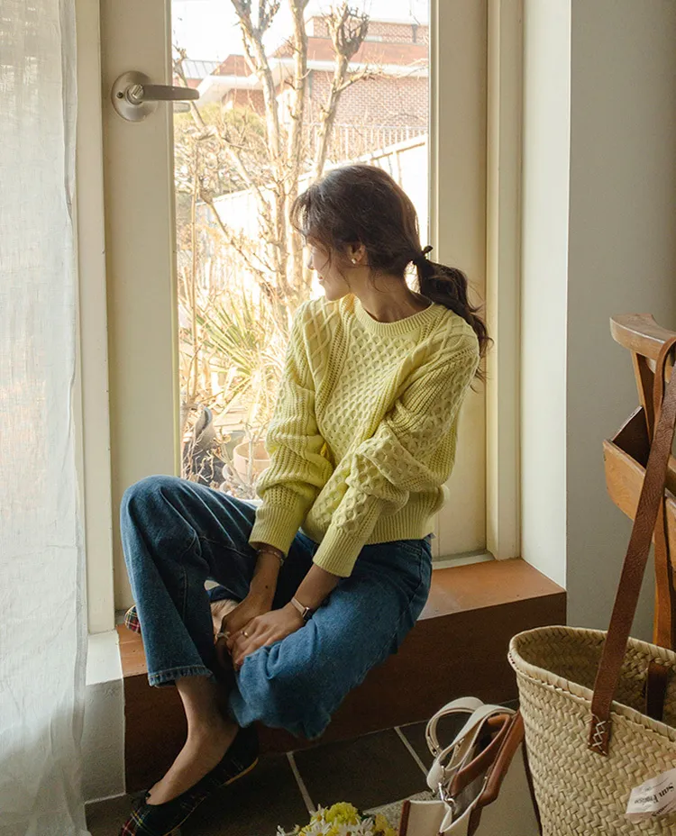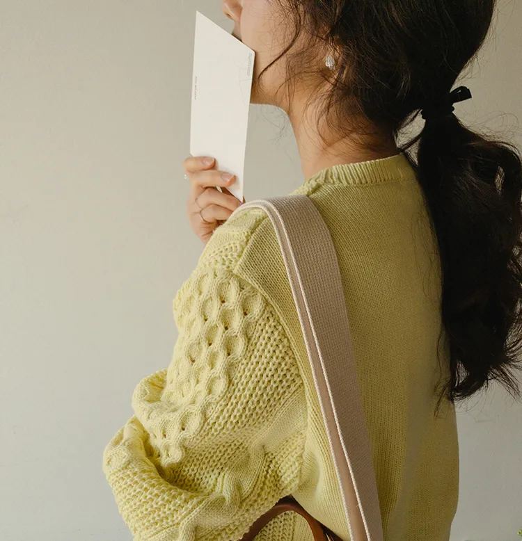 迷人混合編織舒適針織上衣 黃綠色穿搭照